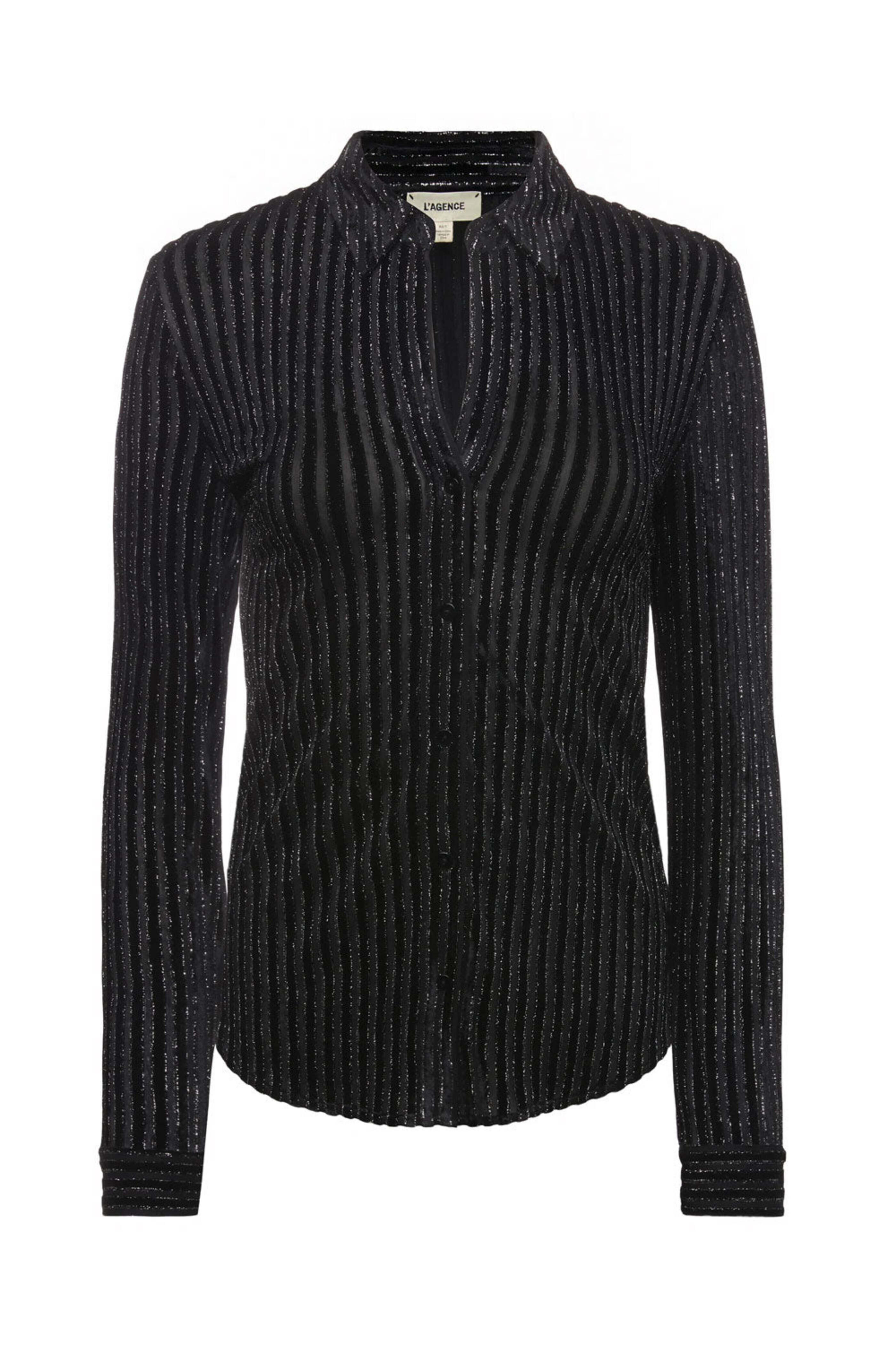 LAgence Black Laurent Velvet Blouse. Collar. Long sleeves; button cuffs. Button up front closure. Shirttail hem. Relaxed fit. Velvet fabrication. 90% polyester, 5% metallic, 5% spandex.