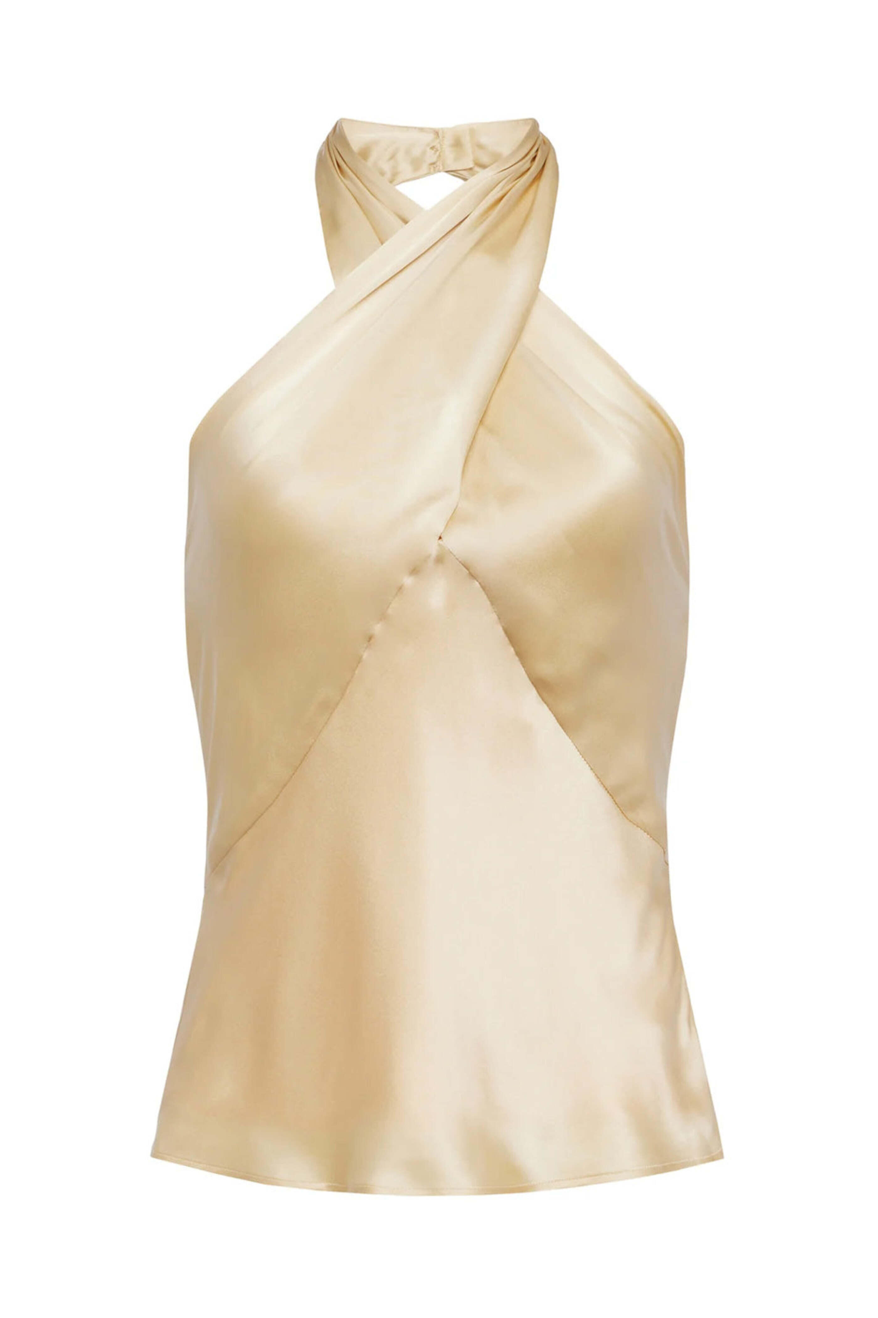 LAgence Marzipan Twist Neck Letitia Top. Twist halter neck; button closure. Open back. Slim silhouette. Bias cut silk fabrication. 100% silk.