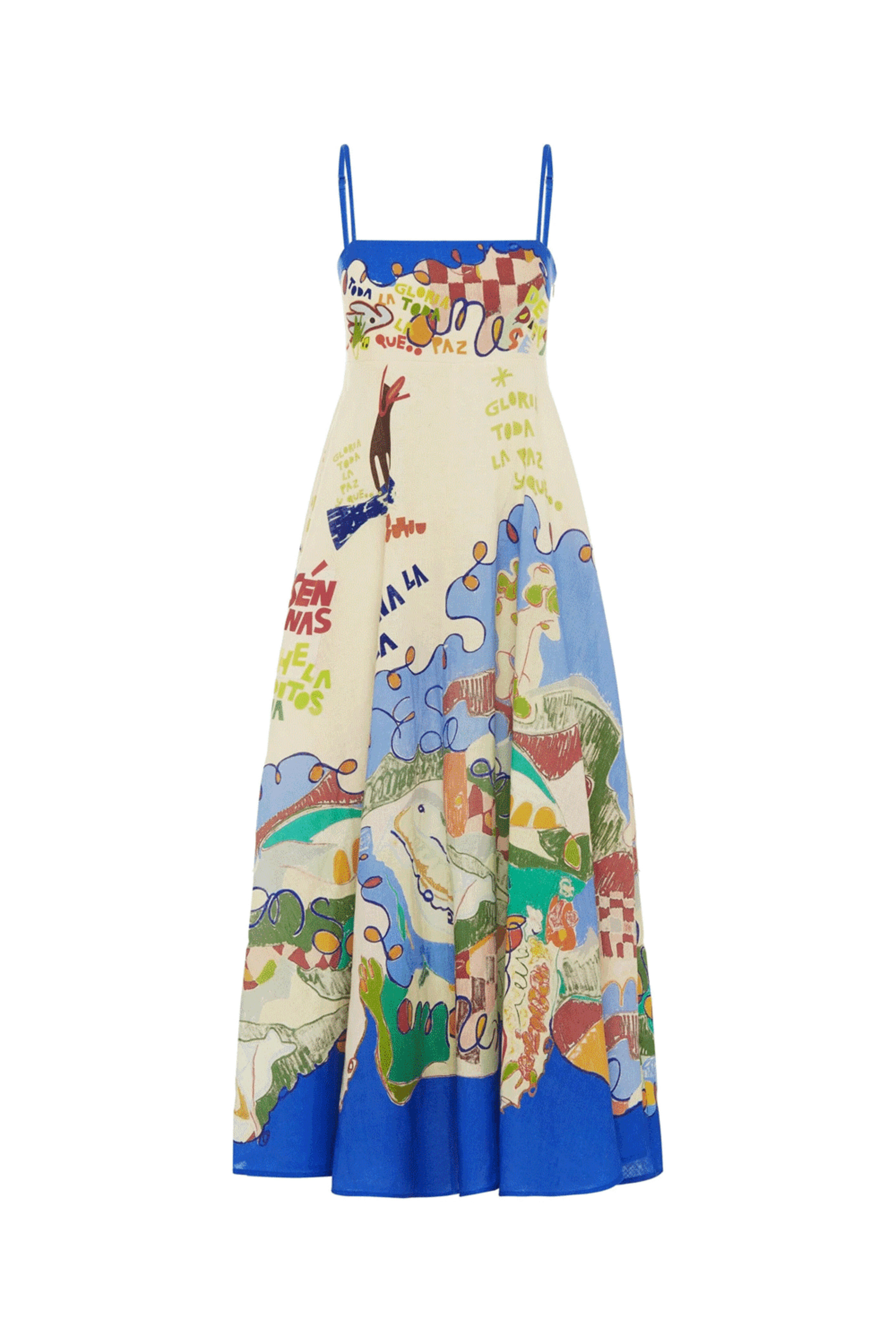 Alemais Multi Nadia Sundress. Square neckline. Sleeveless. Side seam pockets. Full length. Empire waist. Smocked back panel. Invisible side zipper. 100% linen.