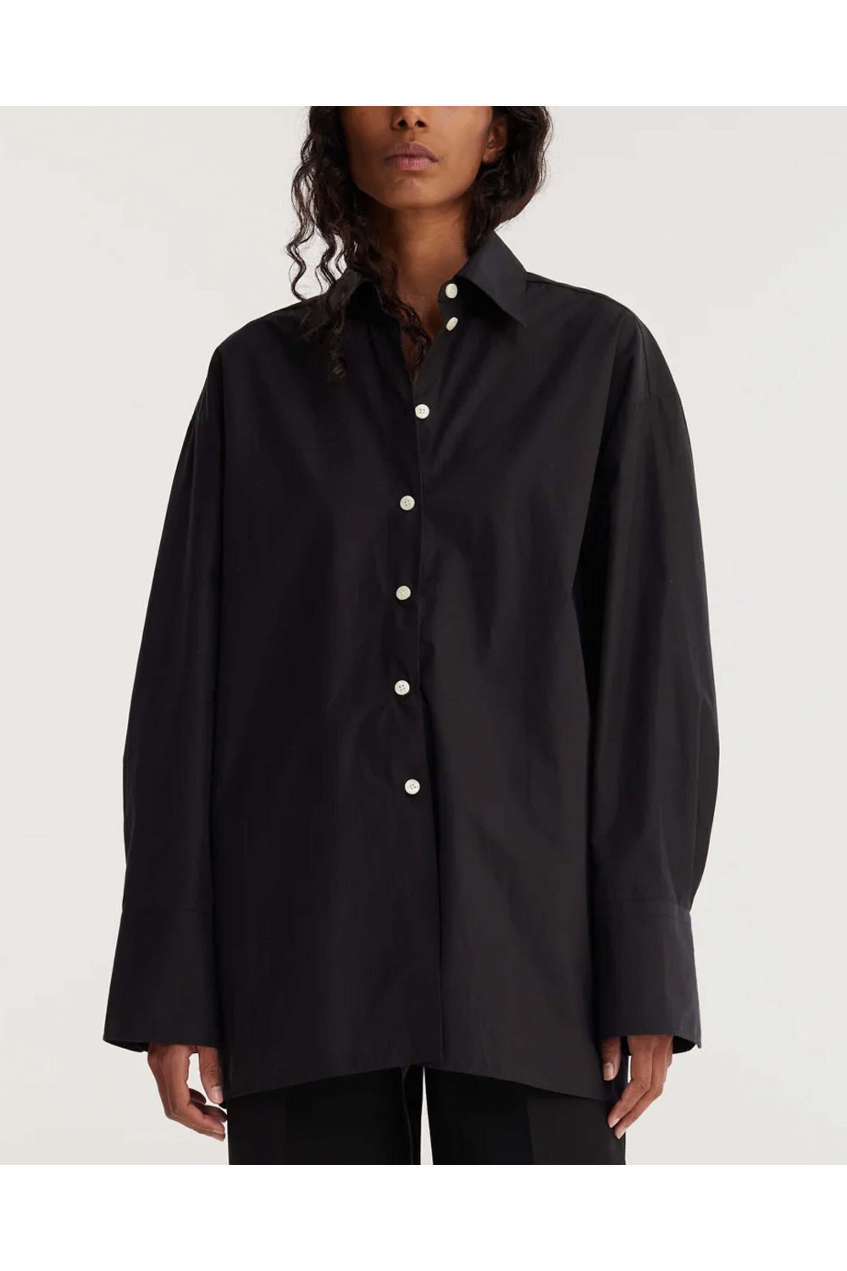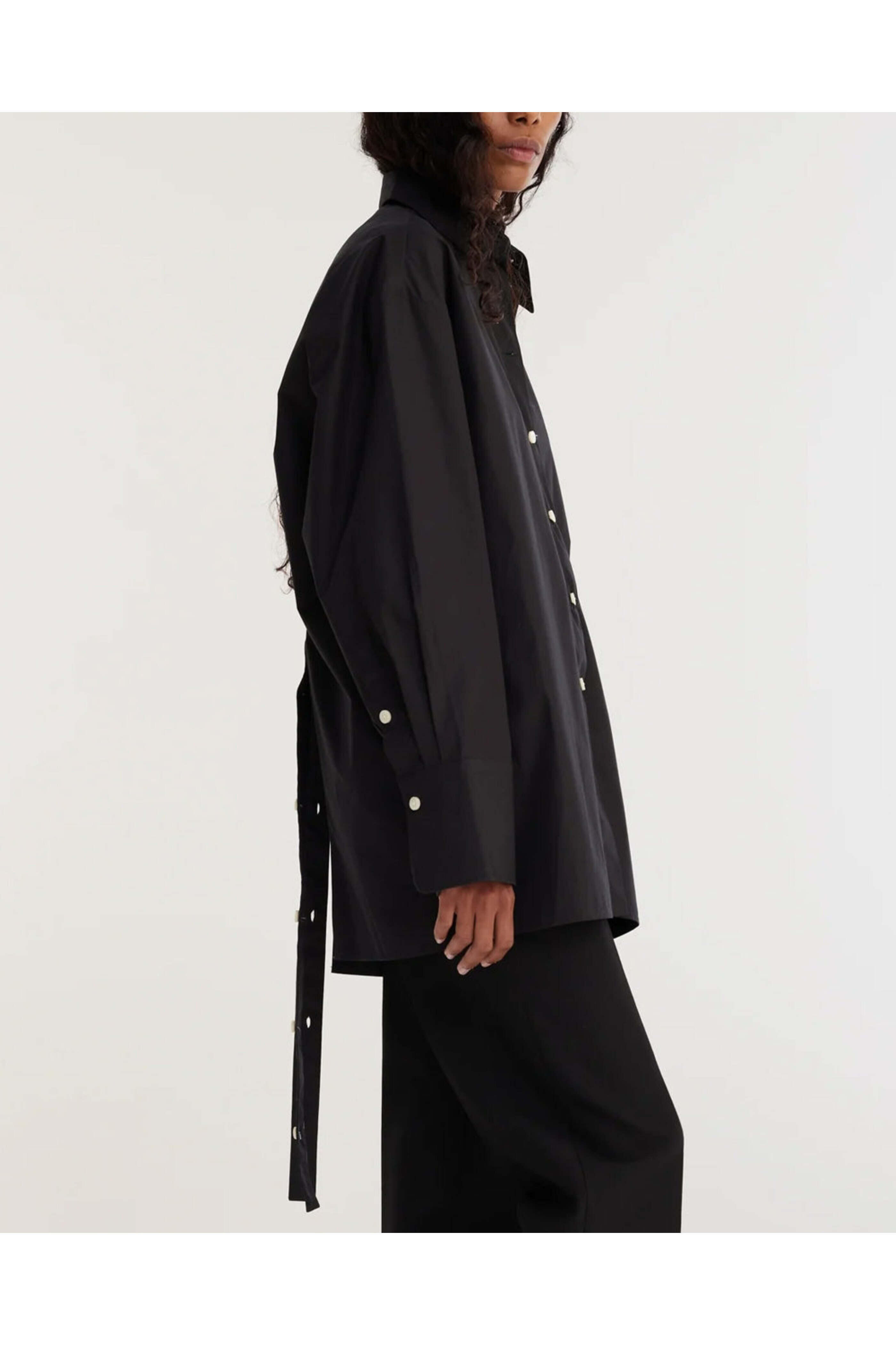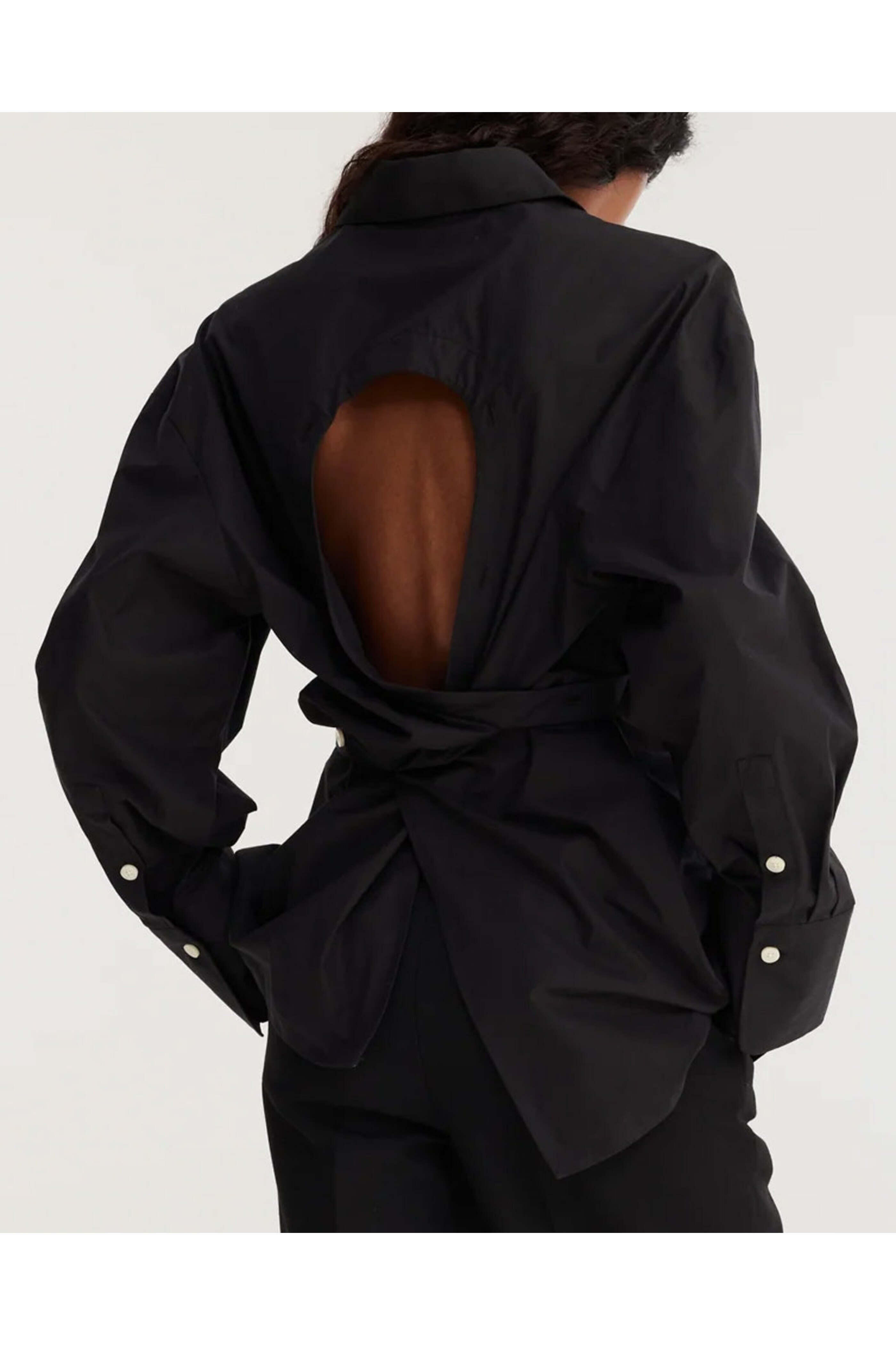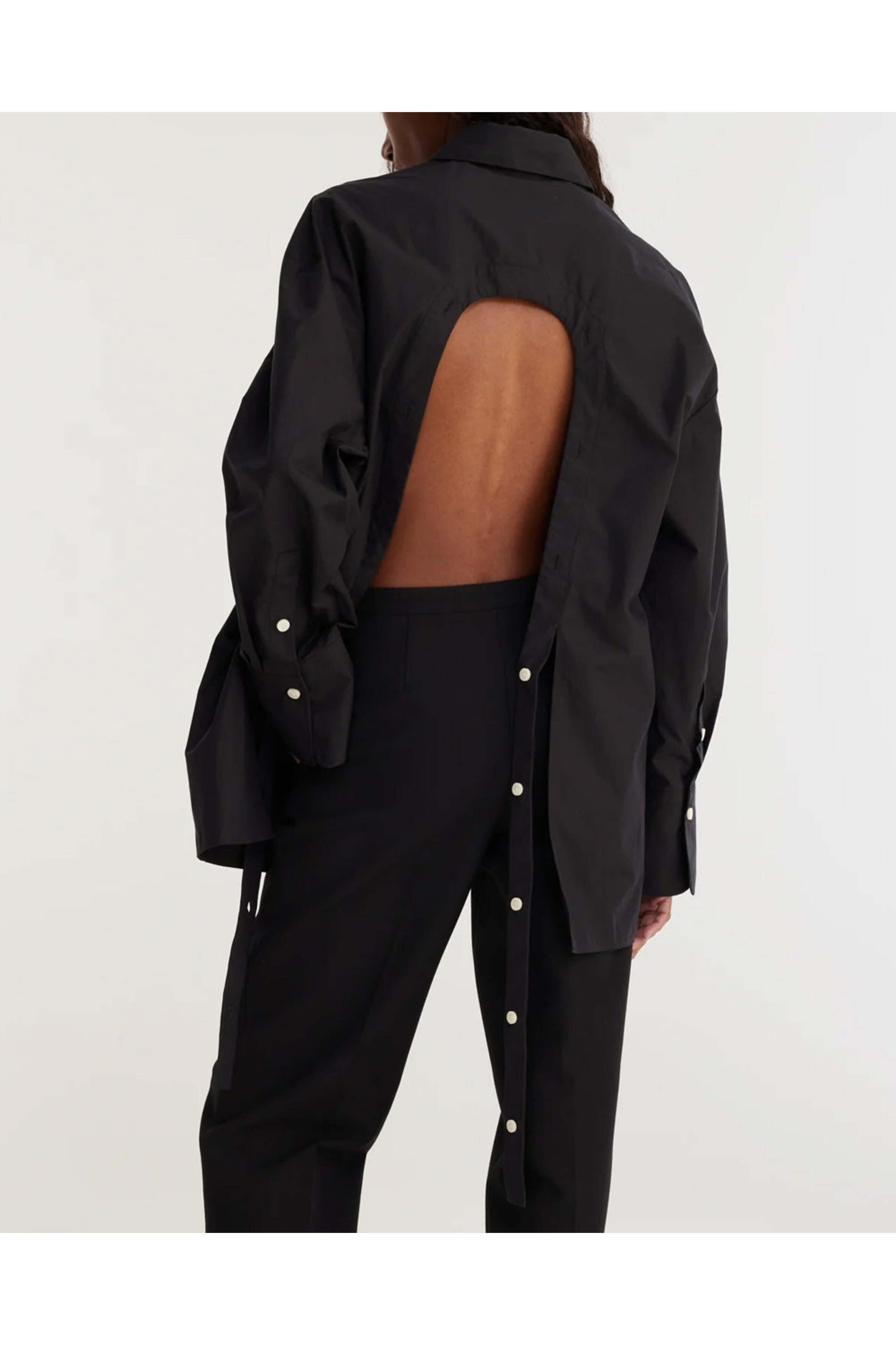 RÃHE Noir Open Black Shirt. Collar. Long sleeves: button cuffs. Button down front closure. Relaxed fit. Back cutout detail; self-tie button straps. Relaxed fit. 100% cotton.