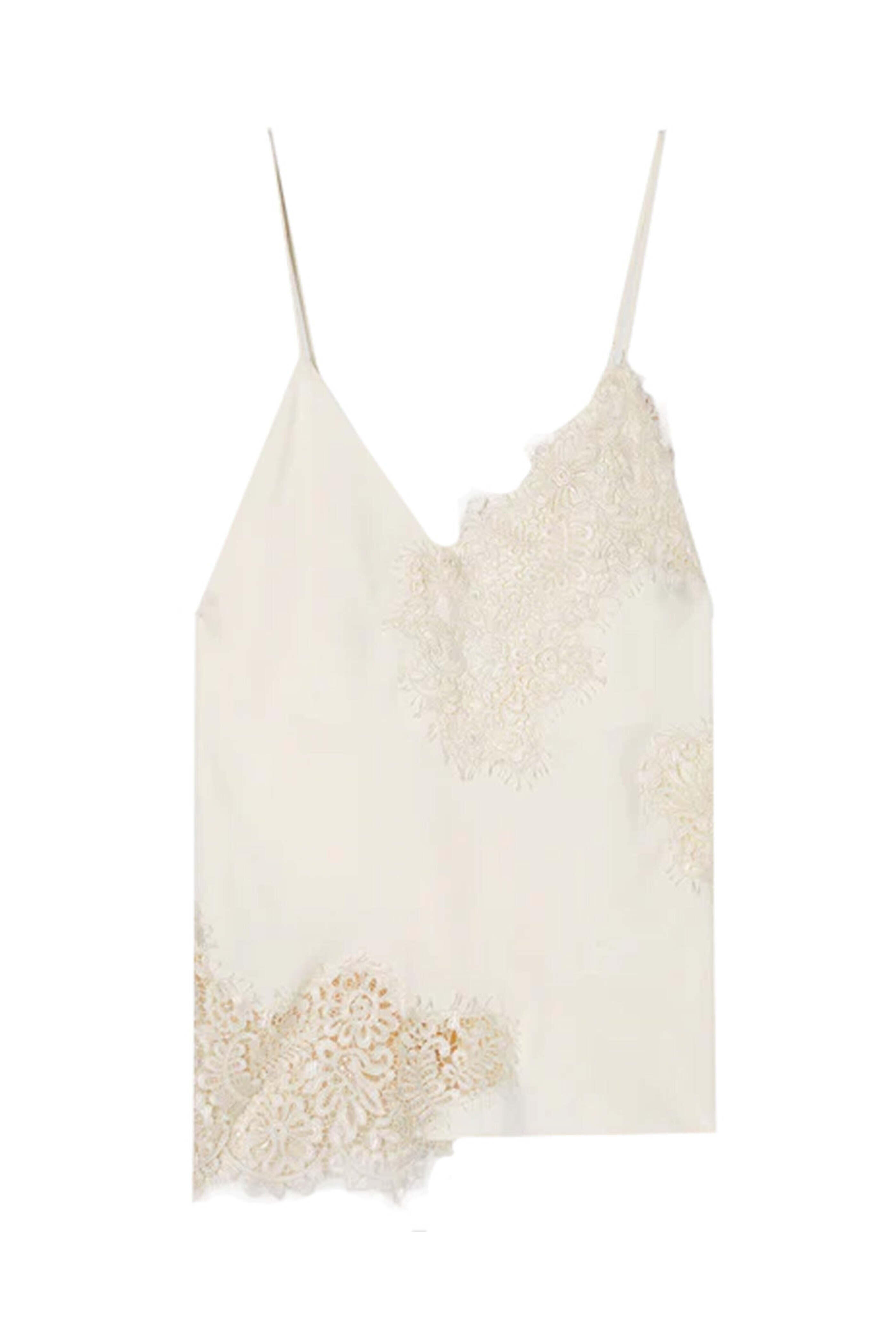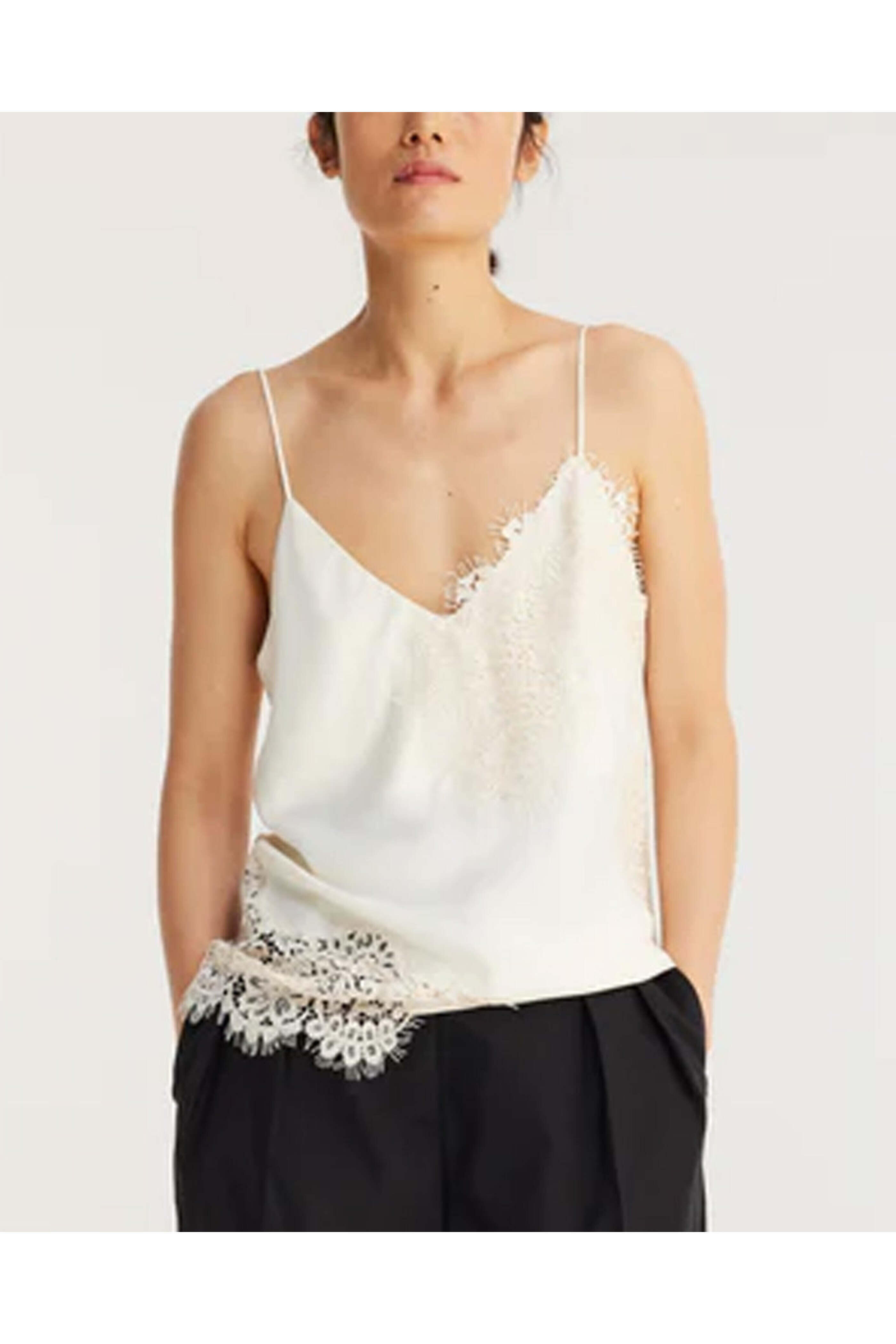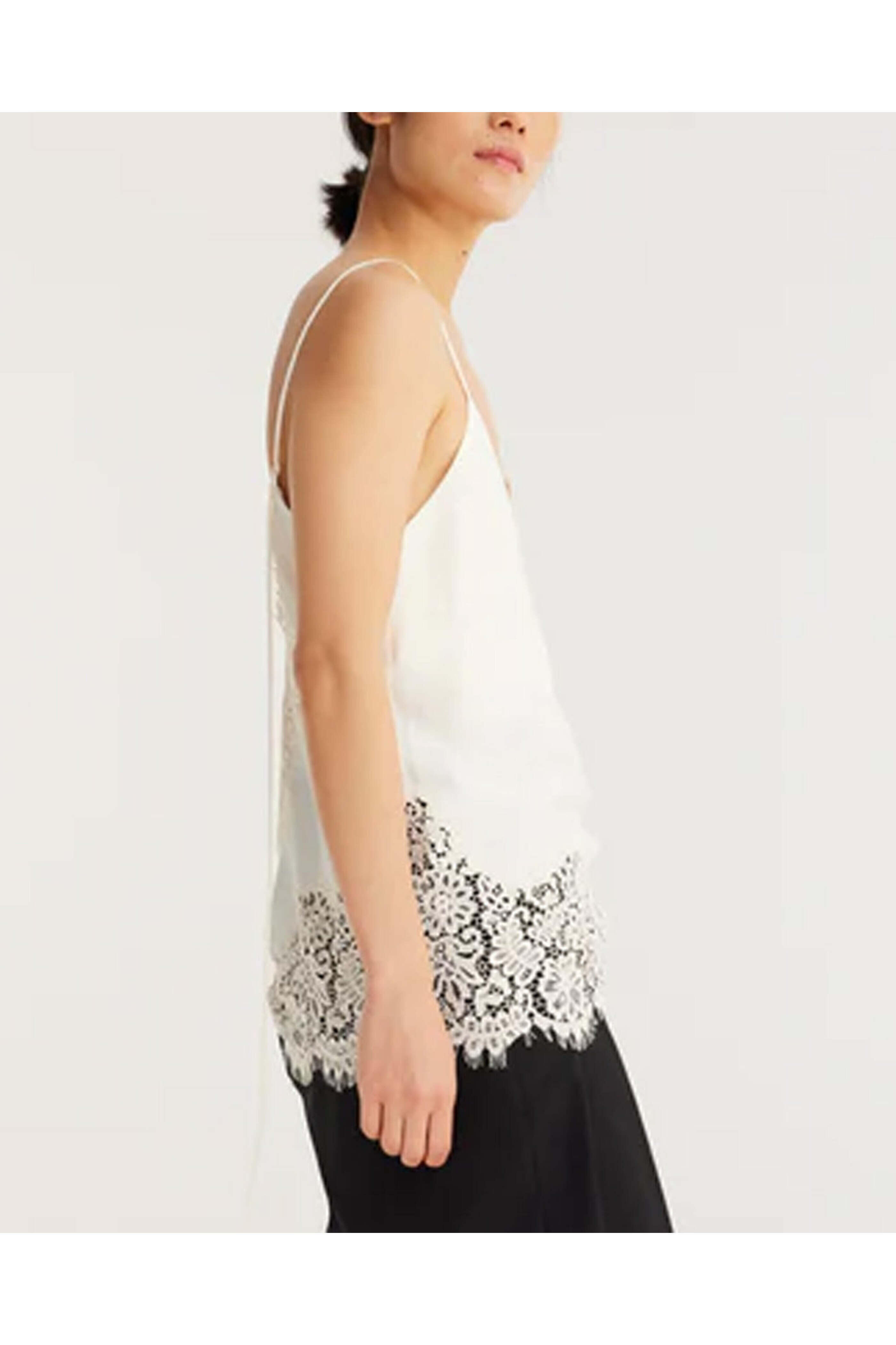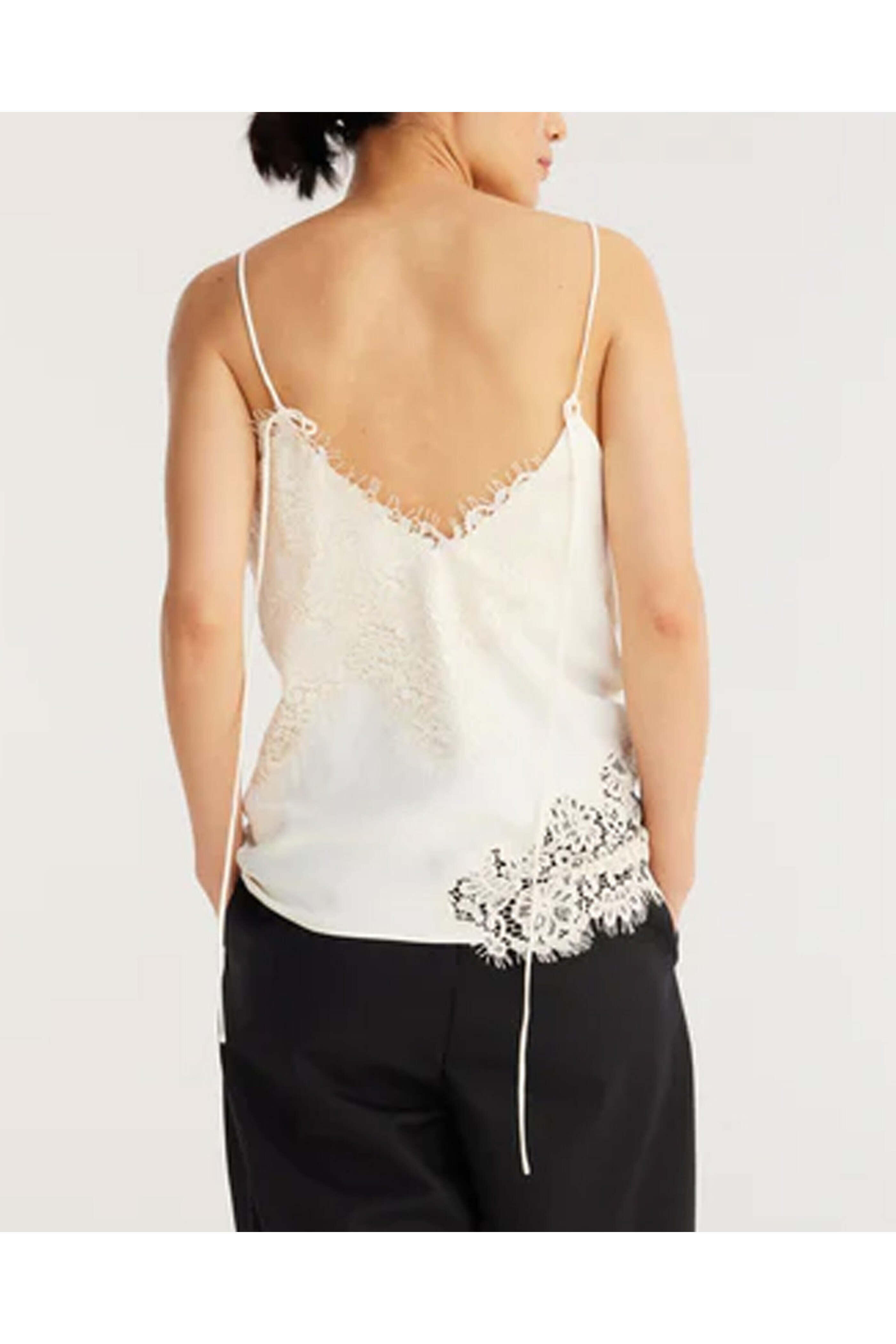 RÃHE Cream Lace Camisole. V neck. V back. Sleeveless; thin adjustable shoulder straps. Relaxed fit. Lace overlayer and trim detail throughout. Satin and lace fabrication. 100% viscose.