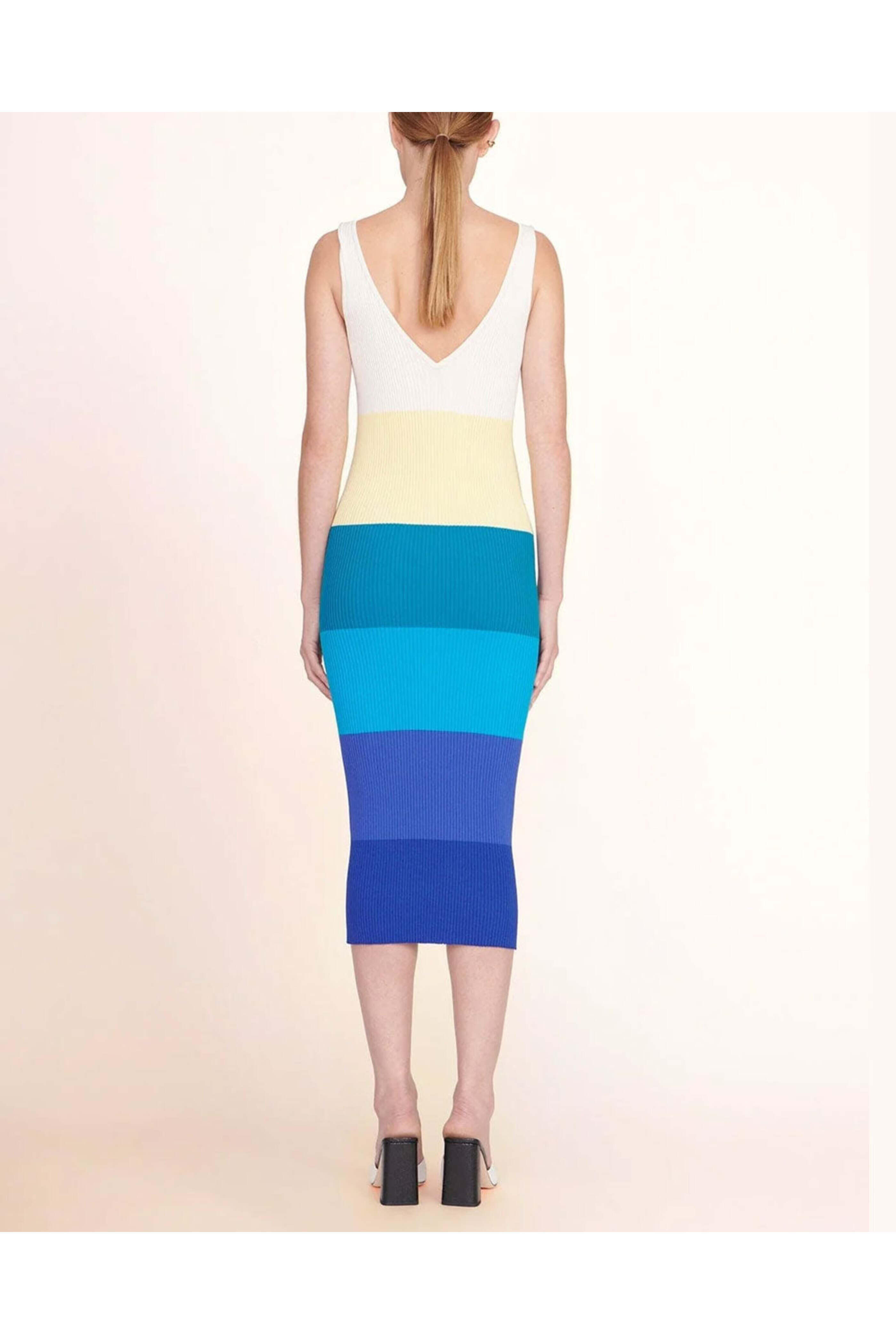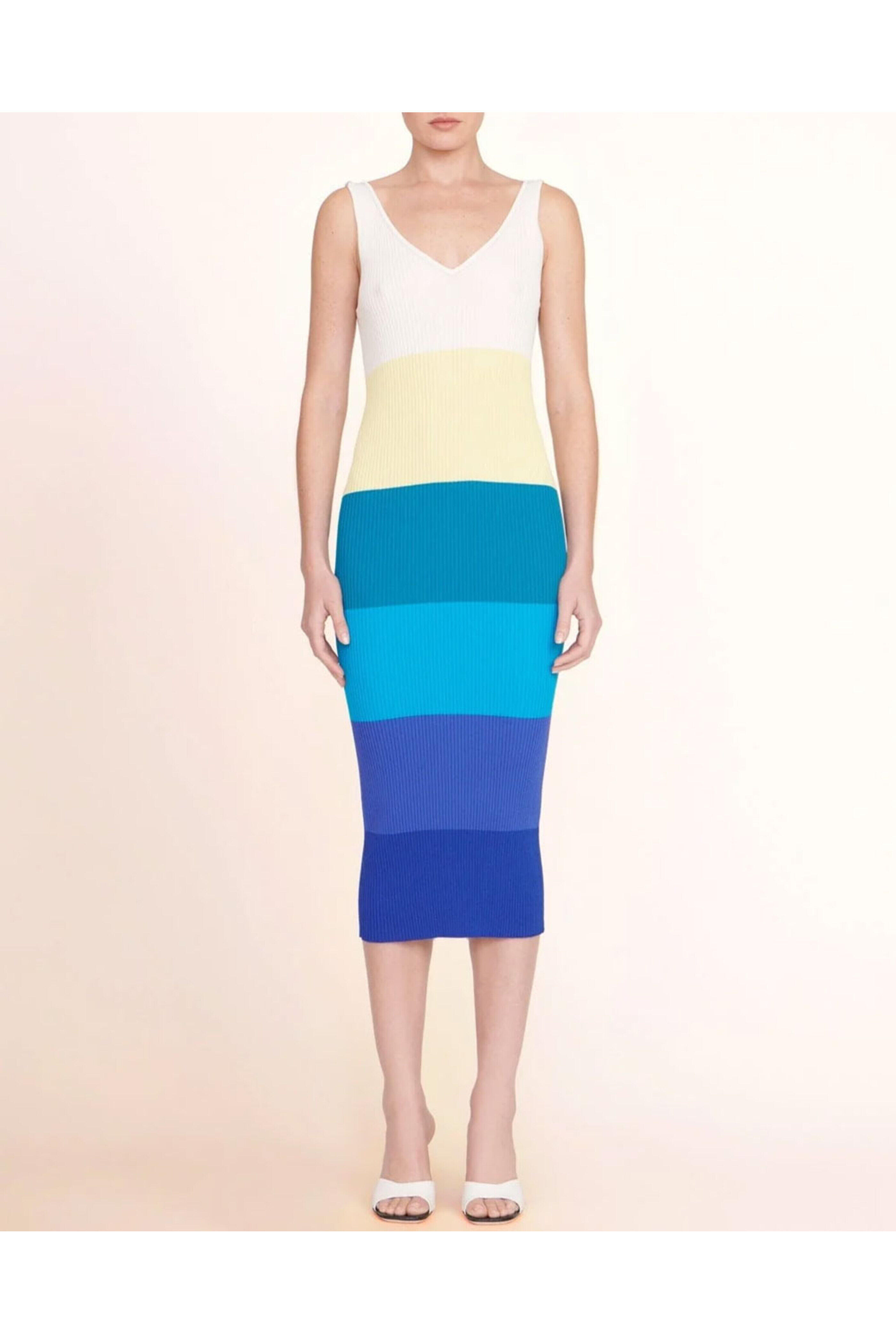 Staud Pacific Star Dana Dress . V neck and back . Sleeveless . Slim fit . Midi . 65% Viscose 35% Nylon.