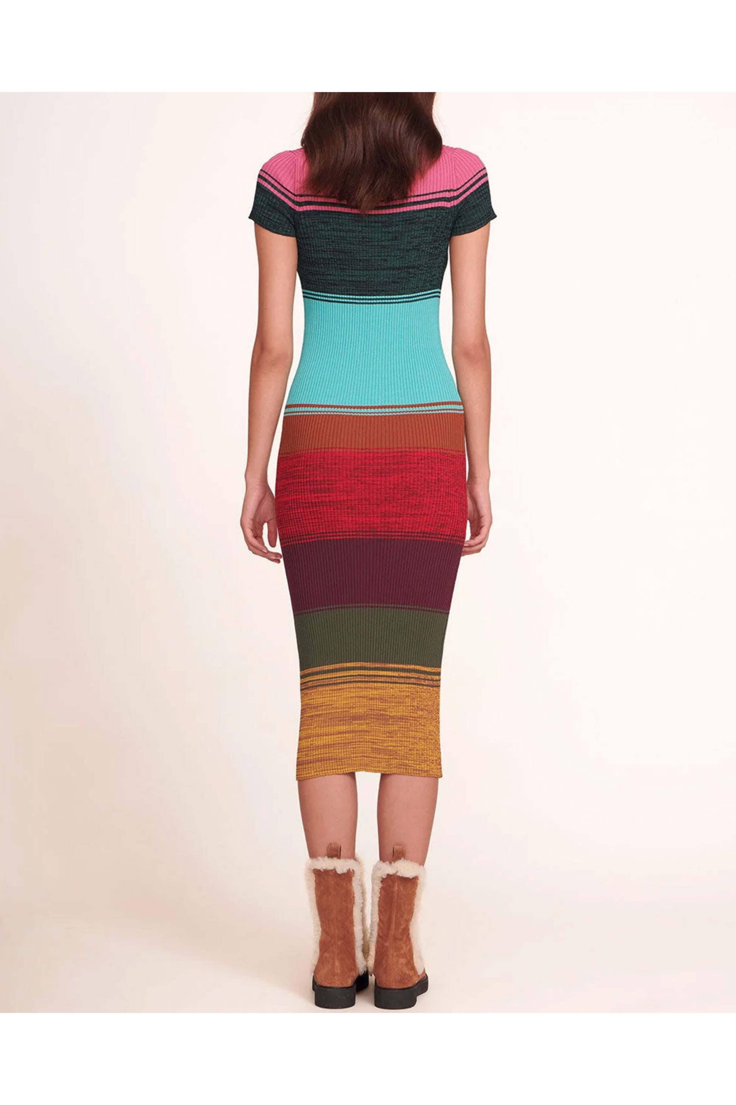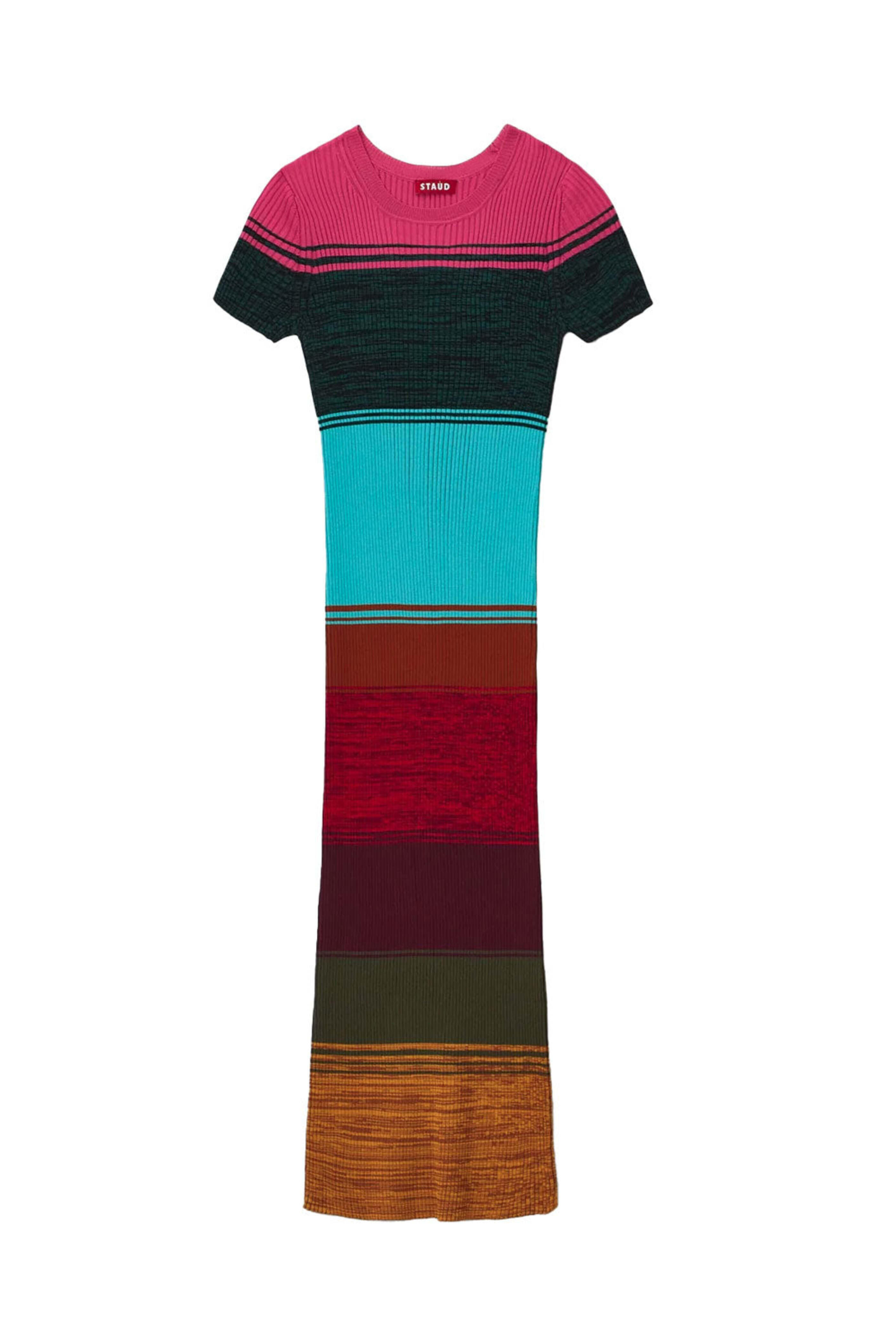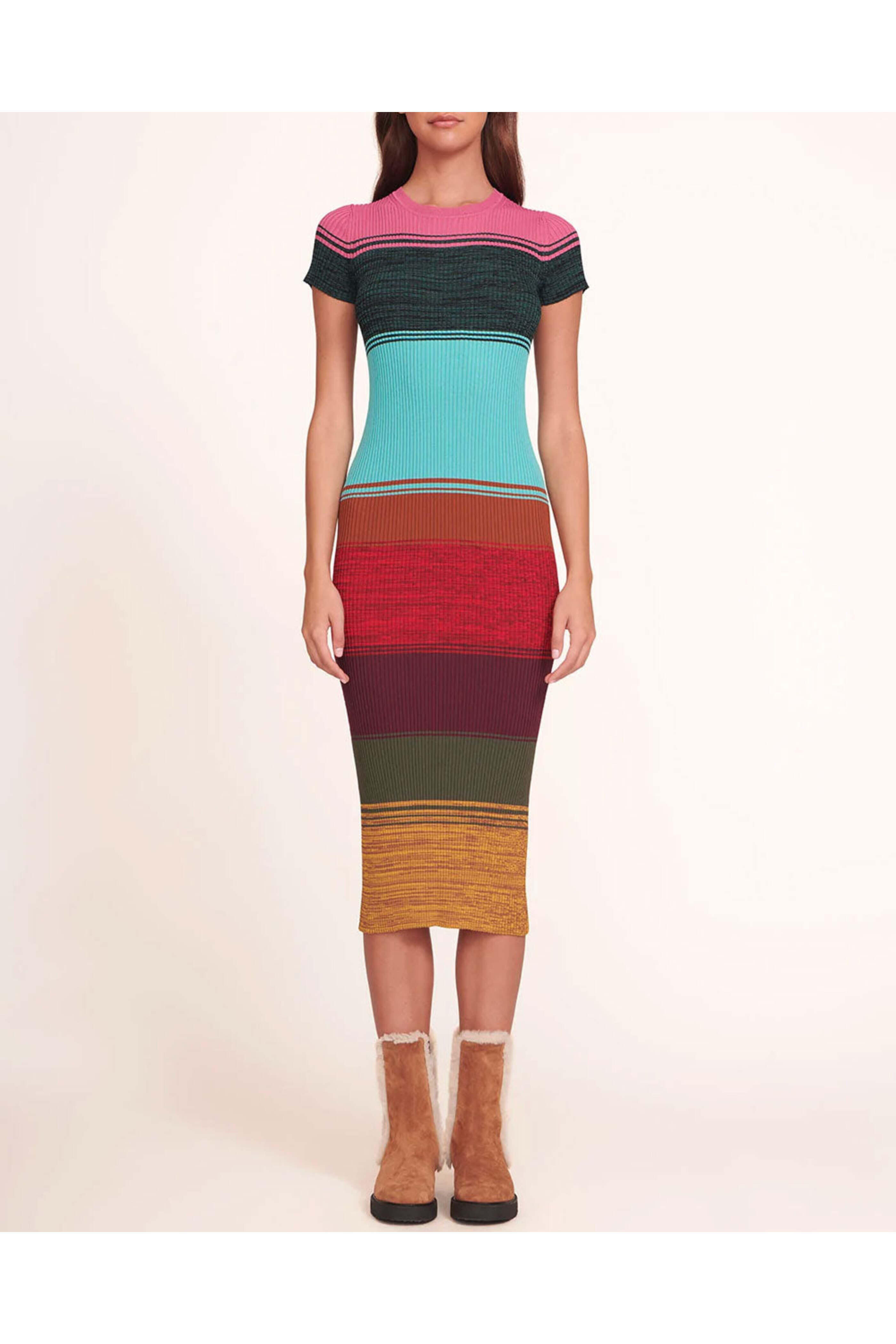 STAUD Mosaic Stripe Colleen Short Sleeve Dress. Crewneck. Short sleeves. Midi length. Slim fit. Rib knit fabrication. 65% Viscose, 35% Nylon.