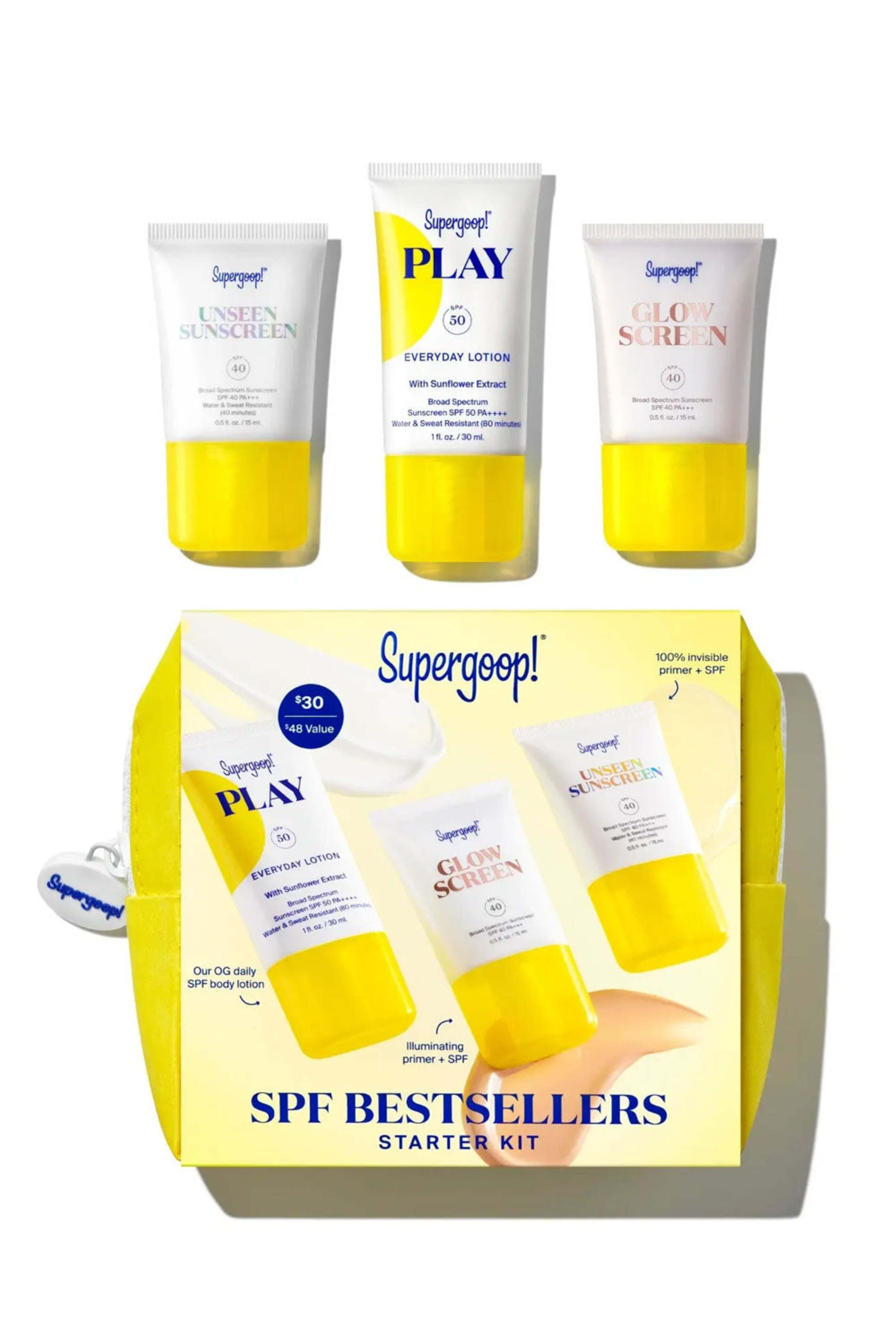 Supergoop! Bestsellers Starter Kit. A trio of bestsellers to create your SPF skincare lineup featuring our OG clean SPF lotion, our invisible #1 bestseller and our glowy fan fave for head-to-toe protection. Clean chemical. All skin types. Unseen sunscreen SPF 40. Play everyday lotion SPF 50. Our original broad spectrum SPF 50 lotion for face and body. Glowscreen SPF 40 in sunrise. A daily primer with SPF protection that leaves a dewy, glowy finish and preps skin for makeup, with major hydration. 0.5 fl. oz. / 15 ml. Unseen Sunscreen SPF 40. 1 fl. oz. / 30 ml. PLAY Everyday Lotion SPF 50 with Sunflower Extract. 0.5 fl. oz. / 15 ml. Glowscreen SPF 40 in Sunrise. SPF Bestsellers Starter Kit Bag. The original, 100% invisible, weightless, scentless sunscreen with skincare benefits and a velvety finish.