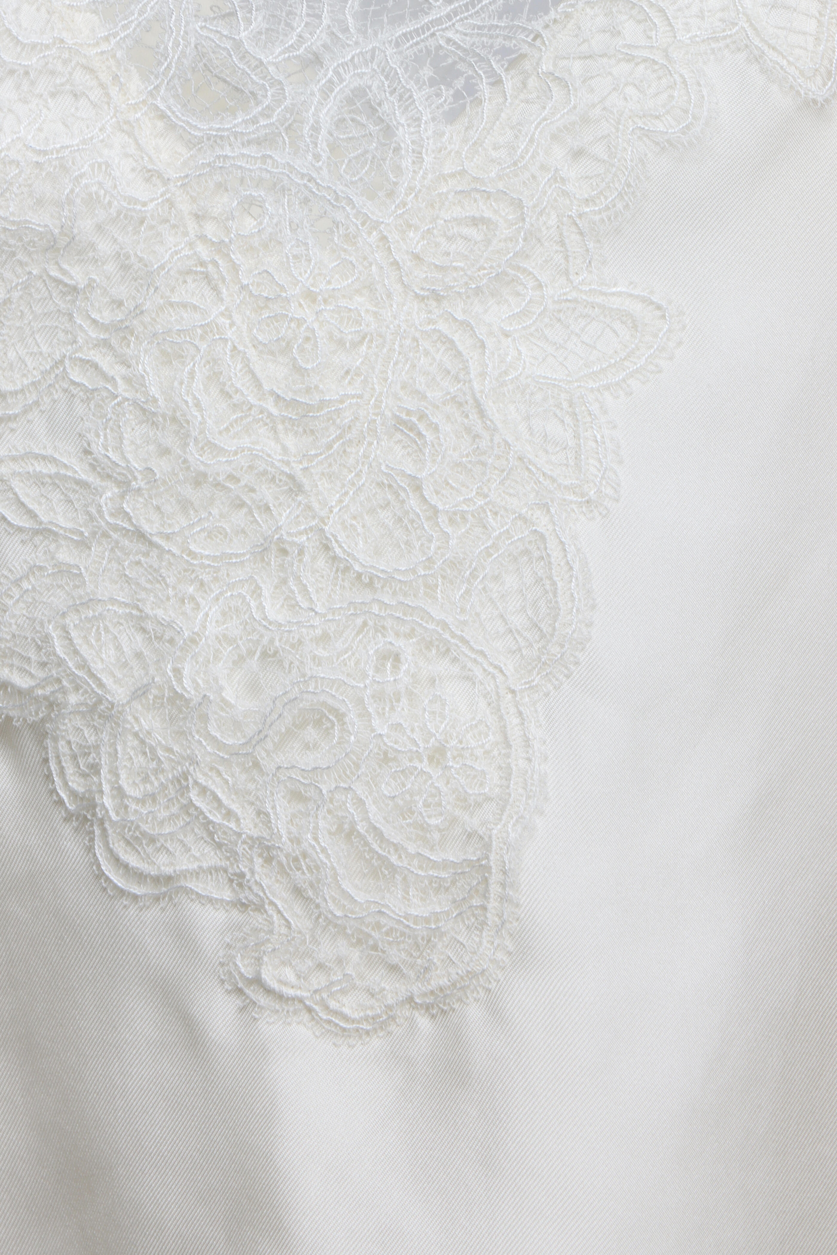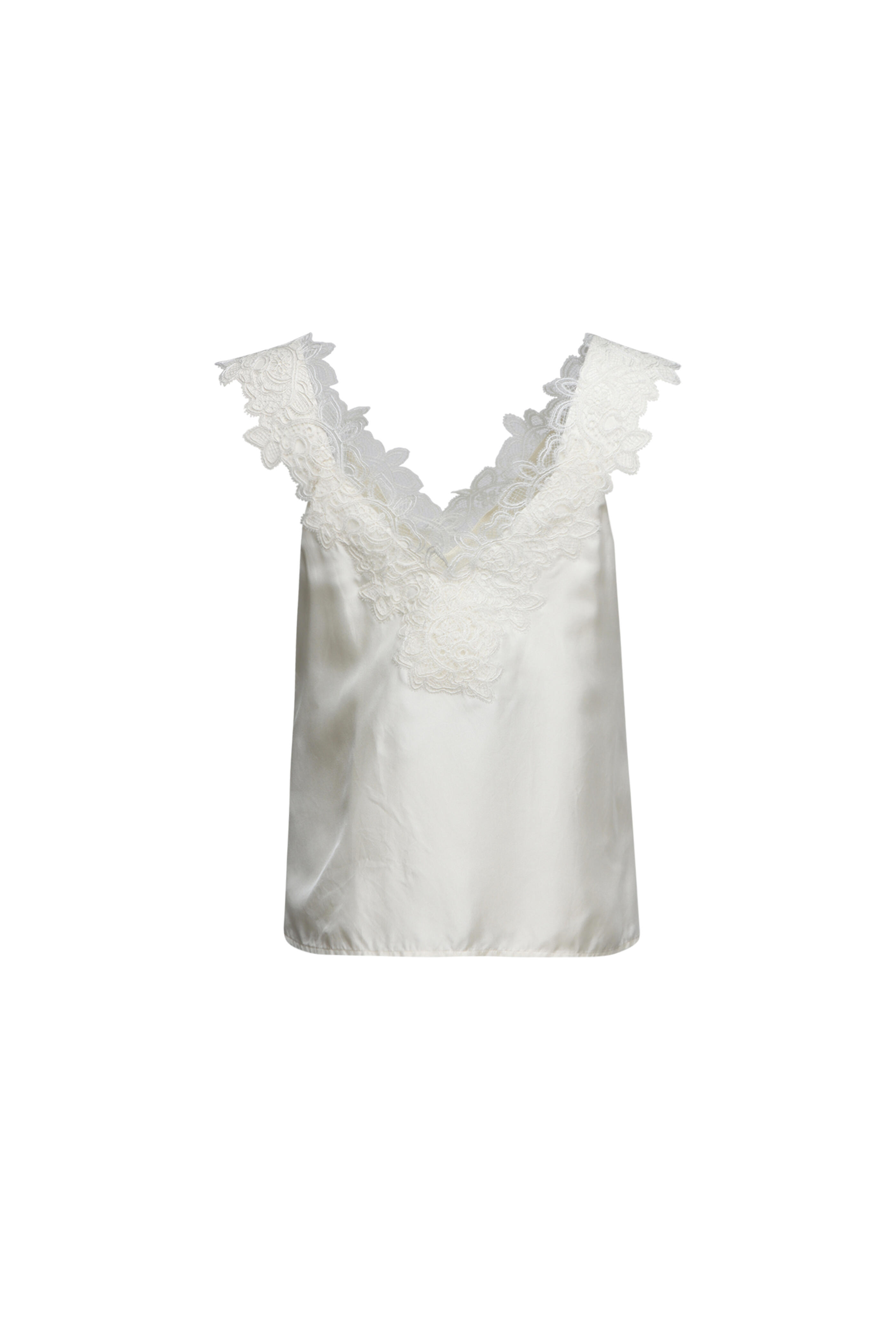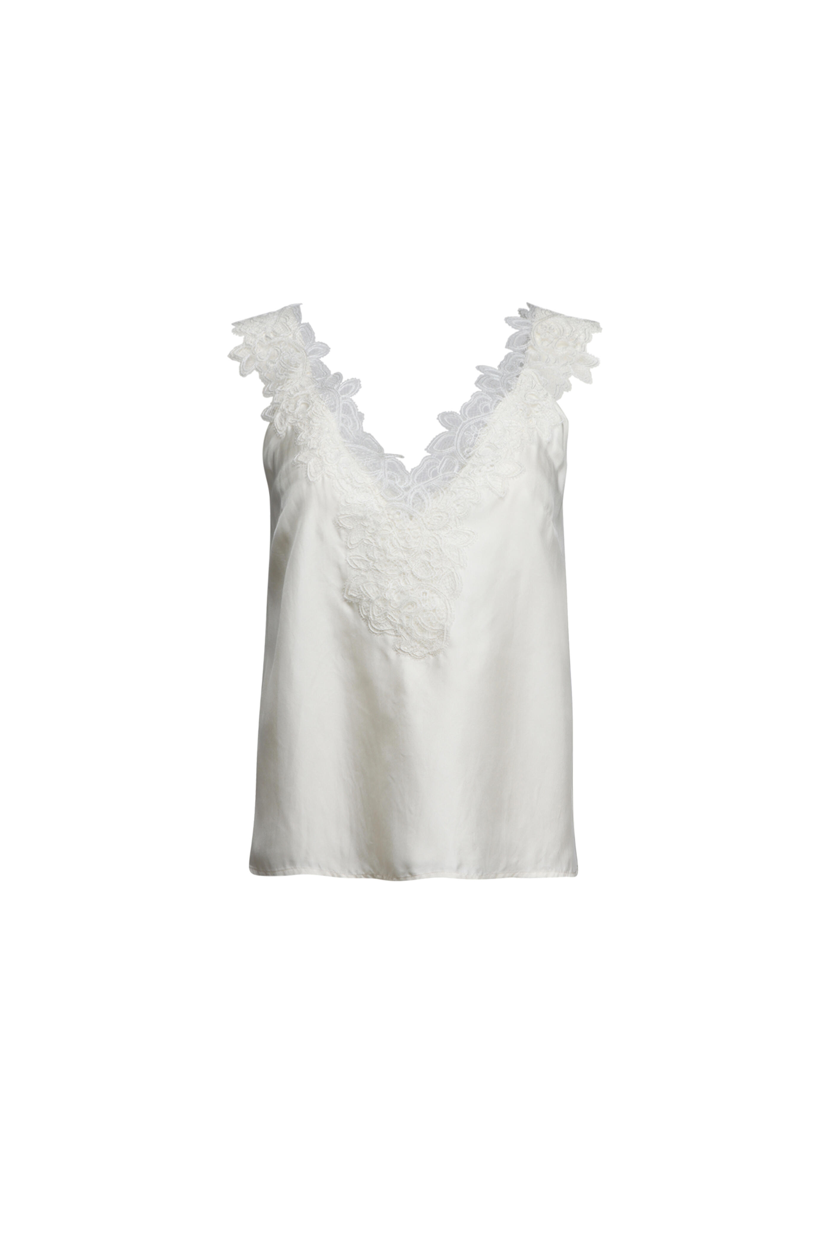 V neck. V back. Relaxed fit. Lace detail. Imported. 100% silk. Dry clean.