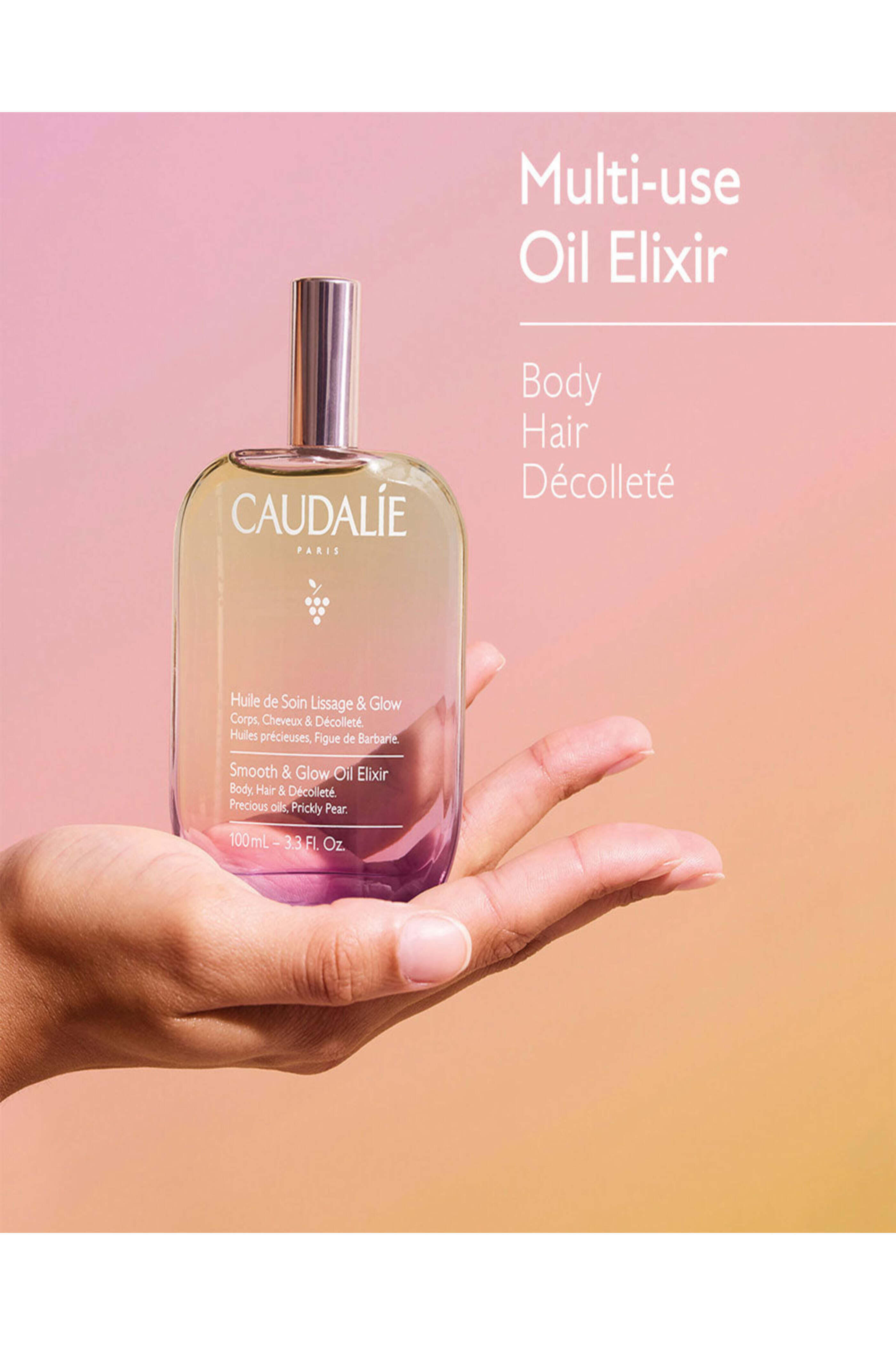 Caudalie Smooth and Glow Oil Elixir. An intensely moisturizing and lightweight body oil that ydrates and visibly smooths skin with a blend of prickly pear, grape seed, and argan oils. Leaves skin feeling nourished, smooth, and delicately scented. Can also be used on hair. Vegan, gluten free, and cruelty free. 4 fl oz.