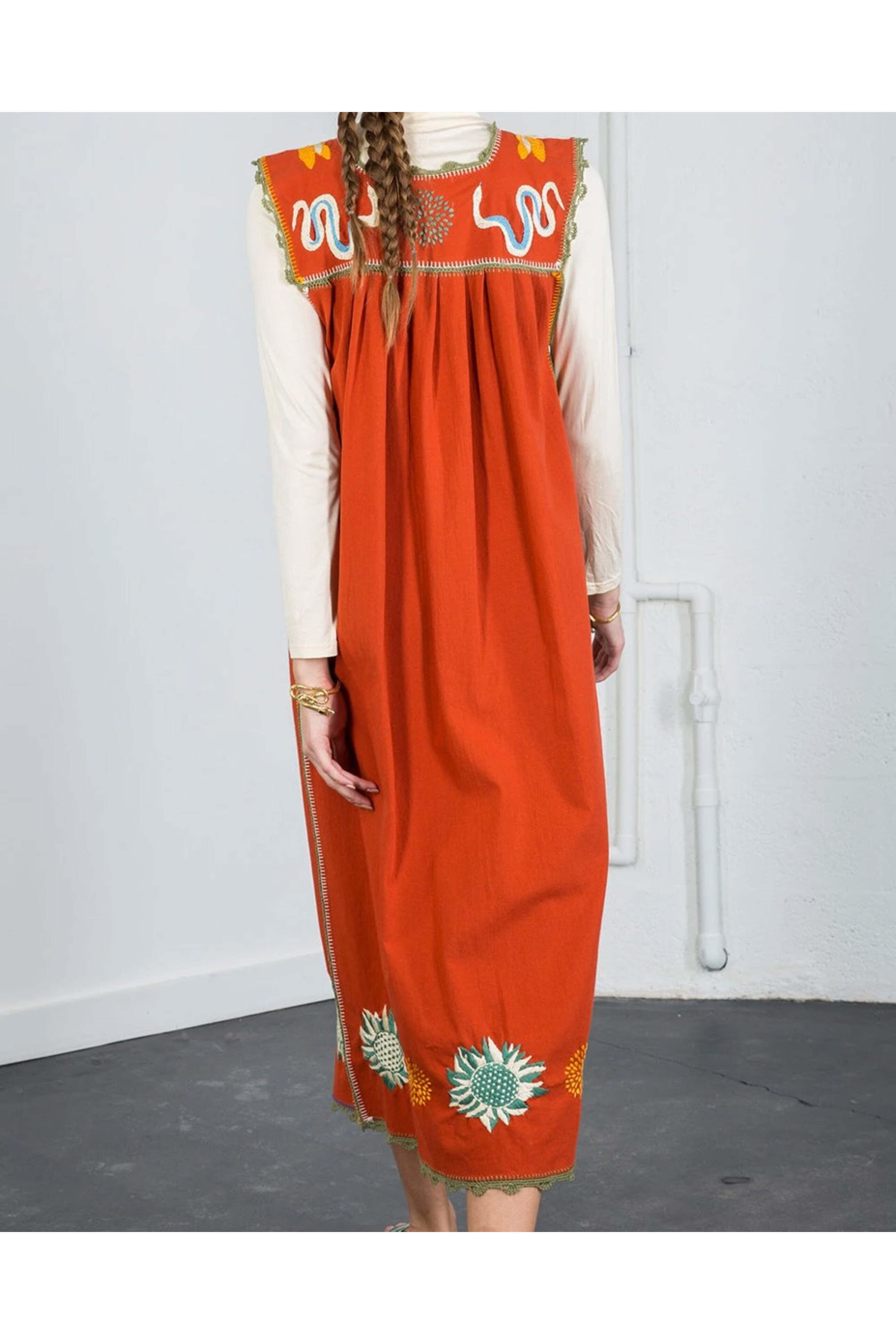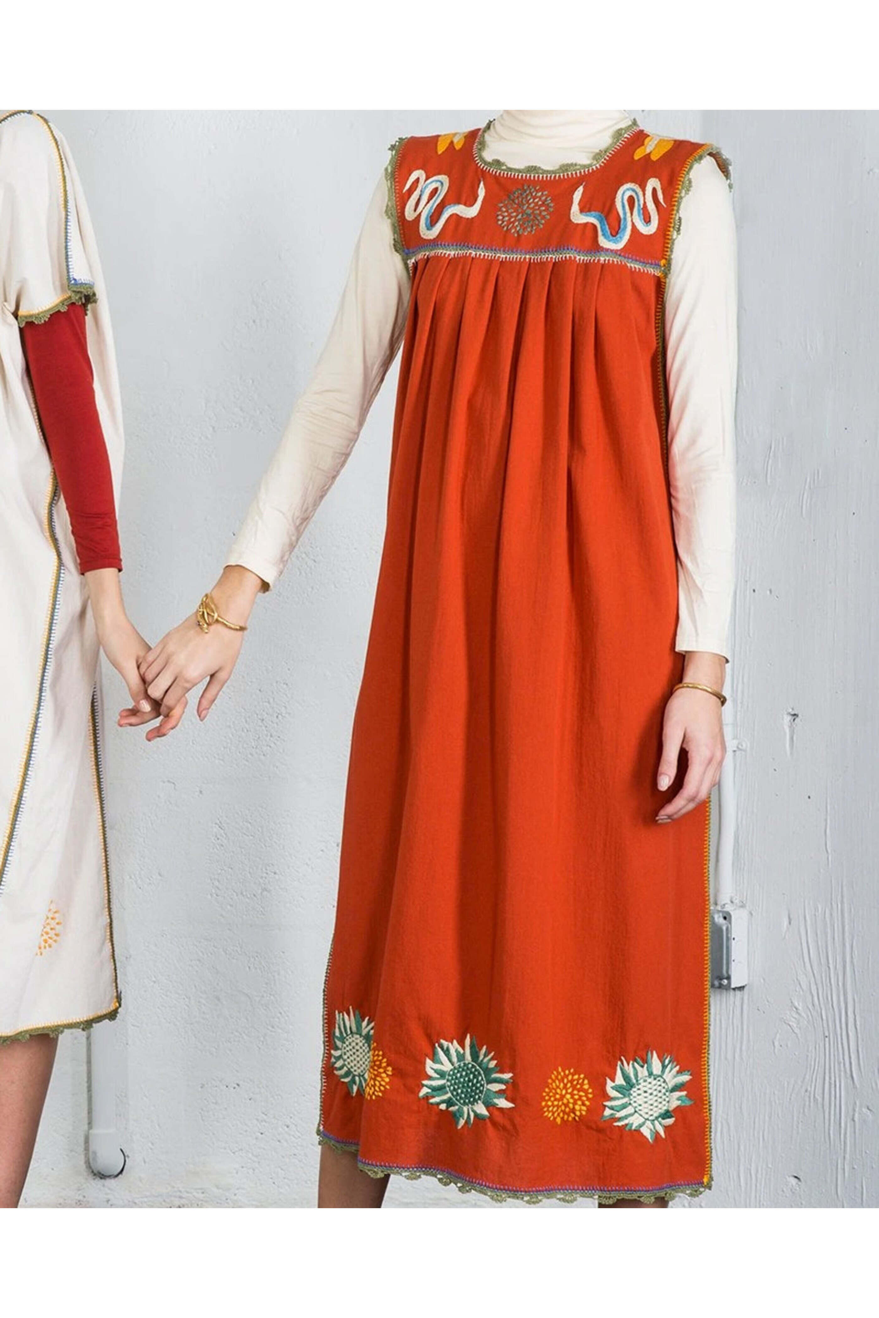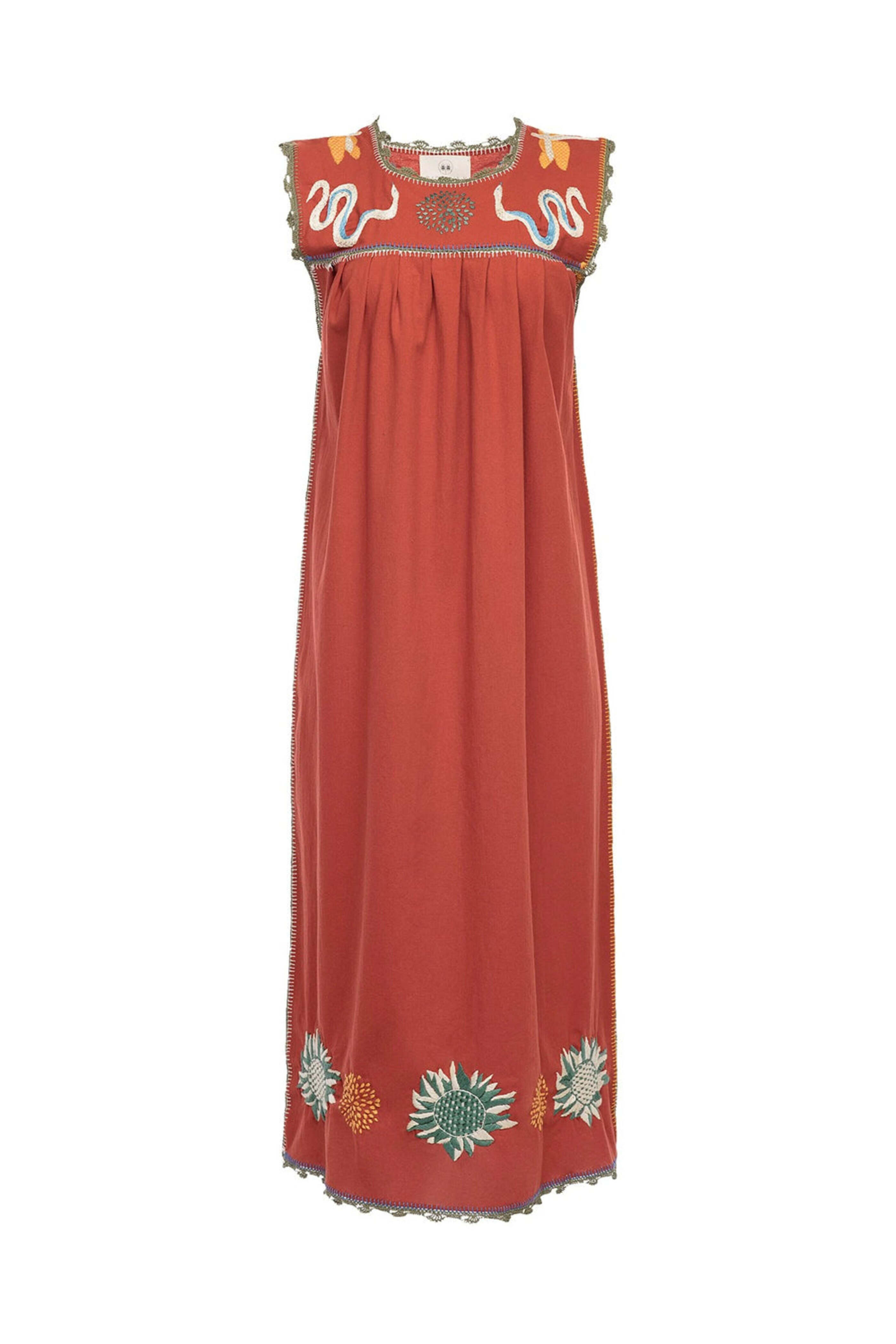 - Carolina K Kio Red Embroidered Ani Dress Round neck Sleeveless Shift silhouette Embroidered detail throughout Straight hemline Midi length Unlined 100% cotton