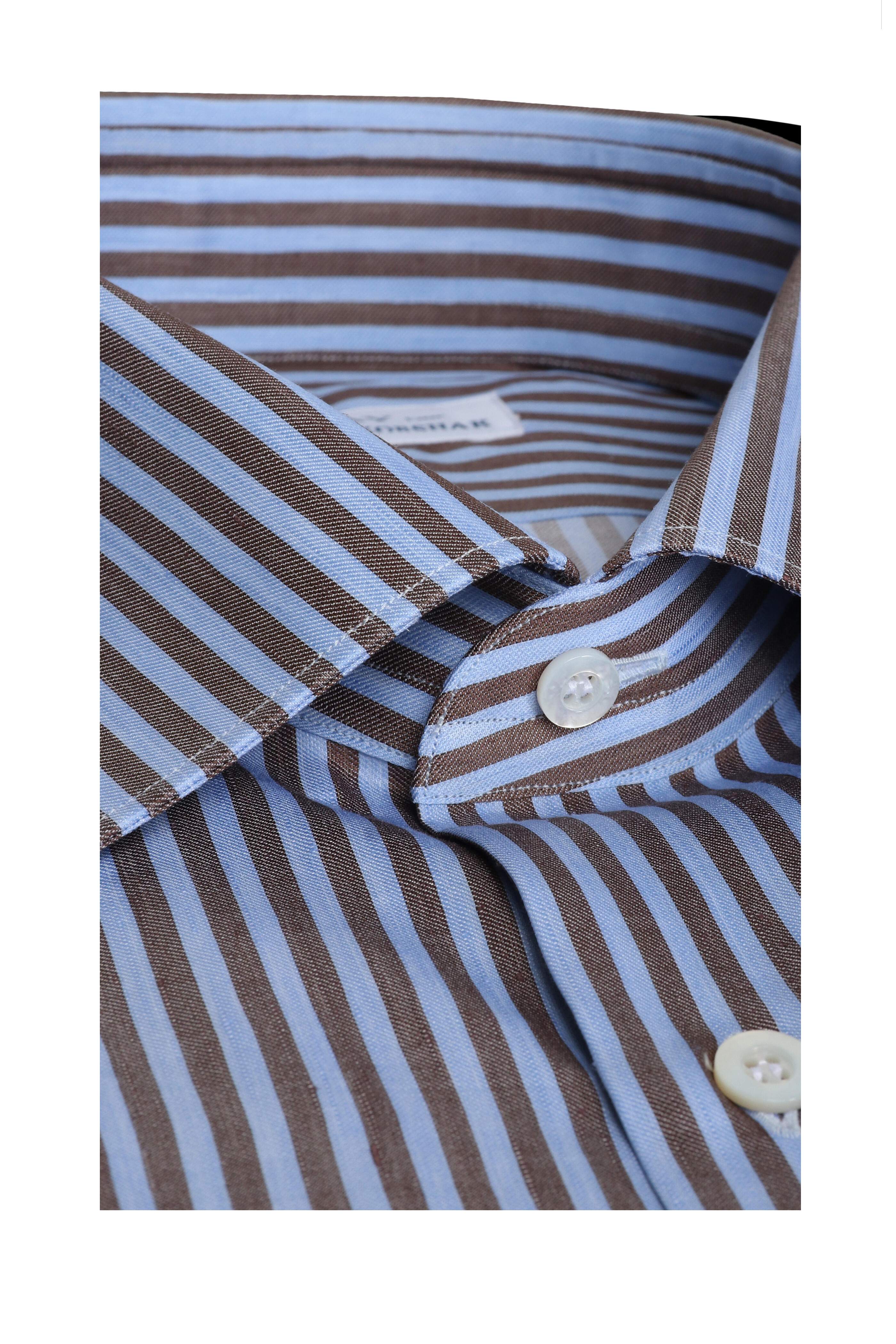 Spread collar. French front button placket. Single button barrel cuffs. Made in Italy. 100% cotton. Dry clean.