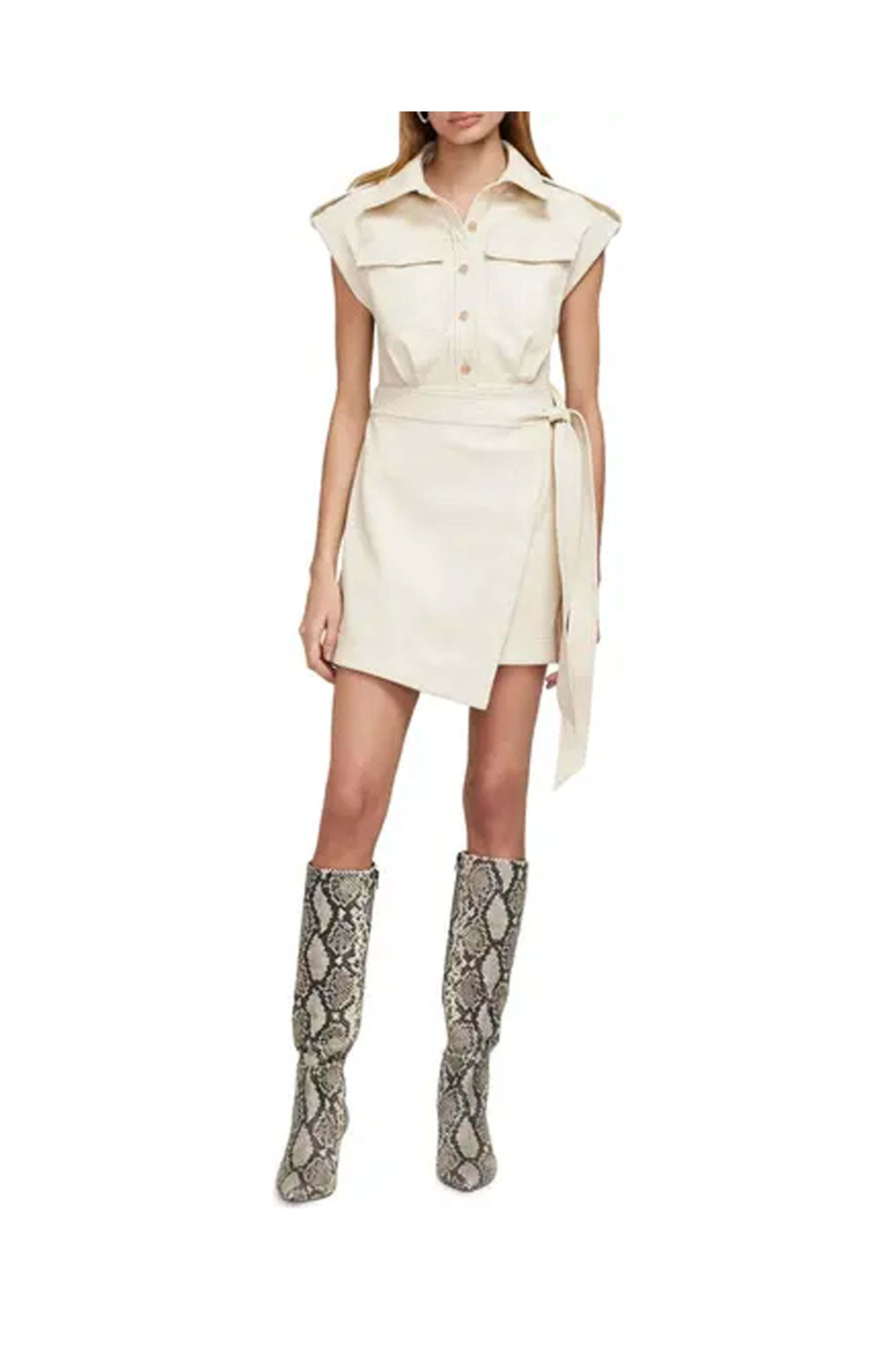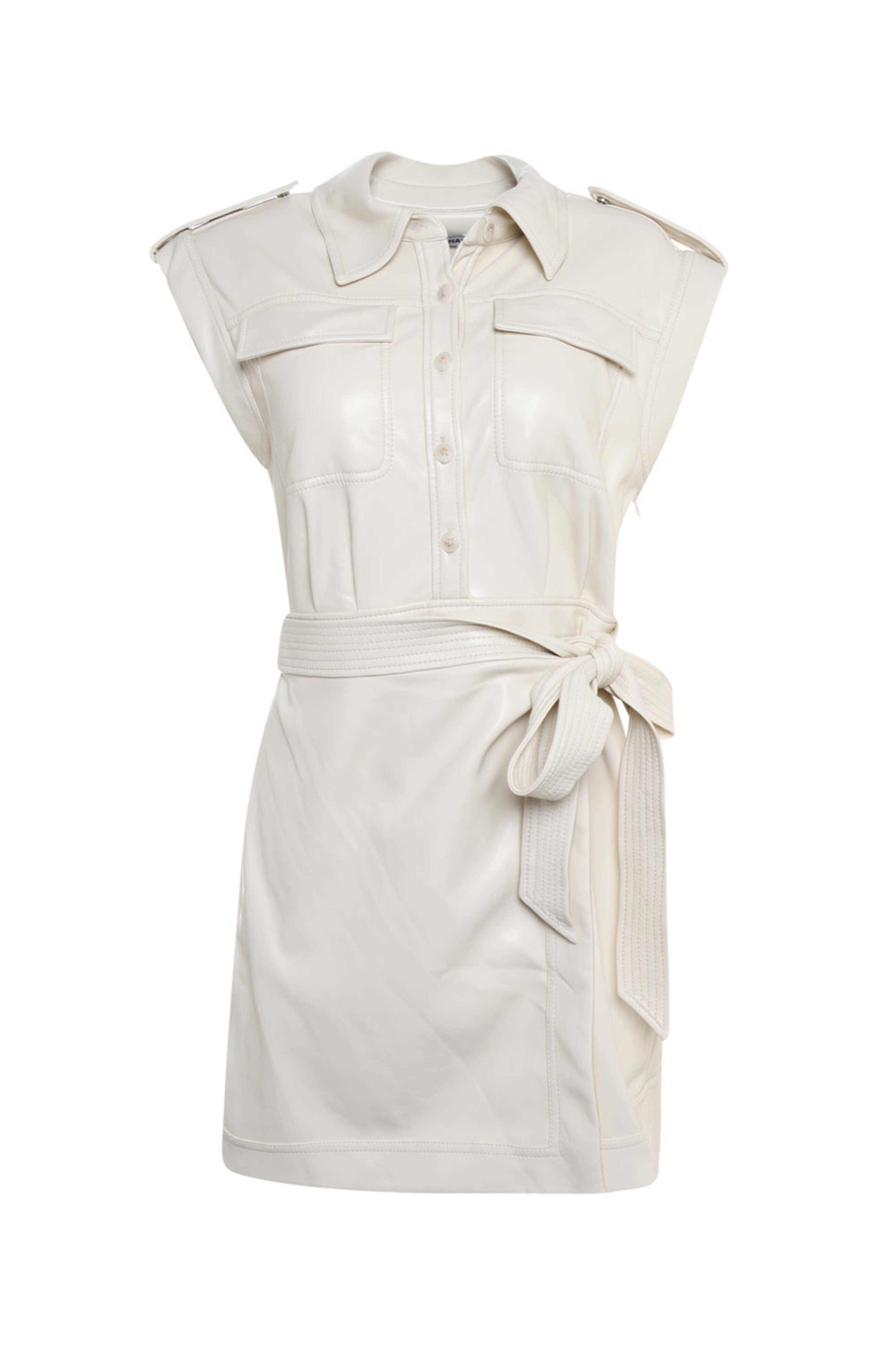 Jonathan Simkhai Ceramic Lourdes Faux Leather Utility Dress. Spread collar. Cap sleeves. Pockets at chest . Button front closure . Self tie at waist . Slim fit . Mini . Lined. 100% polyester with polyurethane coating.