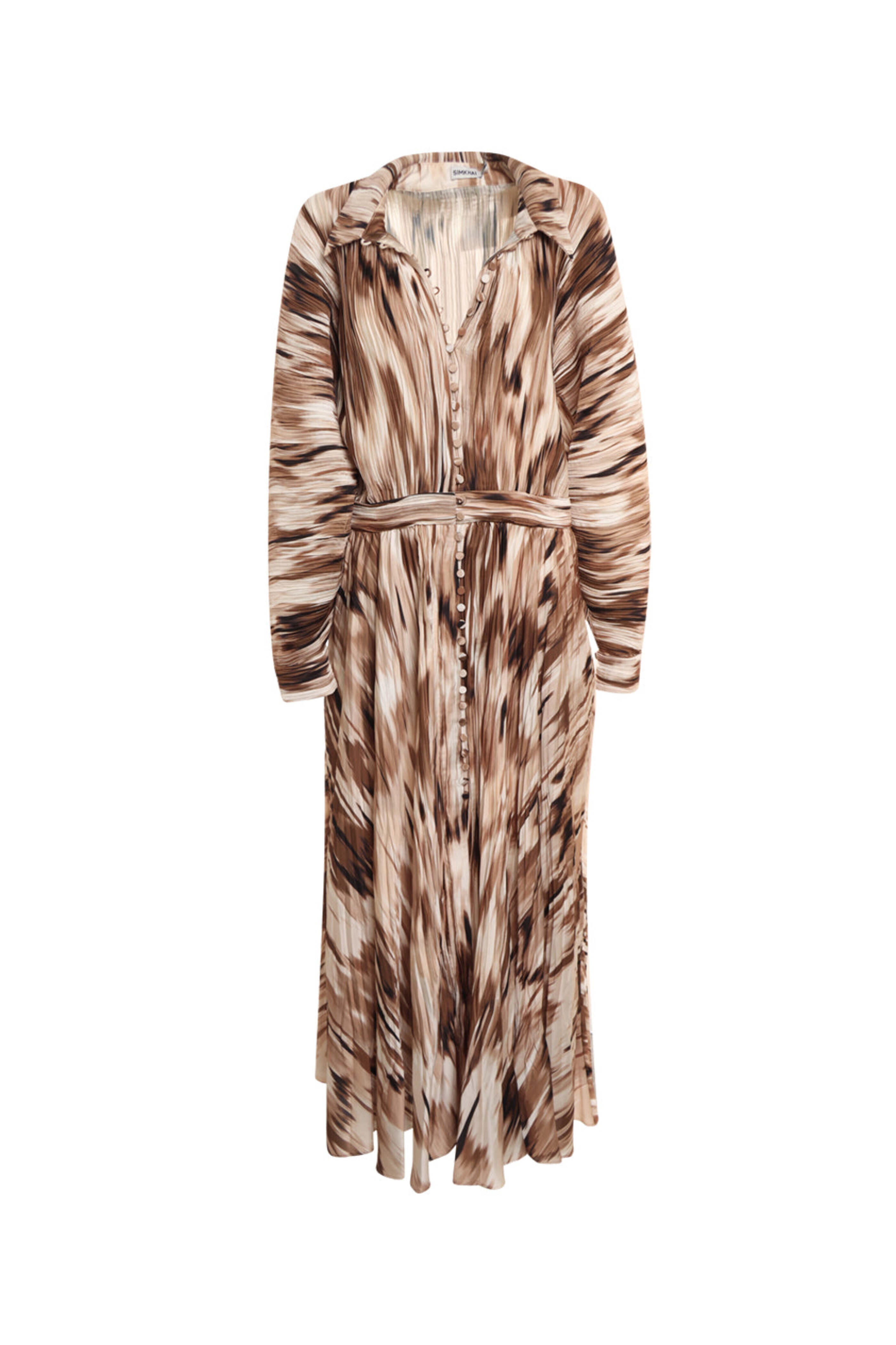 SIMKHAI Thorn Abstract Indiana Midi Dress . Point collar . Long sleeves . Ruffle hem . Relaxed fit . Midi. 100% Polyester.
