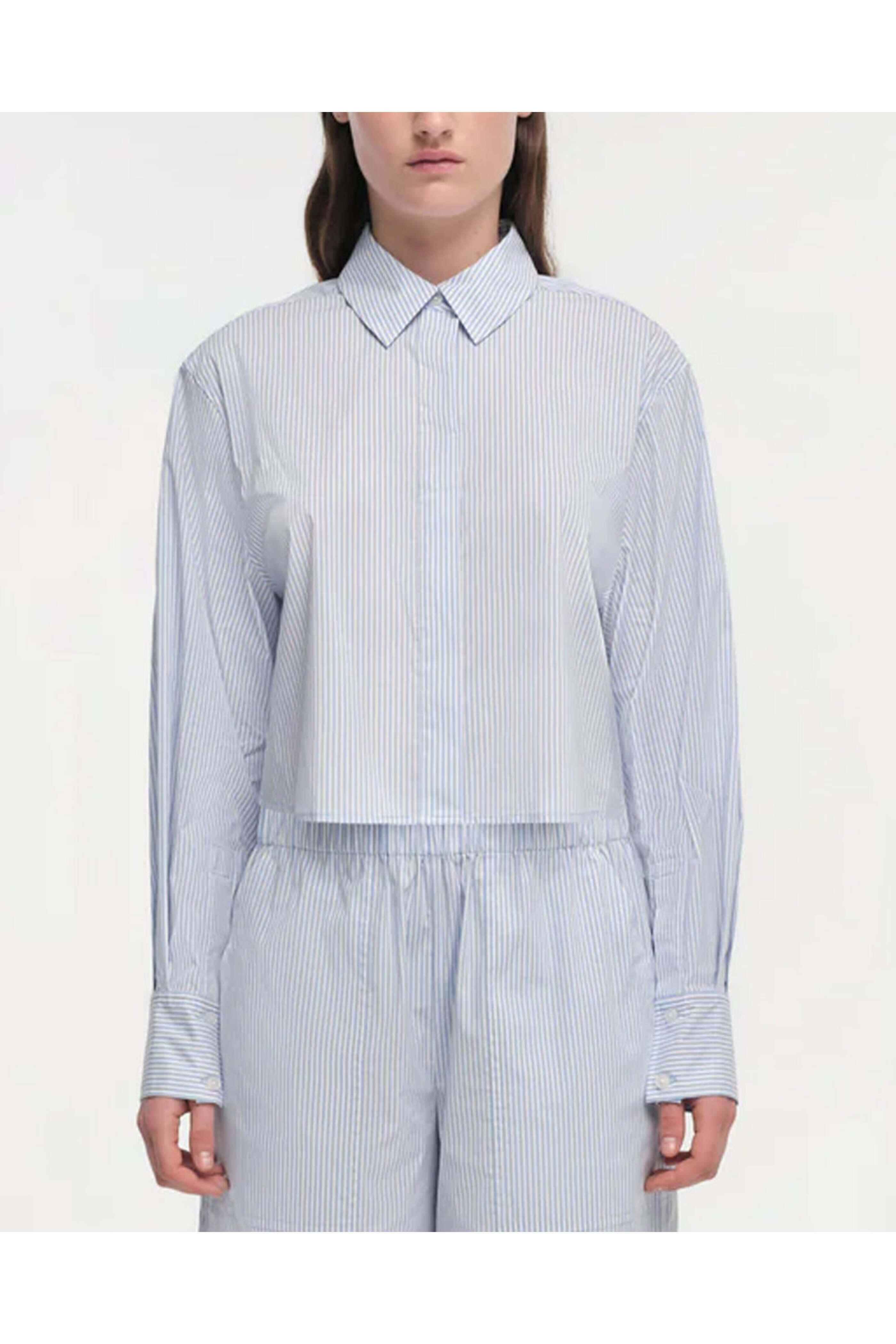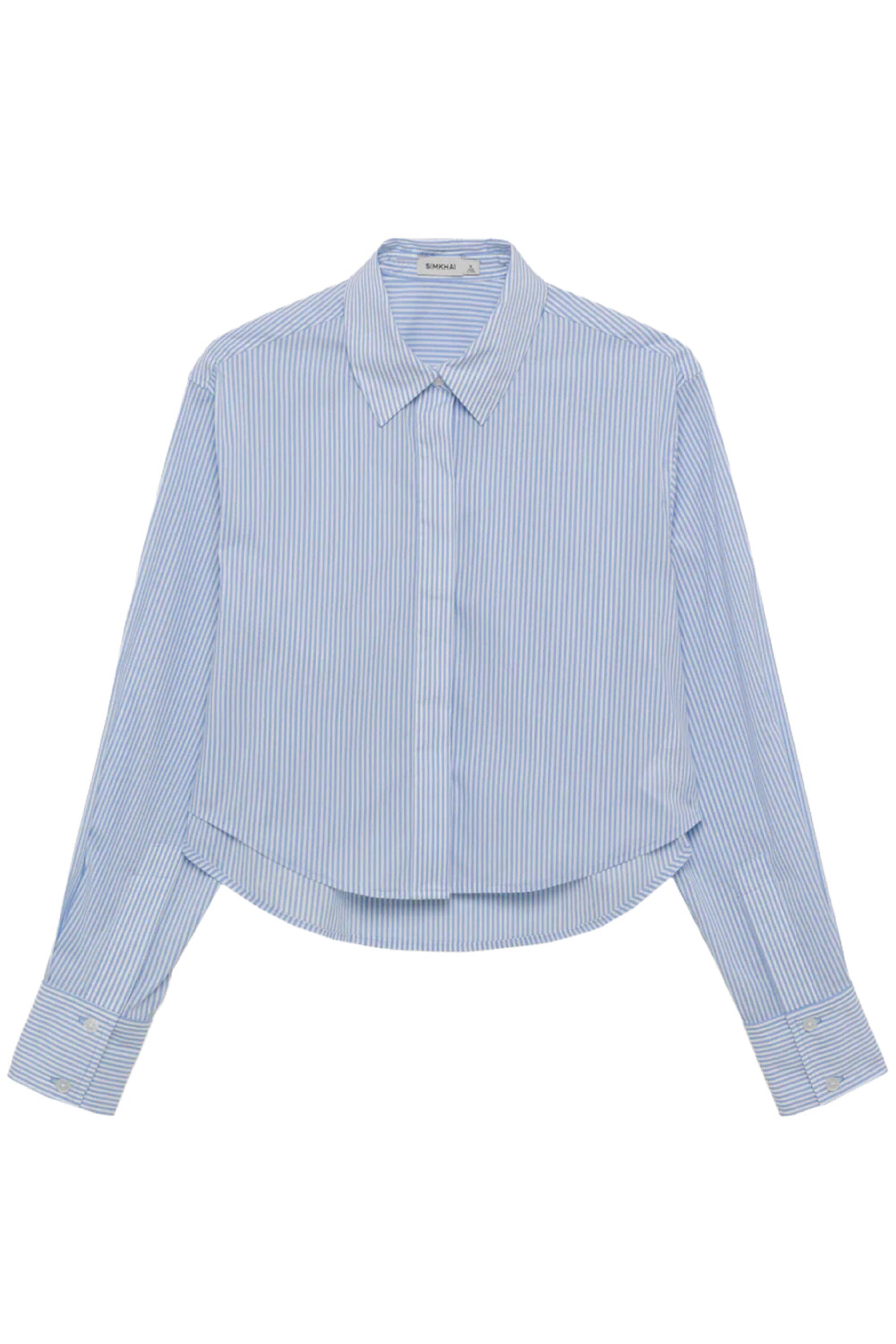 SIMKHAI Blue Stripe Renata Crop Button Up Shirt. Collar. Long sleeves; button cuffs. Concealed button down front closure. Boxy fit. Cropped length. 58% cotton, 37% polyamide, 5% elastane.