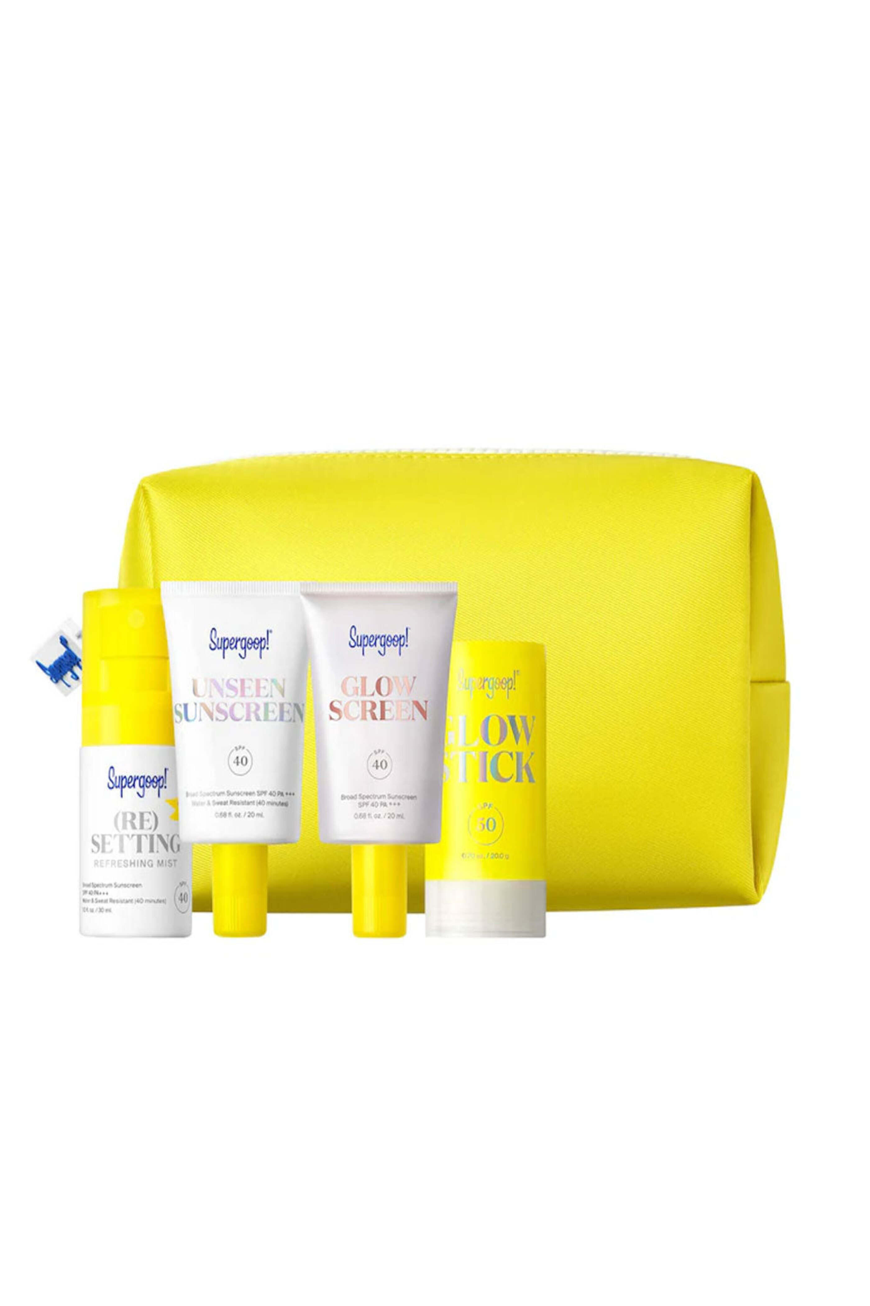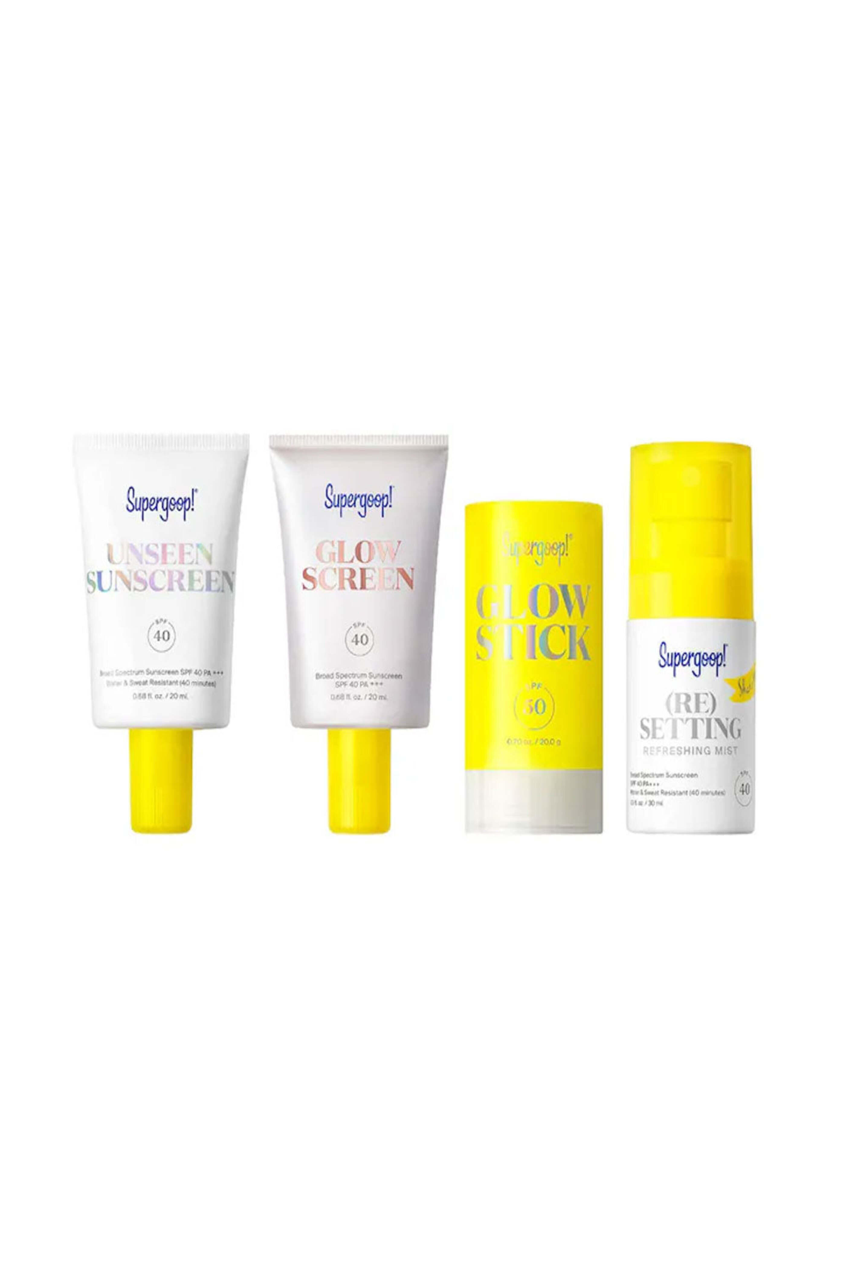 Supergoop Everyday SPF Faves Kit. Set of skincare and beauty bestsellers to make SPF a daily habit. This set contains: 20 mL Unseen Sunscreen, 20mL Glowscreen Sunrise, 20 g Glowstick, 30 mL (Re)setting Mist.