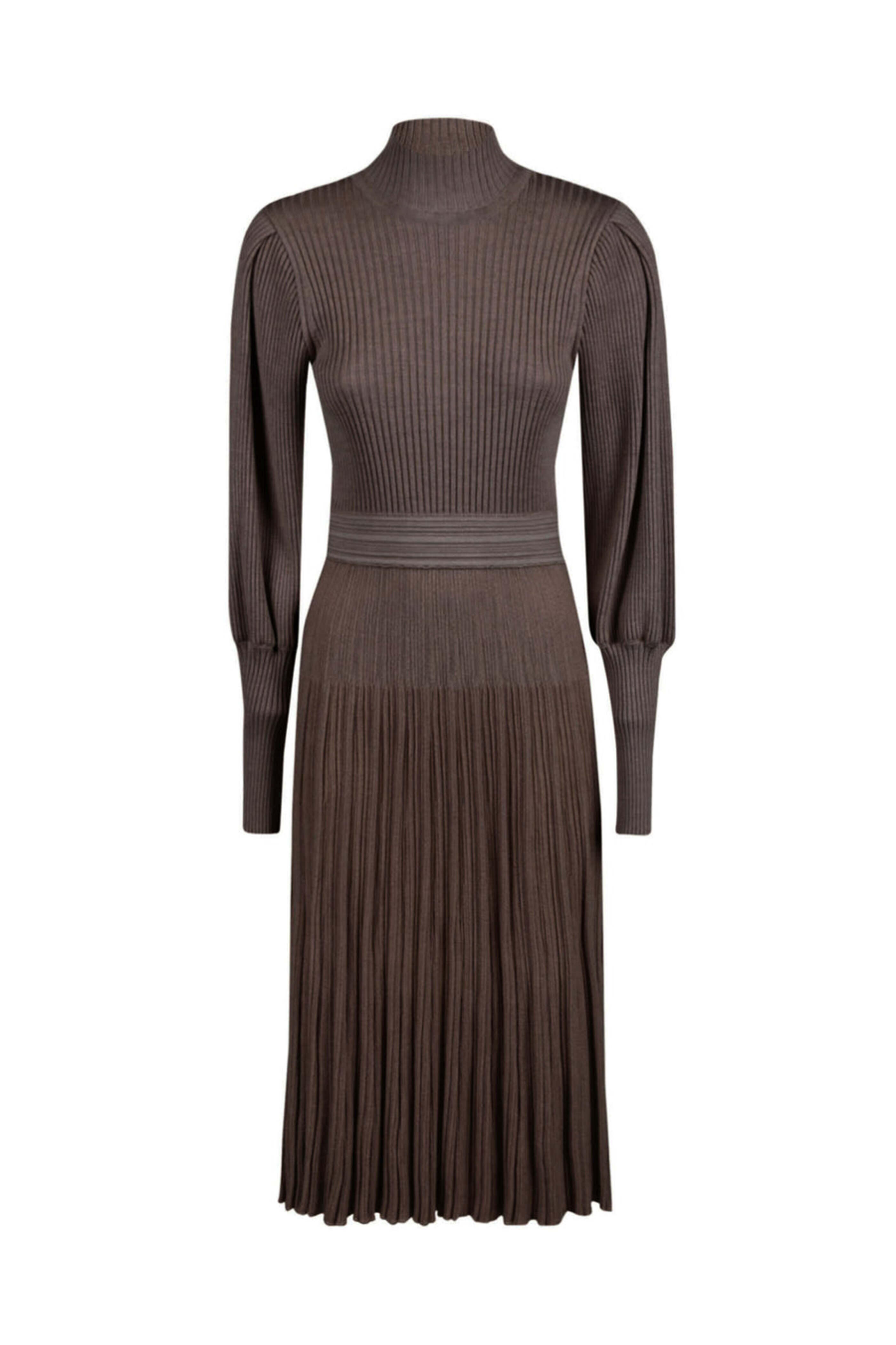 Antonino Valenti Espresso Nicola Dress. Mockneck. Long sleeves; extended cuffs. Banded waist. Aline skirt. Knee to midi length. Pleated knit fabrication. Made in Italy.