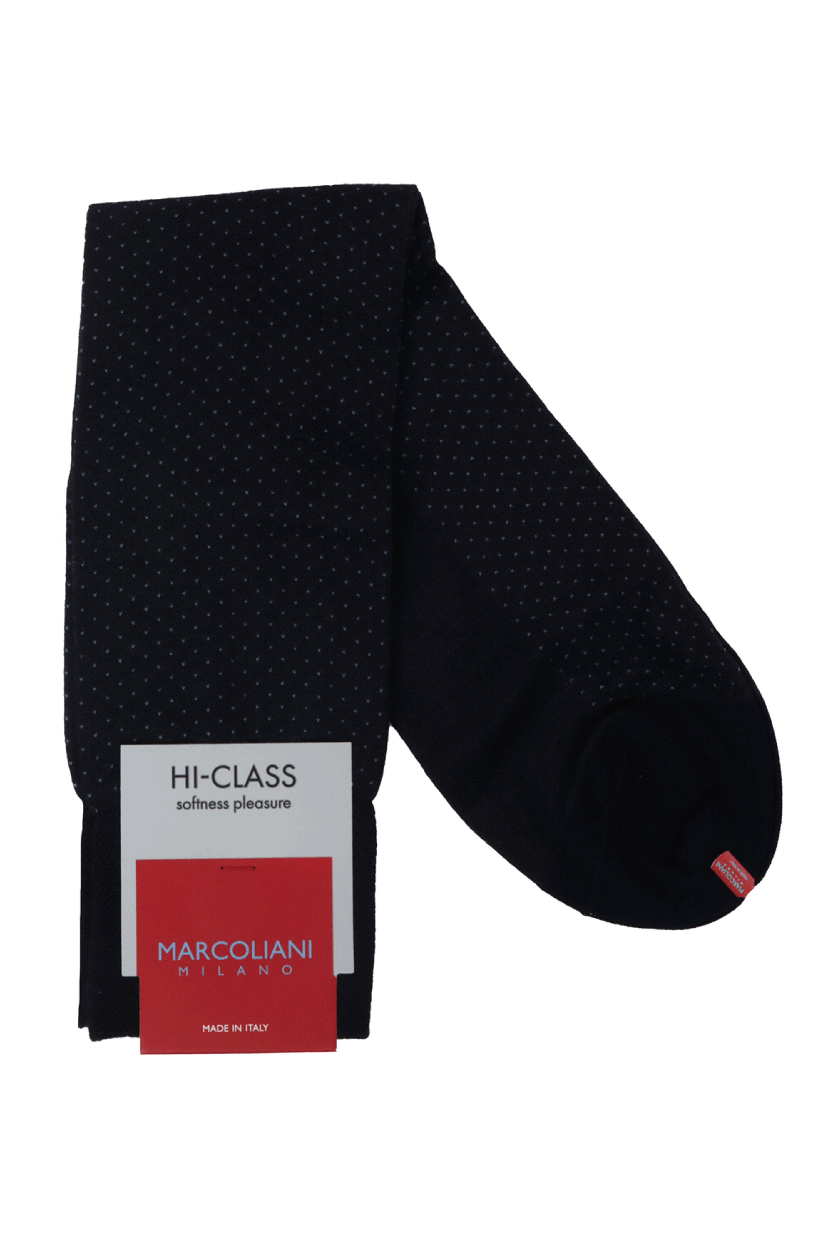Marcoliani Navy Pindot Midcalf Socks. Midcalf. Colors collection. One size fits most. Made in Italy . 77% modal, 23% nylon.