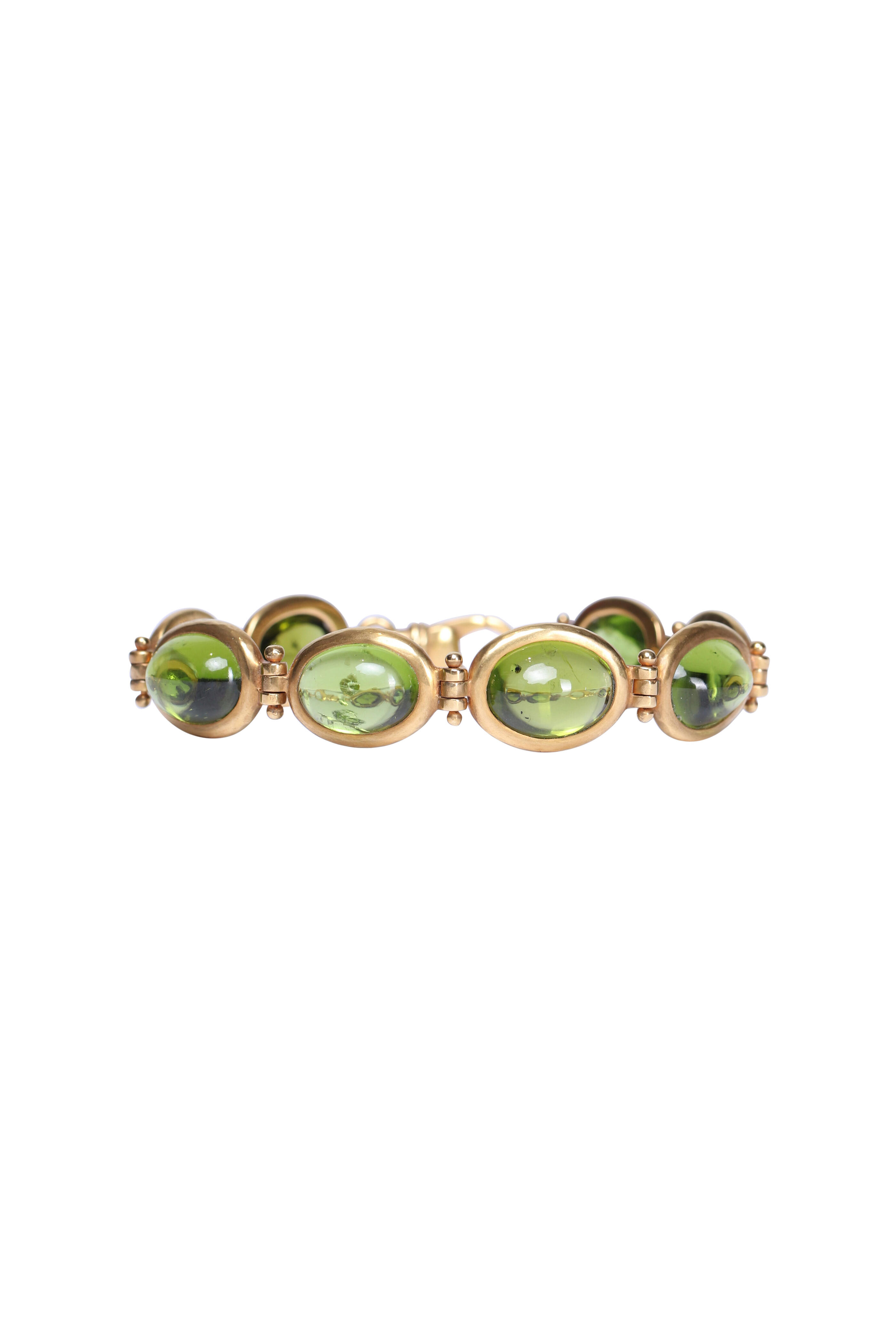 22k gold. Peridot. Cabochon. Gold bezel. Hinge clasps. Made in NYC.