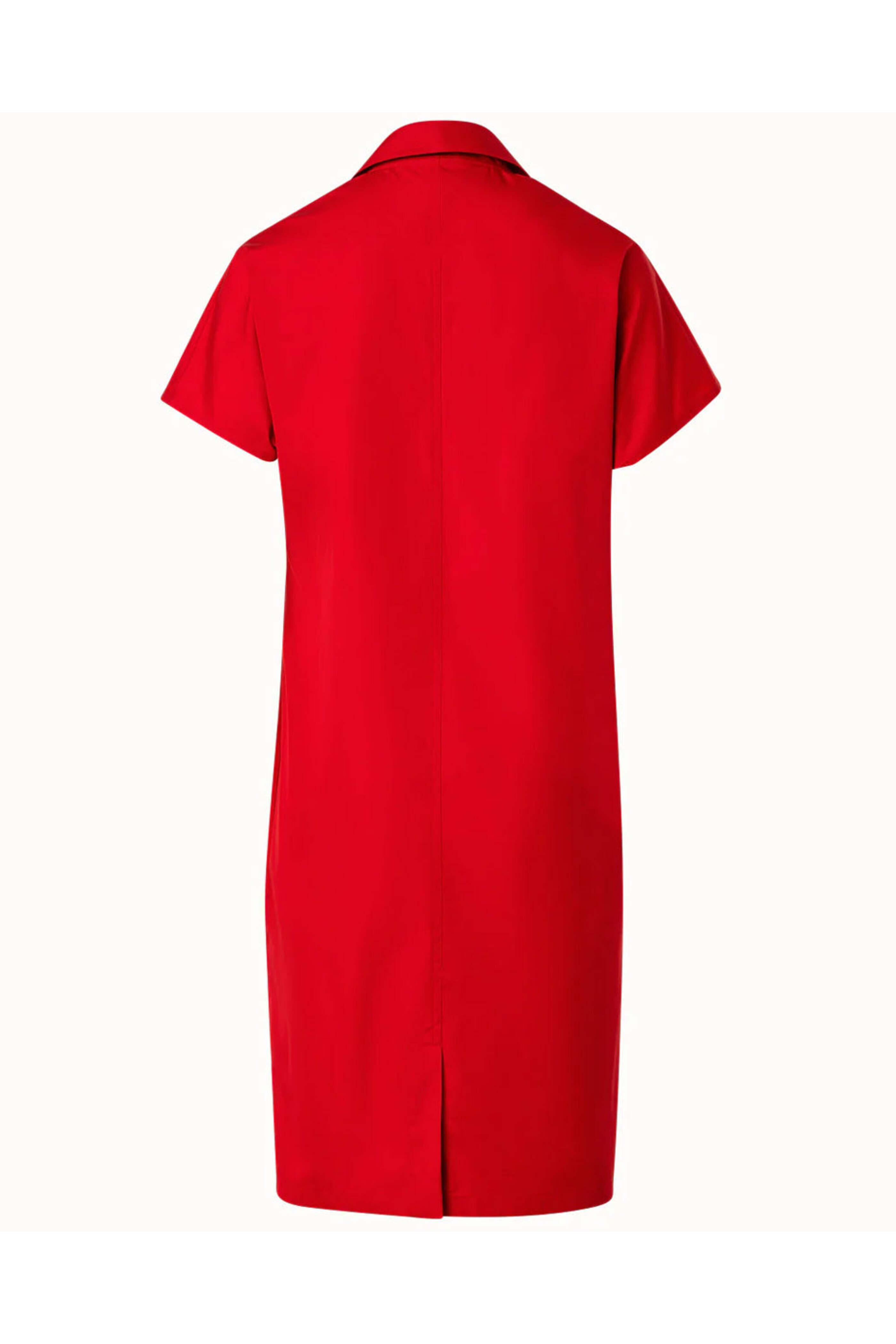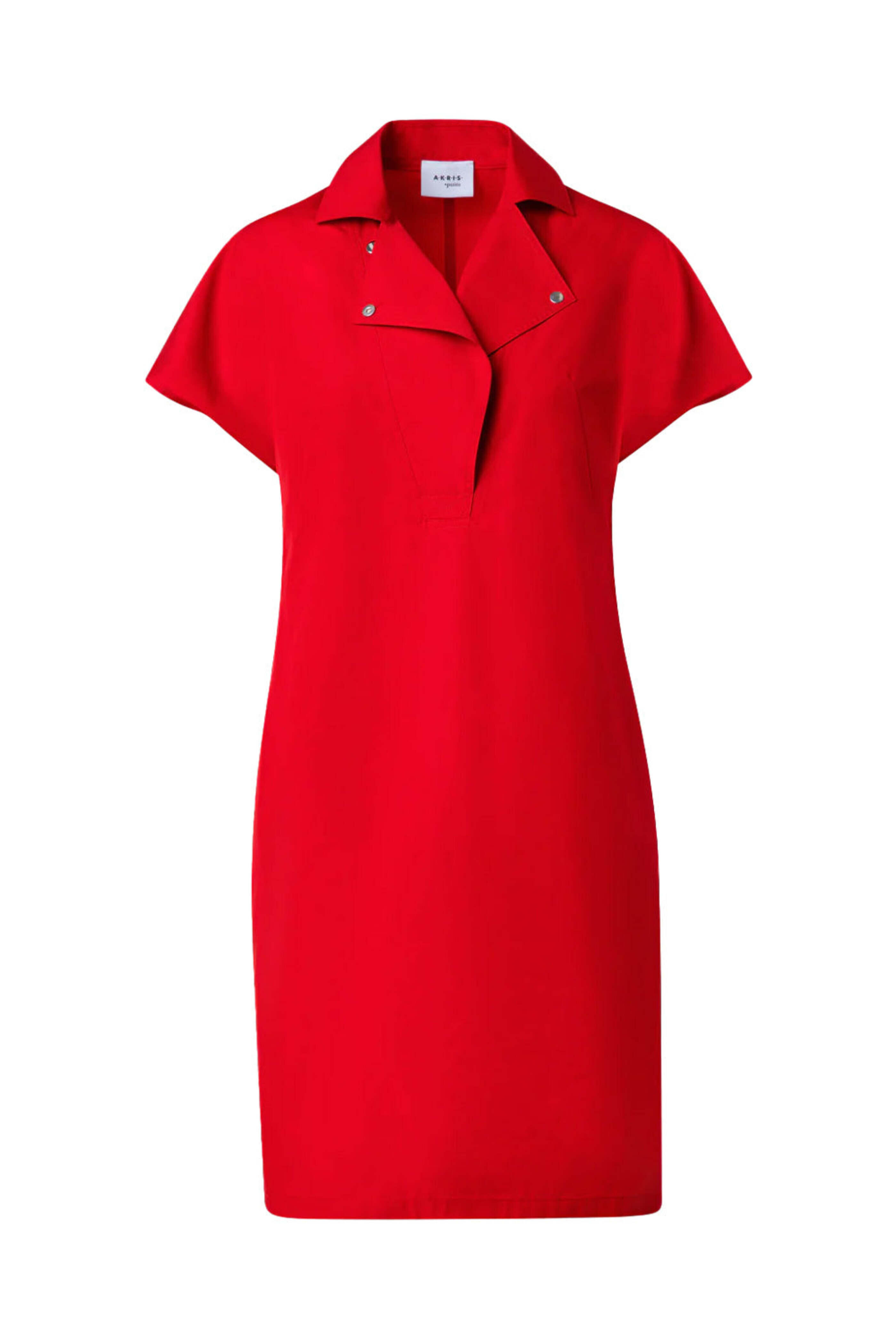Akris Punto Red Techno Crepe Mini Dress. Collar. Short cap sleeves. Snap button closure. Relaxed fit. Mini length. 97% cotton, 3% elastane.