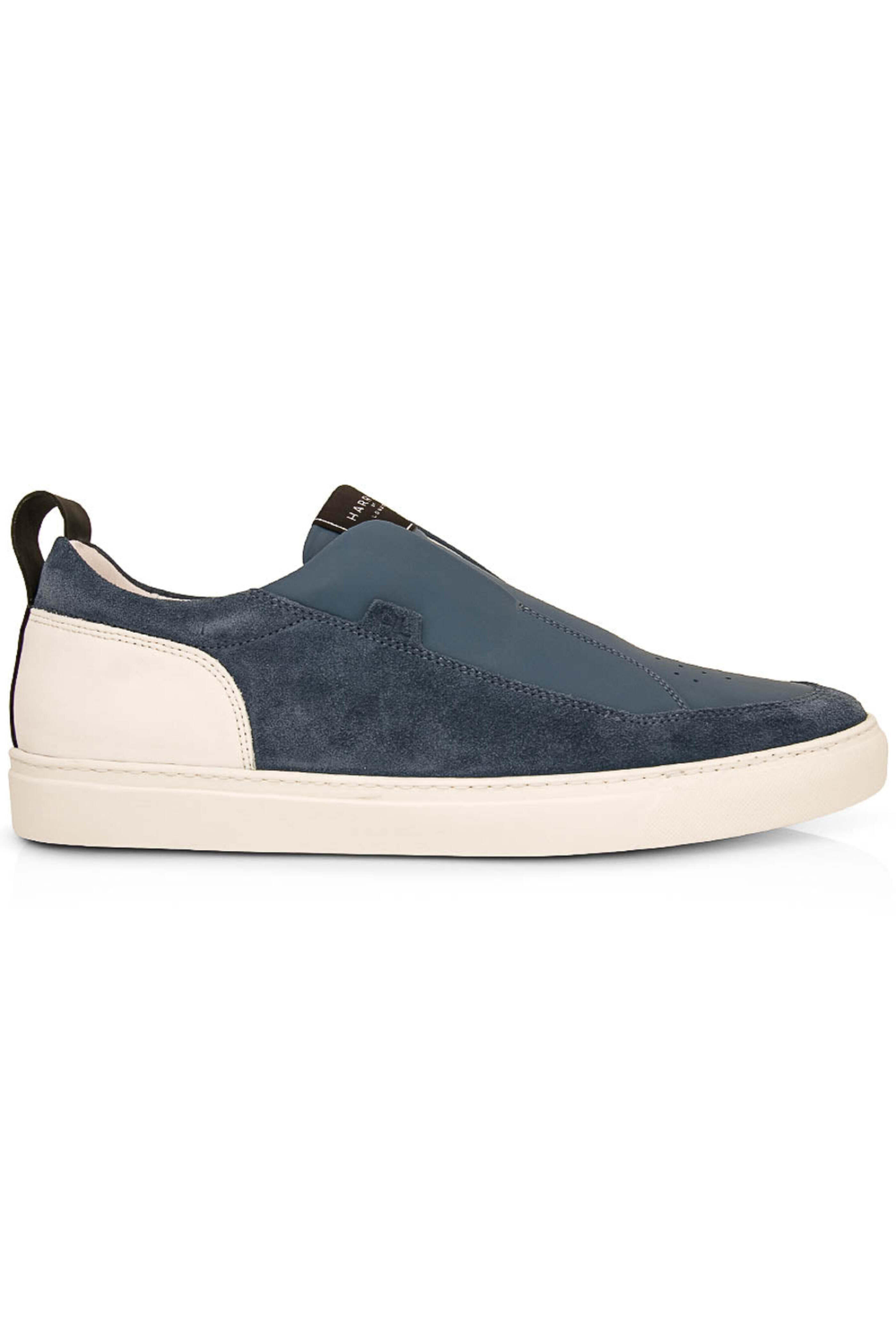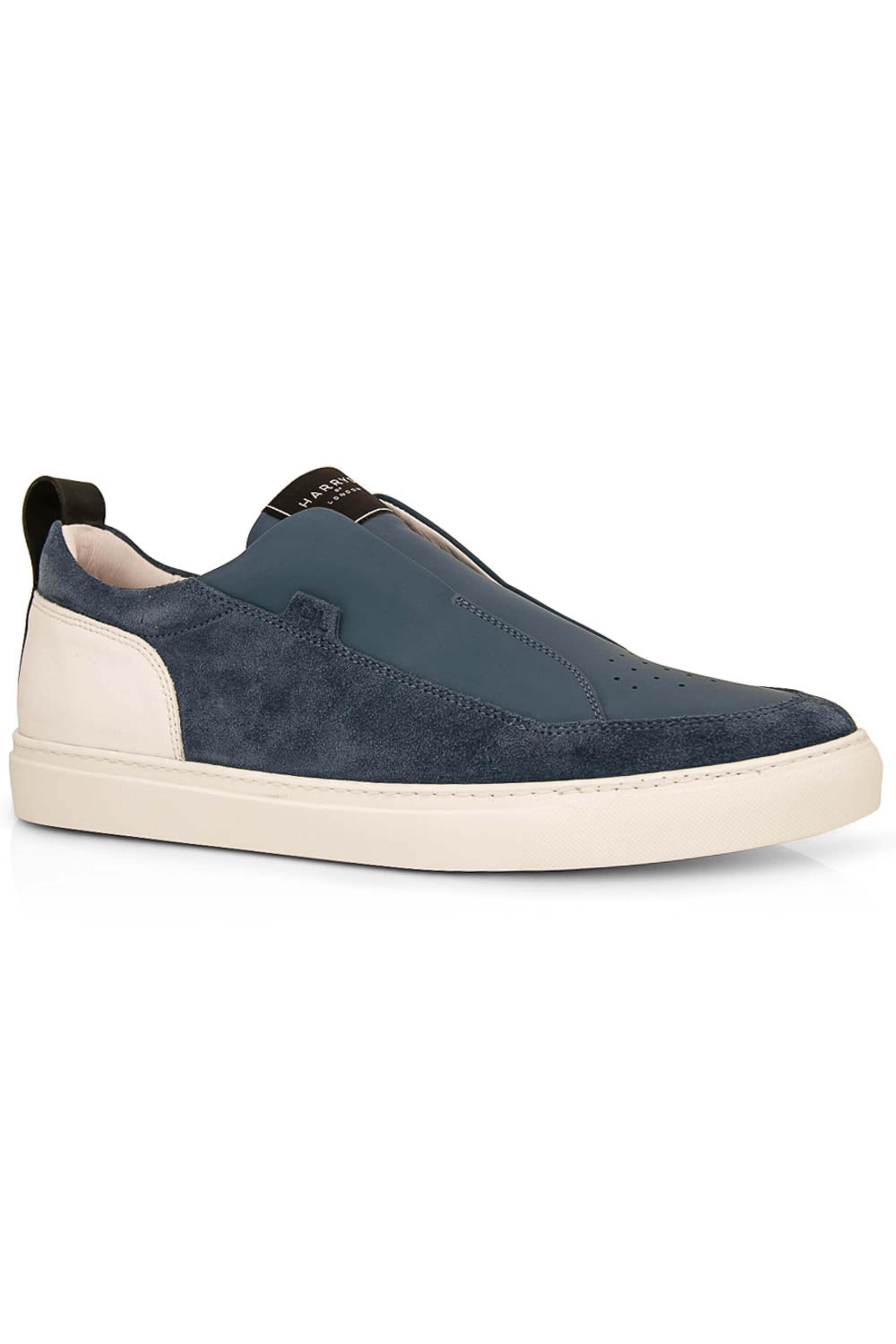 Harry's London Jaunty Pro Sneaker in Indigo. Tech leather and suede upper. Slip on no-lace sneaker. Rounded toe. Tonal stitching. HL embossed side logo. Perforation detail at upper. Harrys of London taffeta tab logo to tongue. Tech leather contrast heel counter. Padding to topline for optimal comfort. Rubber sole. Internal lining for durability. Technogel insole for optimal comfort. Cemented construction. Harrys of London logo to insole and insole.
