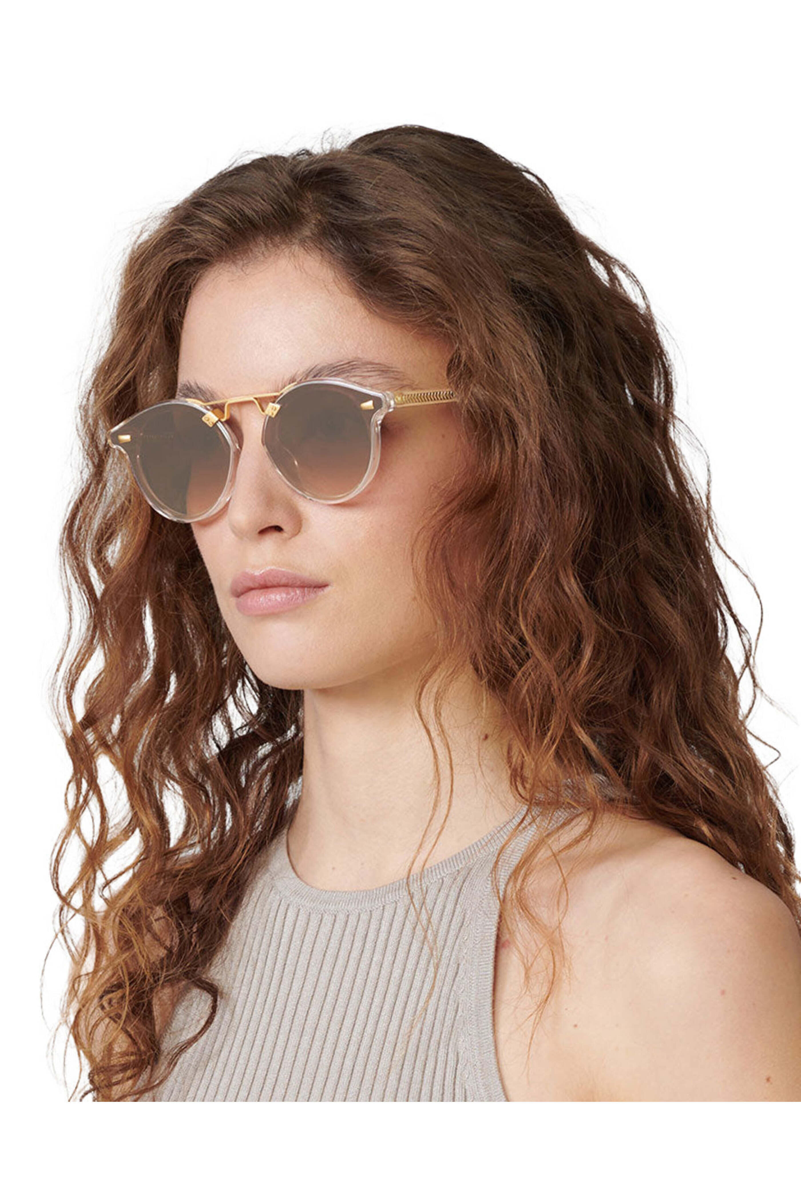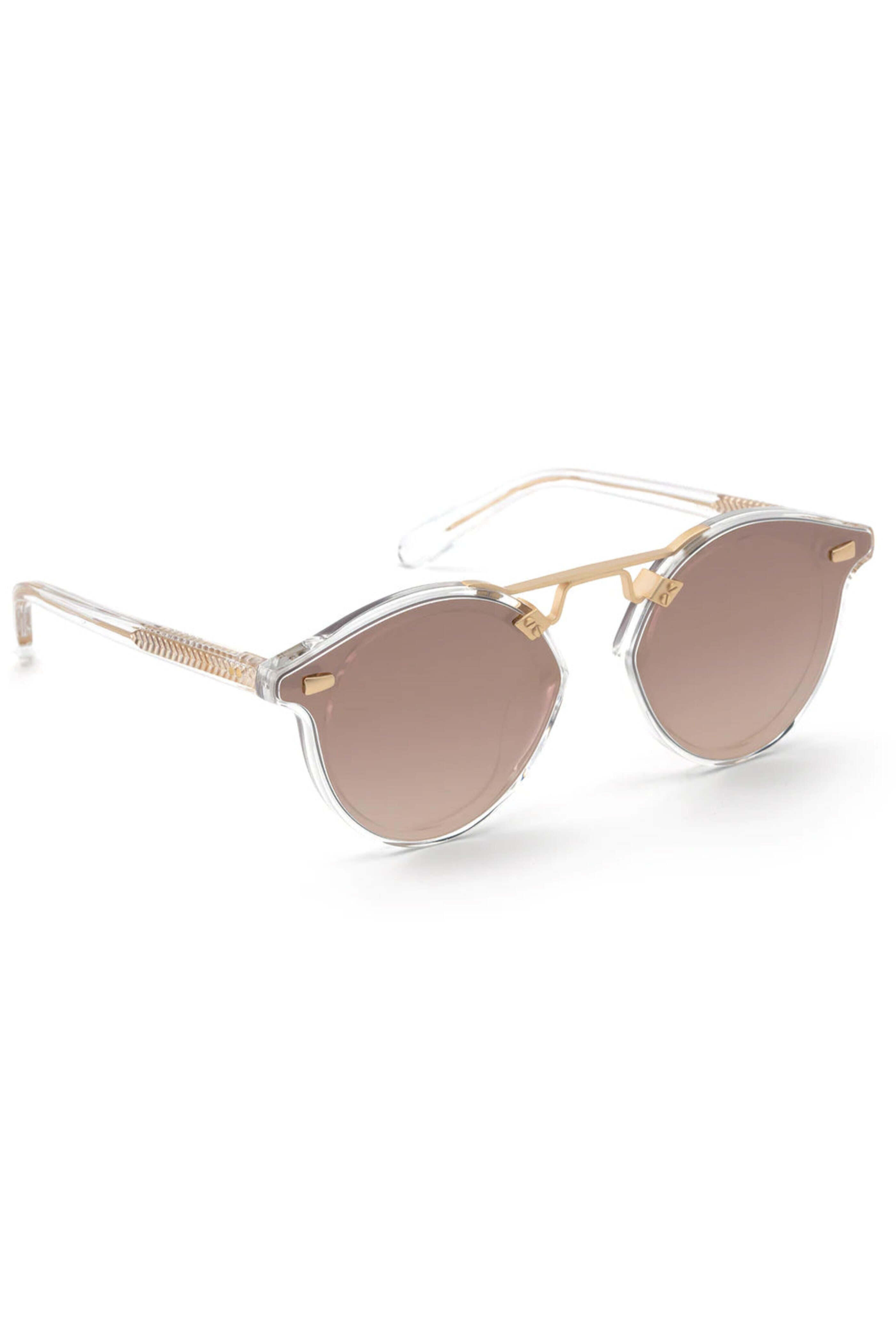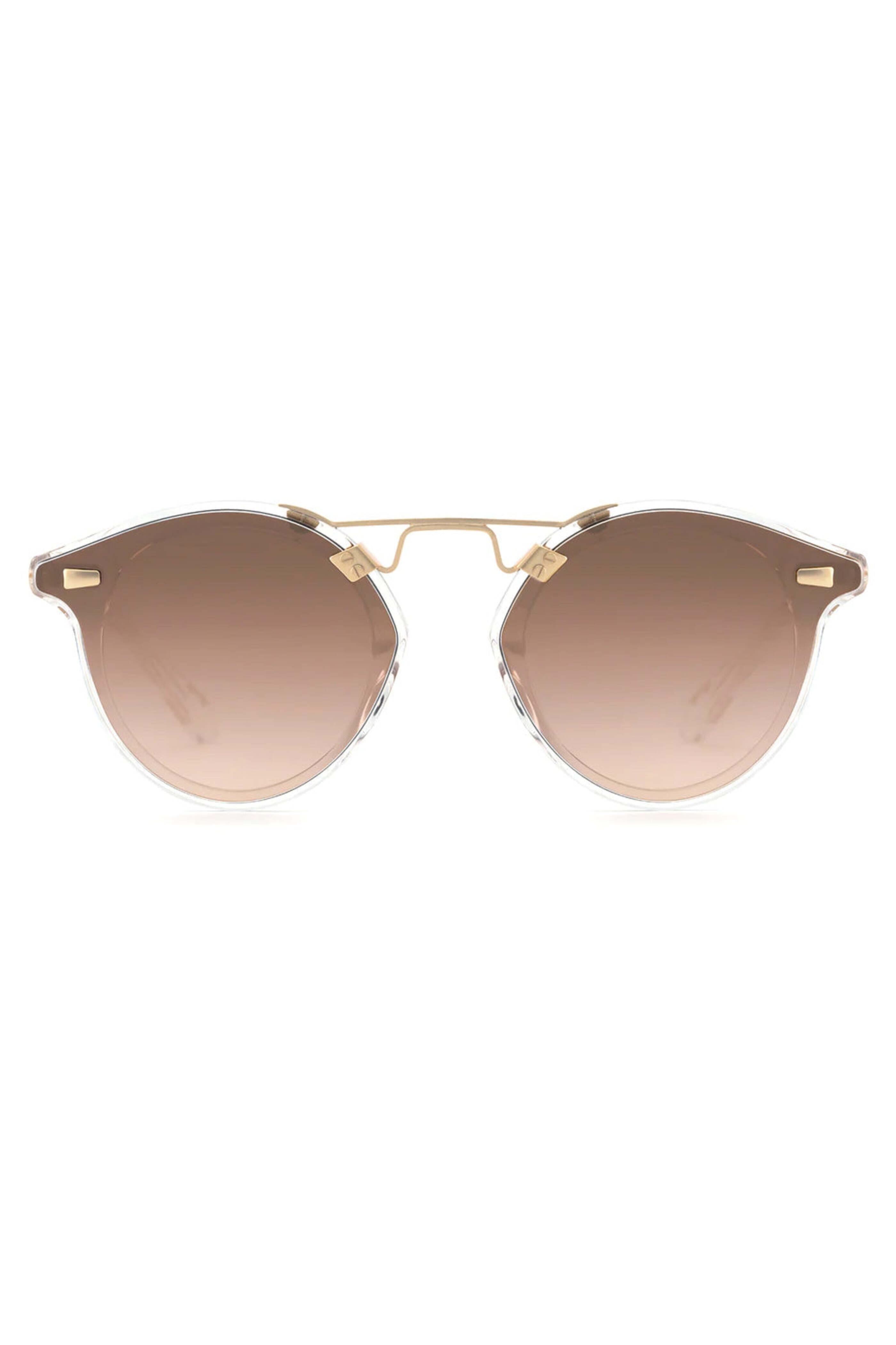 KREWE St. Louis Nylon in Crystal 24k. Amber silver gradient mirrored nylon lens. 24k gold plated hardware. Handcrafted, acetate frames. Size 63-16-145. Premium hard case. Microfiber cleaning cloth. 100% UVA / UVB protection.