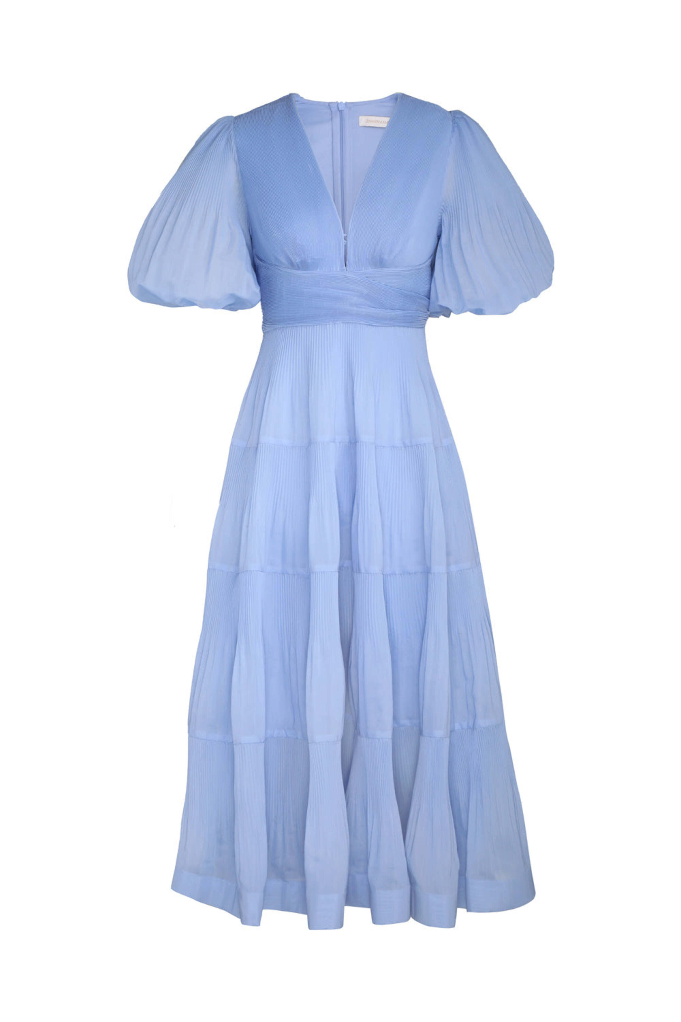 Zimmermann Jacaranda Pleated Midi Dress. V neck. Short puff sleeves. Back zip closure. Tiered silhouette. Midi length. Pleated fabrication. 100% polyester outer 1, 100% cotton outer 2.