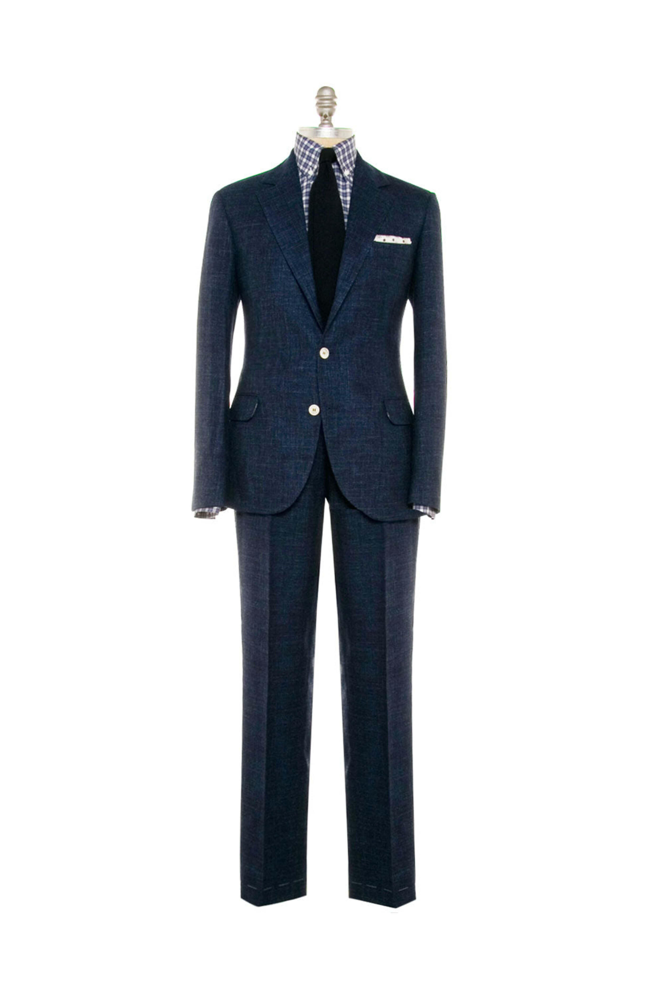 Brunello Cucinelli Denim Blue Wool Blend Suit. Notch lapel. Three button jacket. Front left welt chest pocket. Ticket pocket. Flap waist pockets. Double back vents. Flat front pant. Zip fly. Three button closure. Belt loops. Side pockets. Single button back welt pockets. 11 rise. 7 hem opening. Cupro lining. Made in Italy. 63% wool, 20% silk and 17% linen.