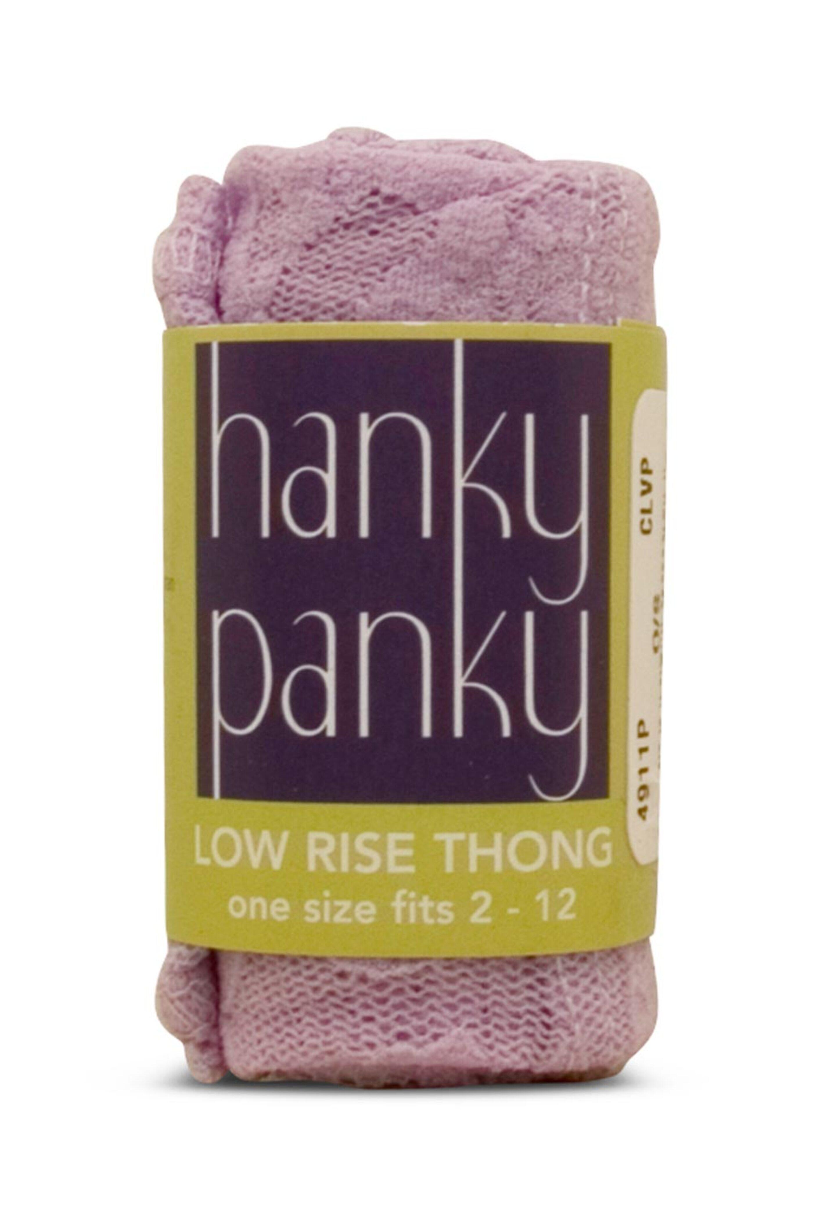 Hanky Panky Lavender Low Rise Thong. Low rise. Thong silhouette. Lace detail throughout. One size fits 2-12. 100% nylon outer, 90% nylon, 10% spandex trim, 100% cotton trim.