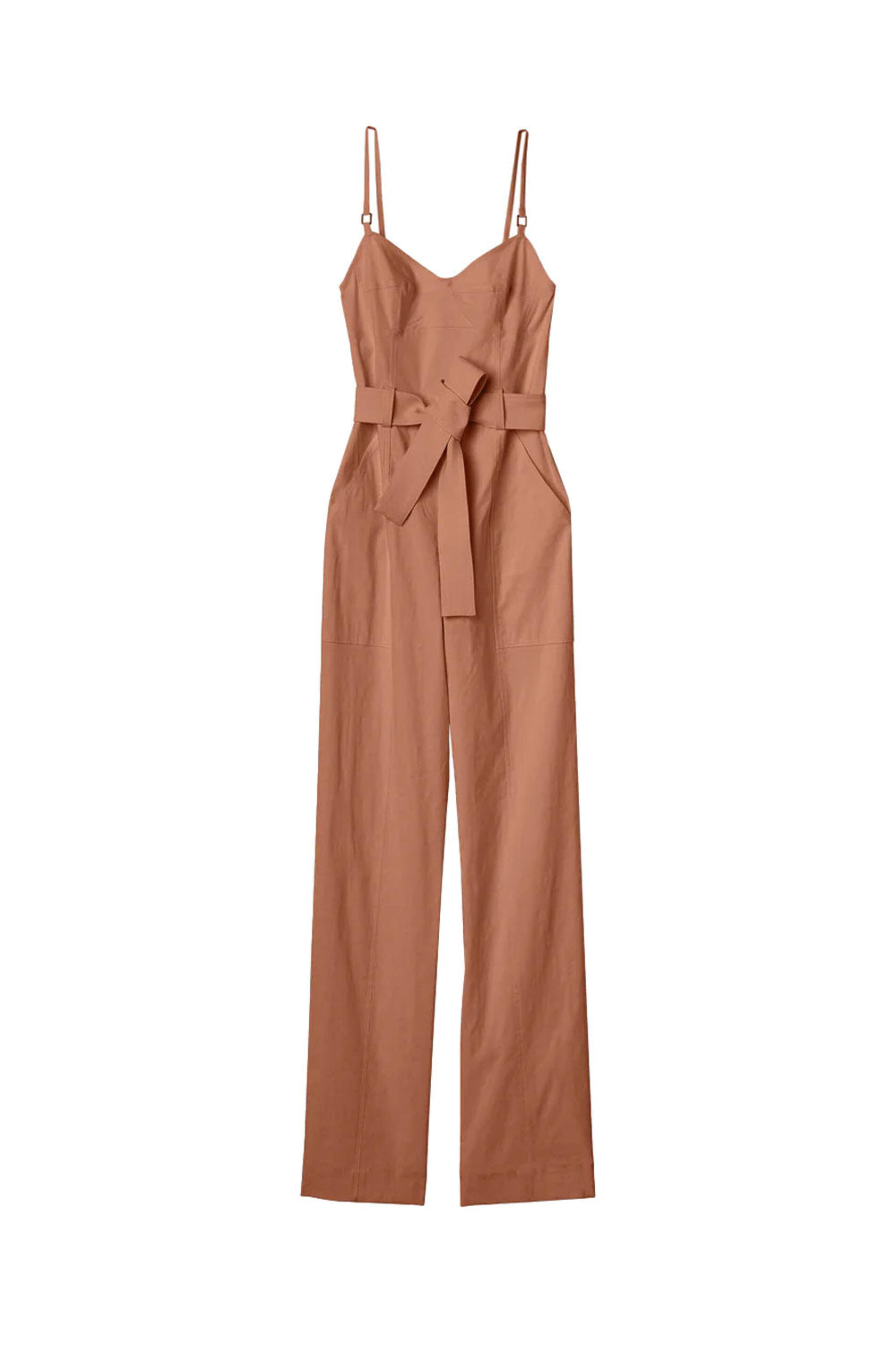A.L.C. Noisette Mila Jumpsuit. Bustier-style neckline. Sleeveless, adjustable straps. Back zip closure. Self-tie belt. Front slip pockets. Slim fit. Partially lined. 54% linen, 44% viscose, 2% elastane.