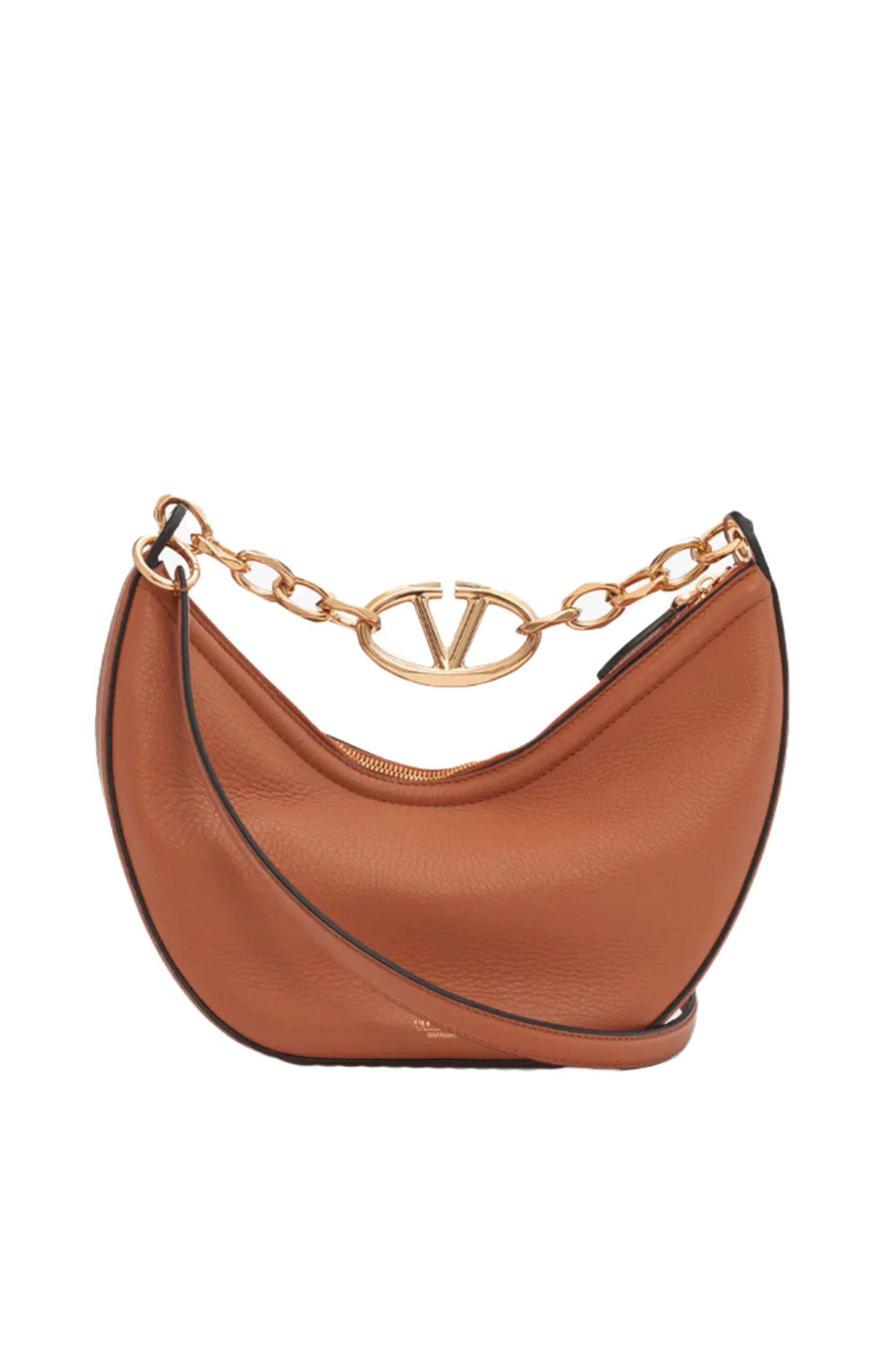 Valentino Small Vlogo Moon Hobo Bag in Nero. Zip closure. Removeable leather strap. Gold-tone finish chain and hardware. Interior slip pocket. Leather outer and lining. 11.4W x 9H x 4.3D. 8.6 chain drop. 21.7 strap drop. Made in Italy.
