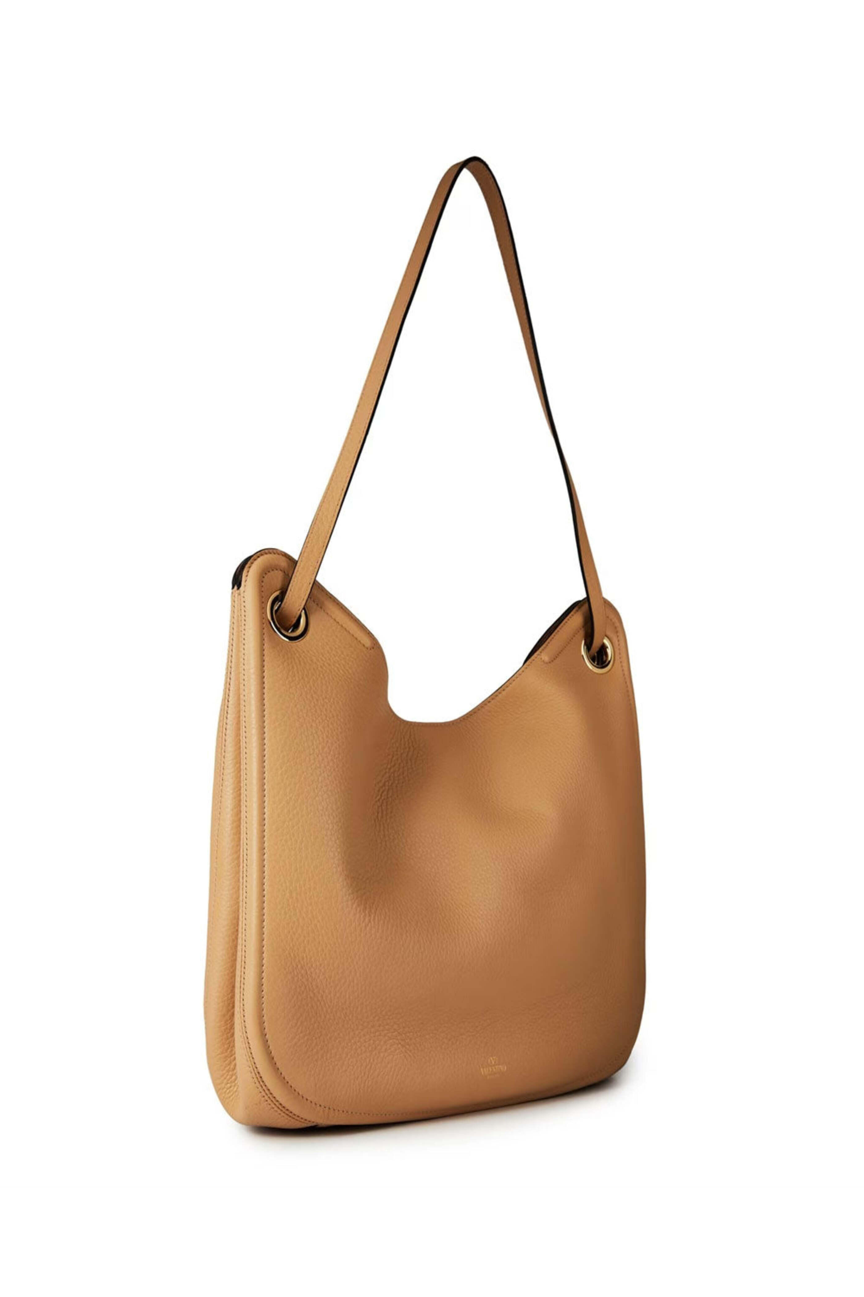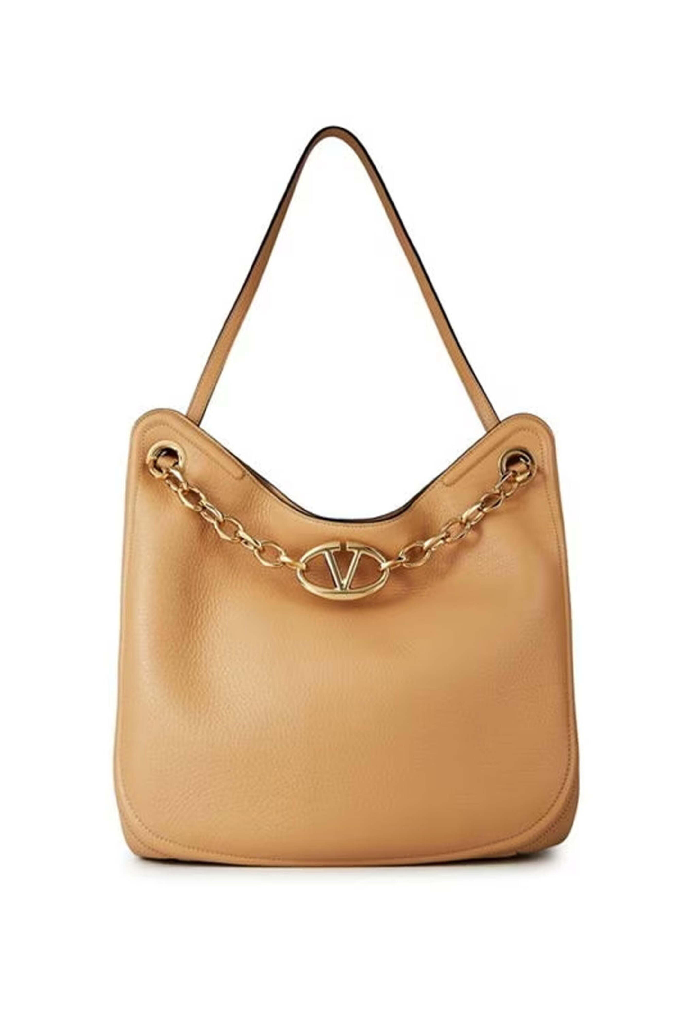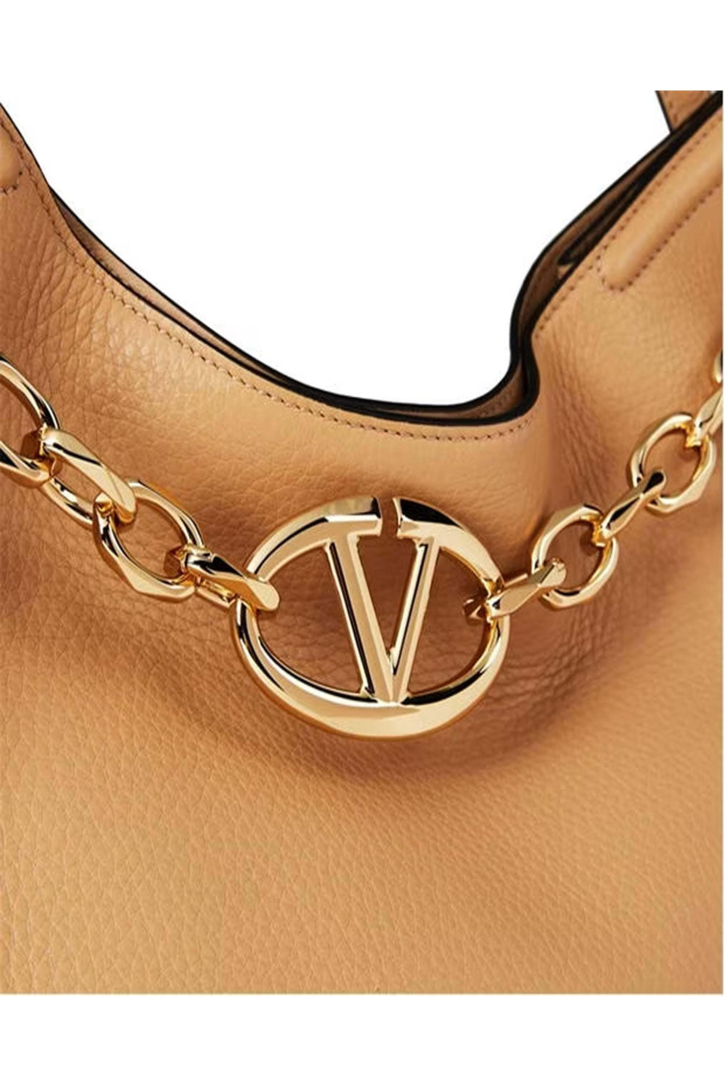 Valentino Vlogo Gate Tote in Cappuccino. Magnetic closure. Shoulder strap. Vlogo chain accent. Interior slip pocket. Leather outer and lining. 16.5W x 13.8H x 4.1D. Made in Italy.