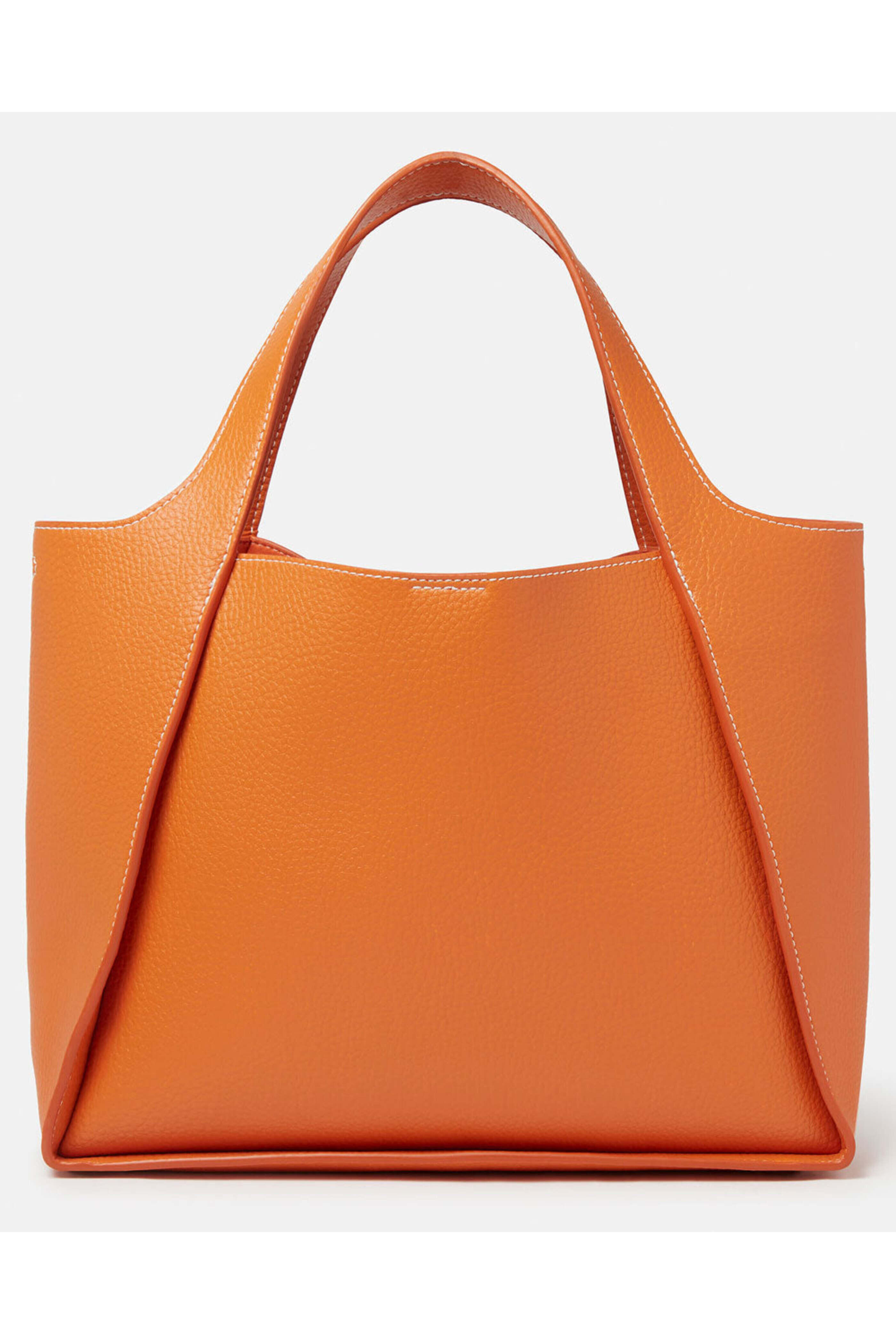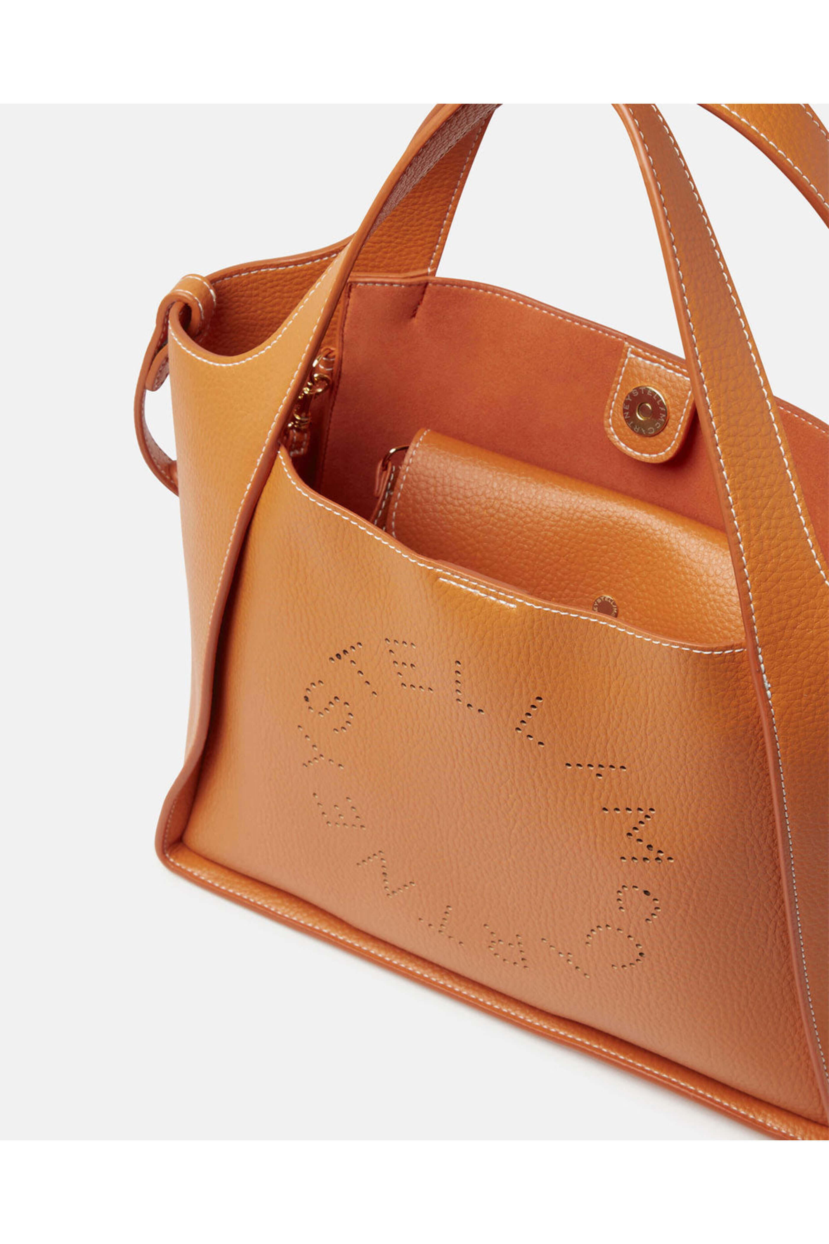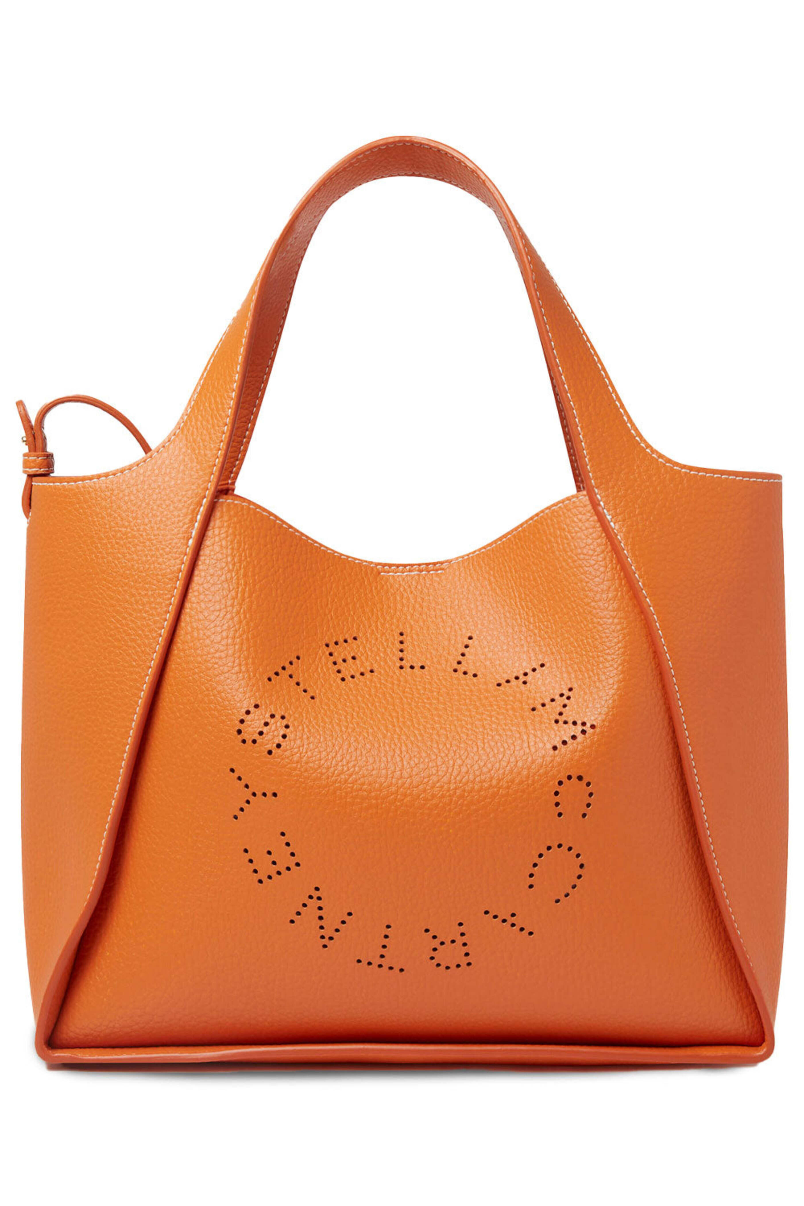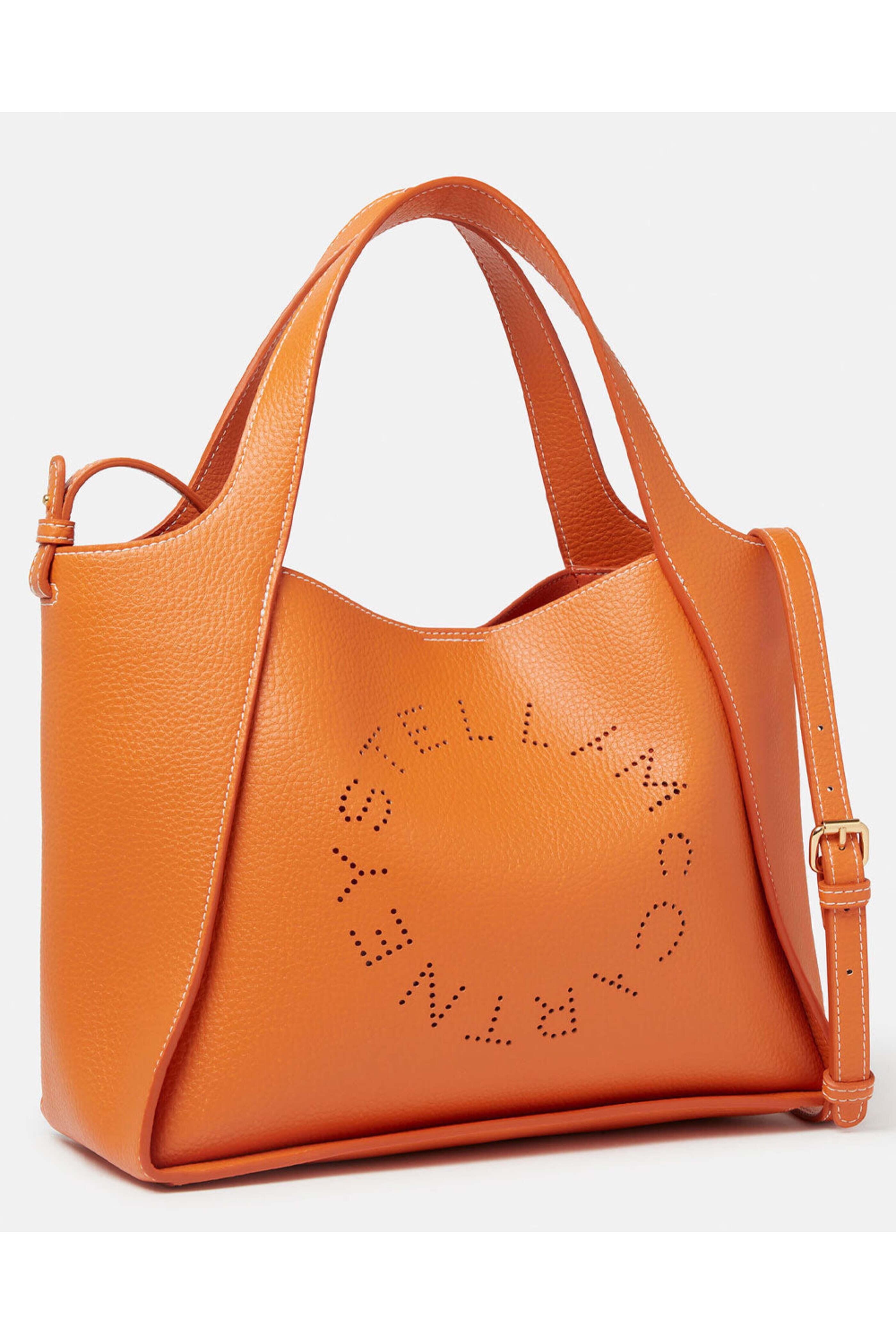 Stella McCartney Logo Grainy Alter Mat Crossbody Bag in Orange . Snap closure. Two top handles. Adjustable crossbody strap. Detachable pouch included. One internal pocket. Stainless steel and recycled brass hardware. Perforated Stella McCartney logo on front. Tonal single topstitching. Grained alter mat vegan leather outer. Vegan suede lining. 12.4 W x 8.6 H x 5.1 D. 19.6 strap drop. 5.9 handle drop. Made in Italy.