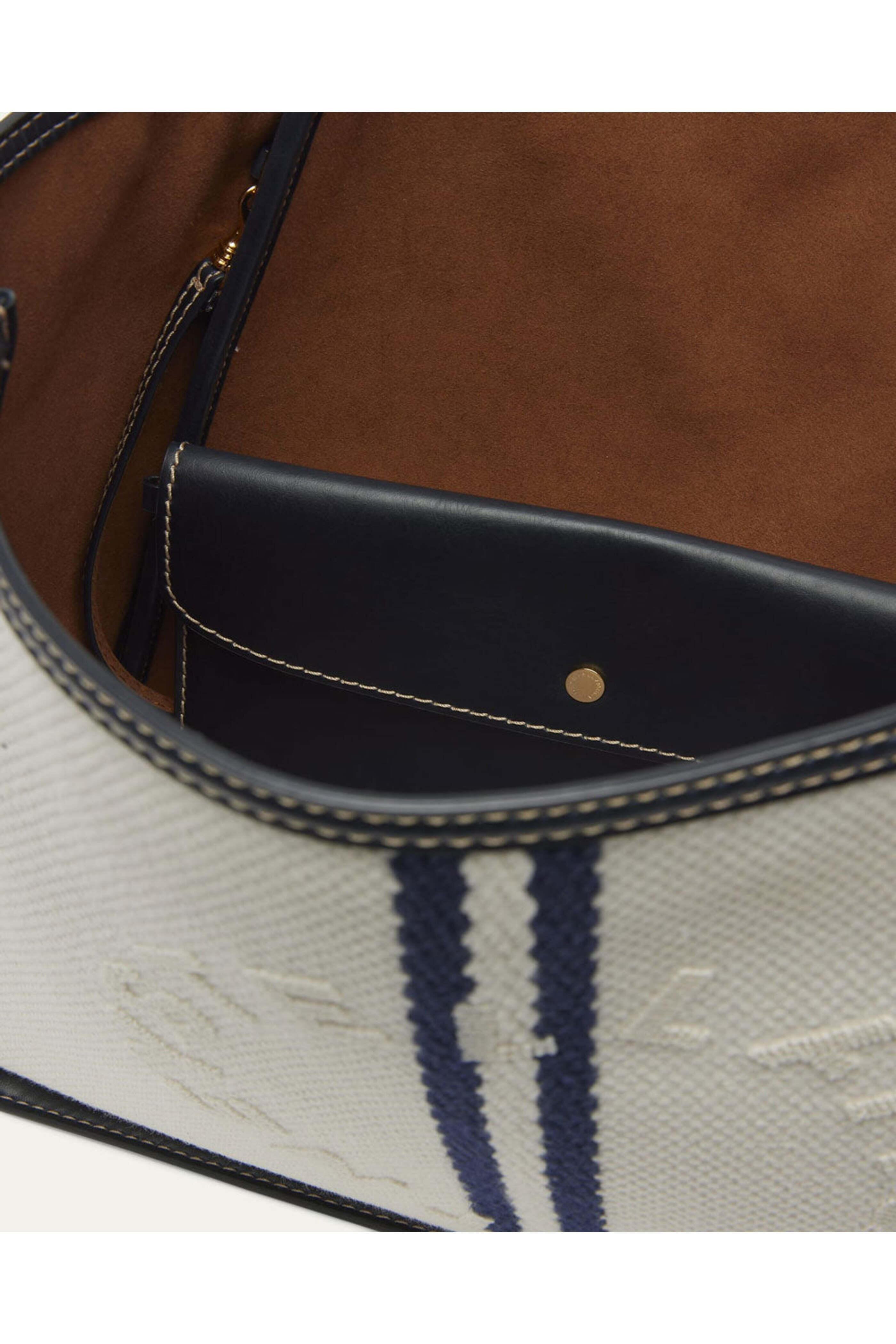 Stella McCartney Logo Striped Eco Canvas Tote Bag in White and Ink. Open top with magnetic closure. Flat shoulder straps. Removeable flap pouch bag. Embroidered logo on front. Canvas cotton outer. Vegan leather lining. 8.3W x 5.9H x 2D. Made in Italy.