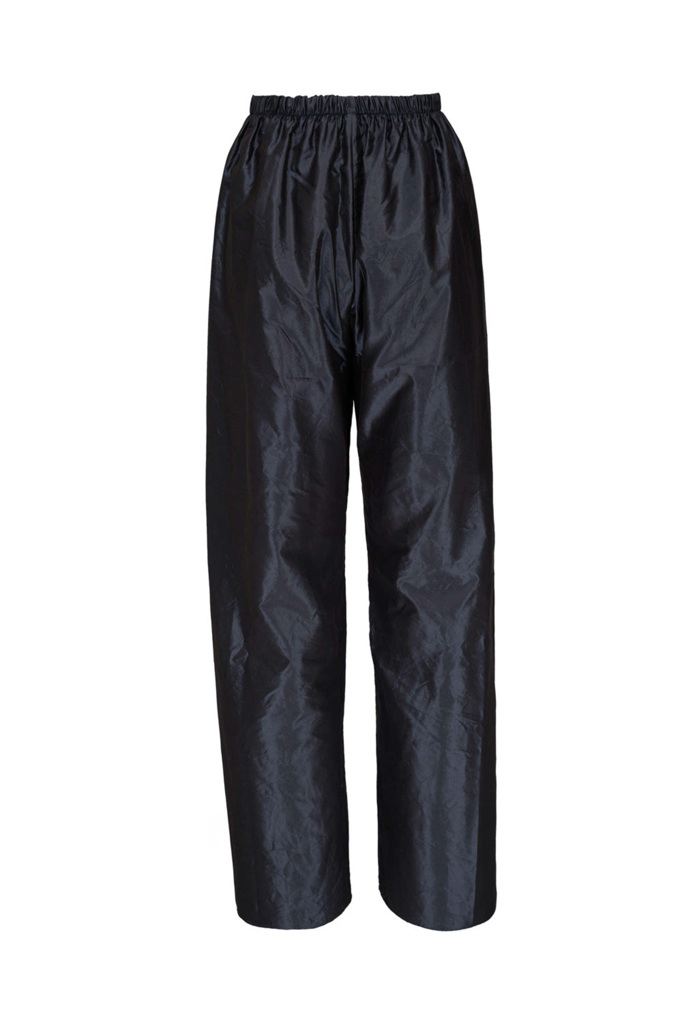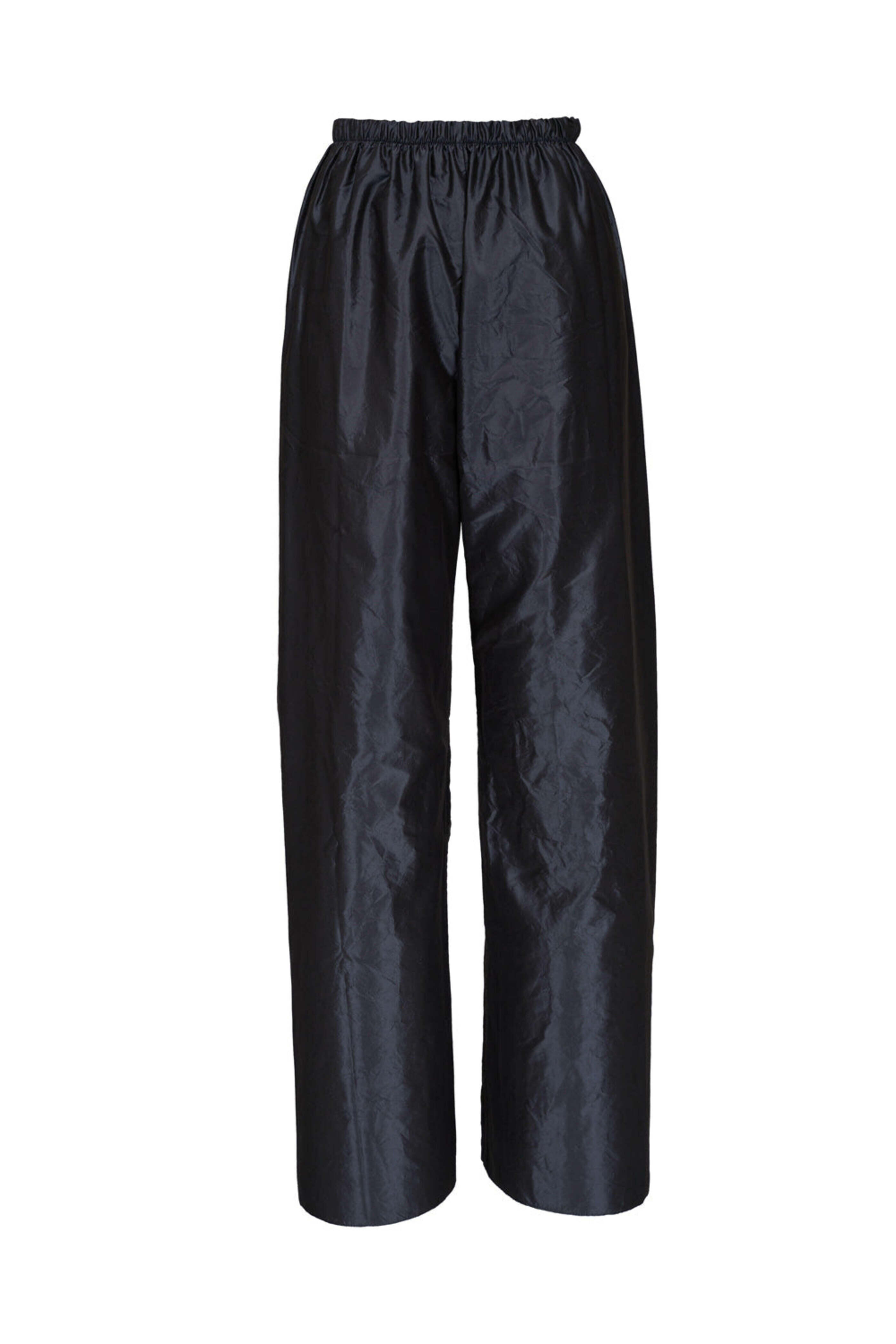Peter Cohen Dark Denim Taffeta Pant. Elastic waist. Wide through leg. Full length. Taffeta fabrication. Made in USA. 100% silk.
