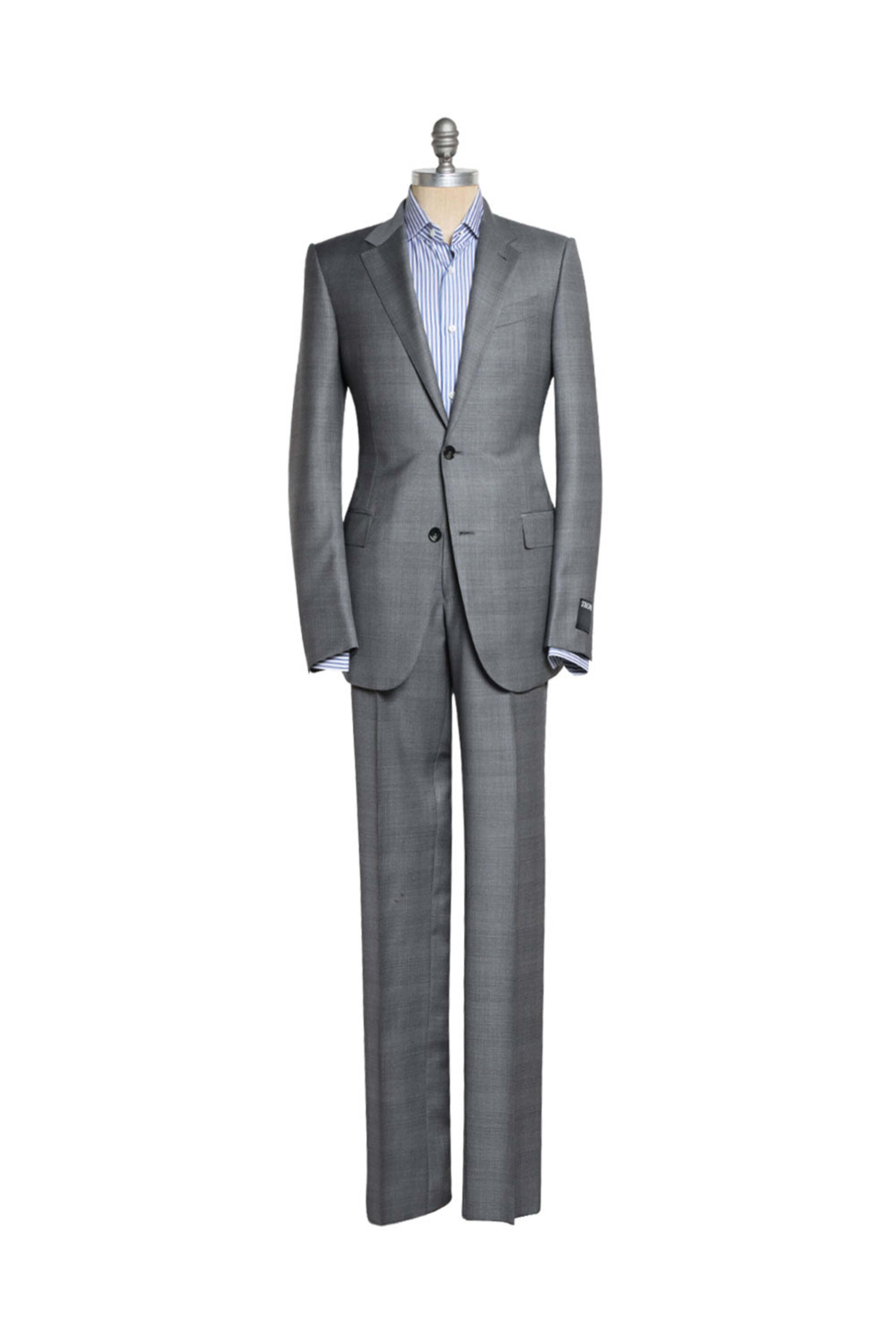 Zegna Grey Wool Tonal Plaid Trofeo Suit. Notch lapels. Two button jacket. Front left chest welt pocket. Waist flap pockets. Double back vents. Unfinished buttonholes. Pick stitch detailing. Drop: 7. Fully lined. Flat front pant: Zip fly. Three button closure. Belt loops. Side pockets. Back welt pocket with button closure. Unfinished hem. Measurements based on size 50: Inseam: 36. Rise: 10.5. Hem opening: 7.25. Cupro lining. Made in Italy. 100% wool.