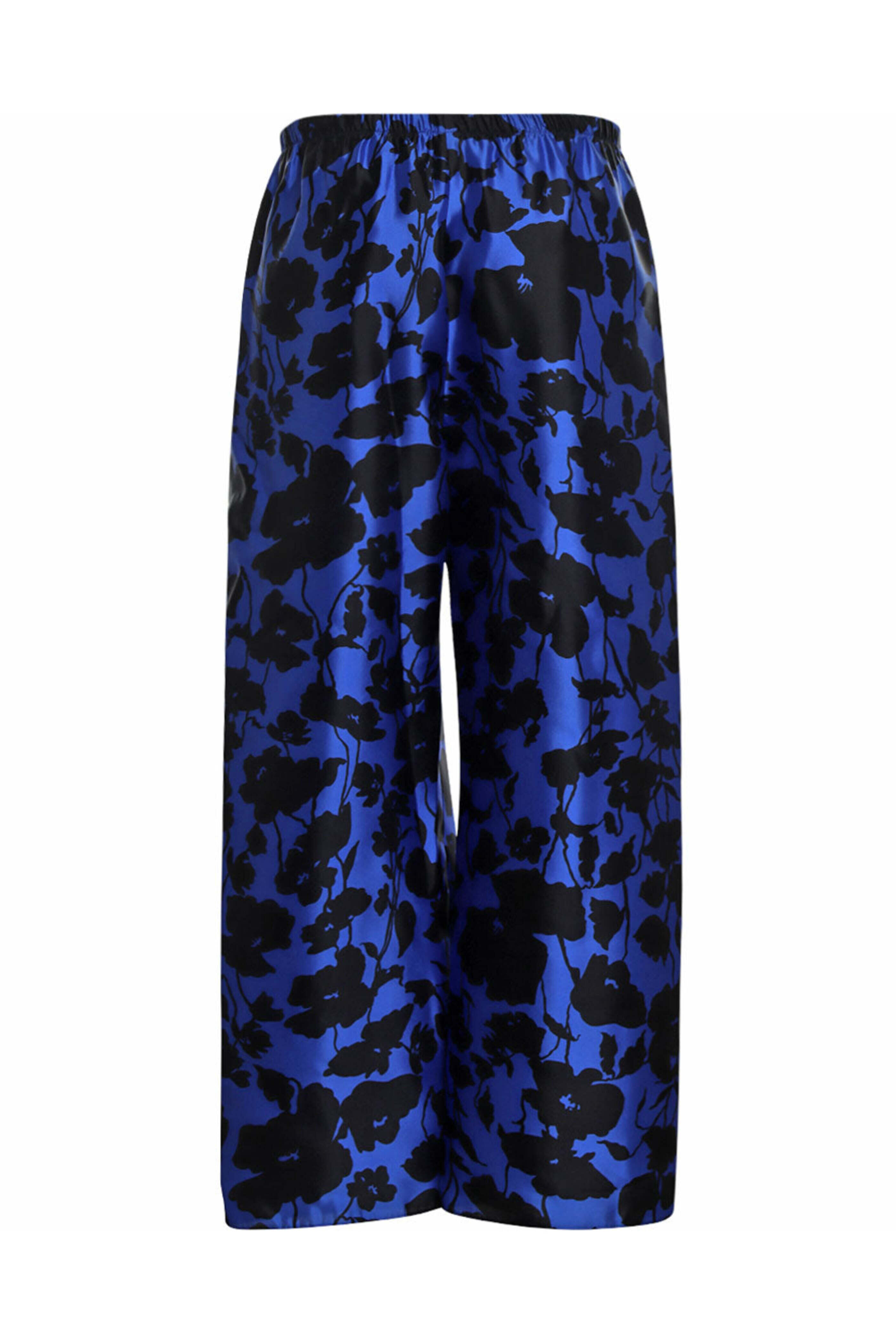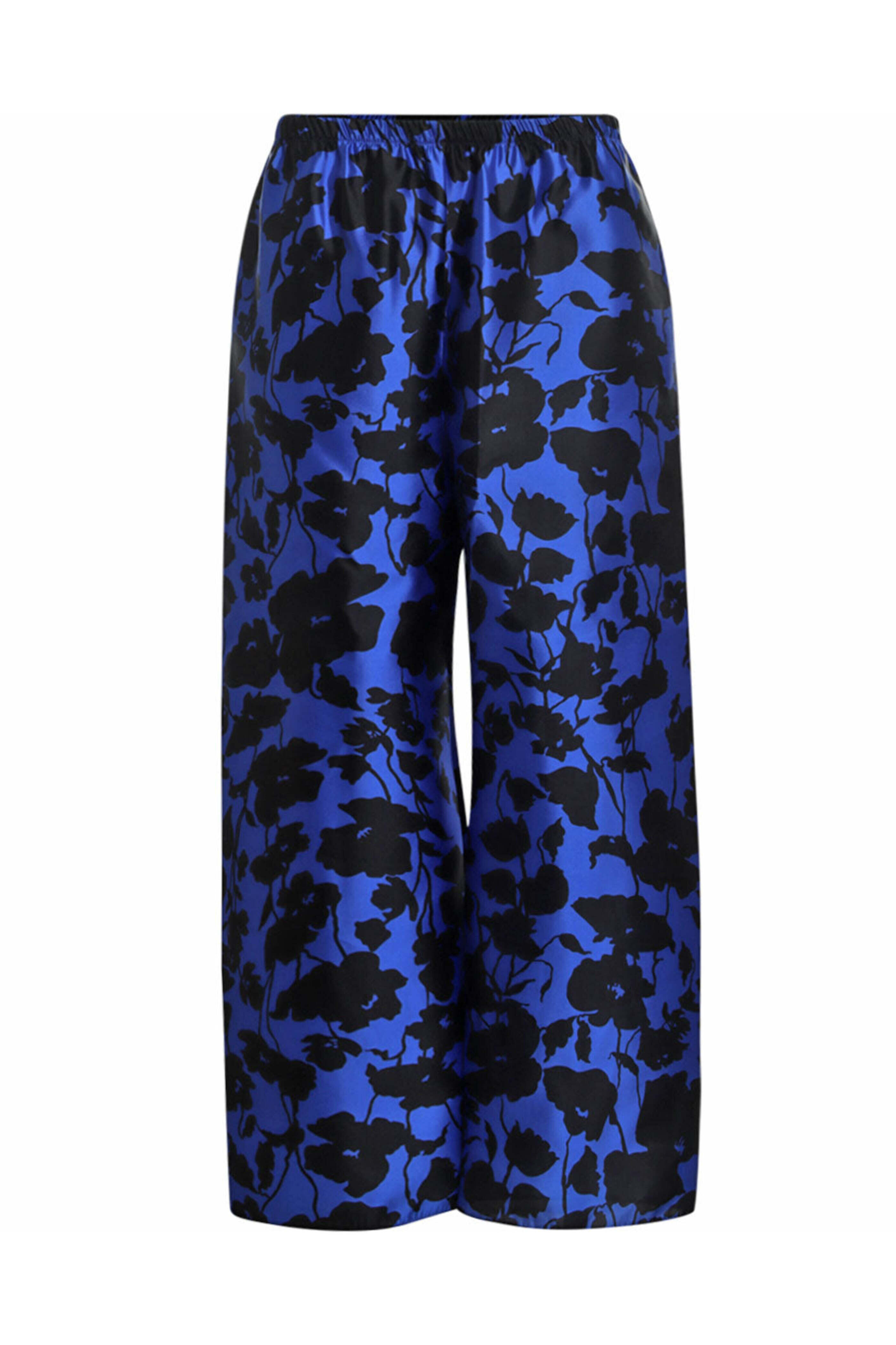 Peter Cohen Blue Floral Crop Pant. High rise. Elastic waist. Relaxed fit. Straight through leg. Ankle length. Made in USA. 100% silk.