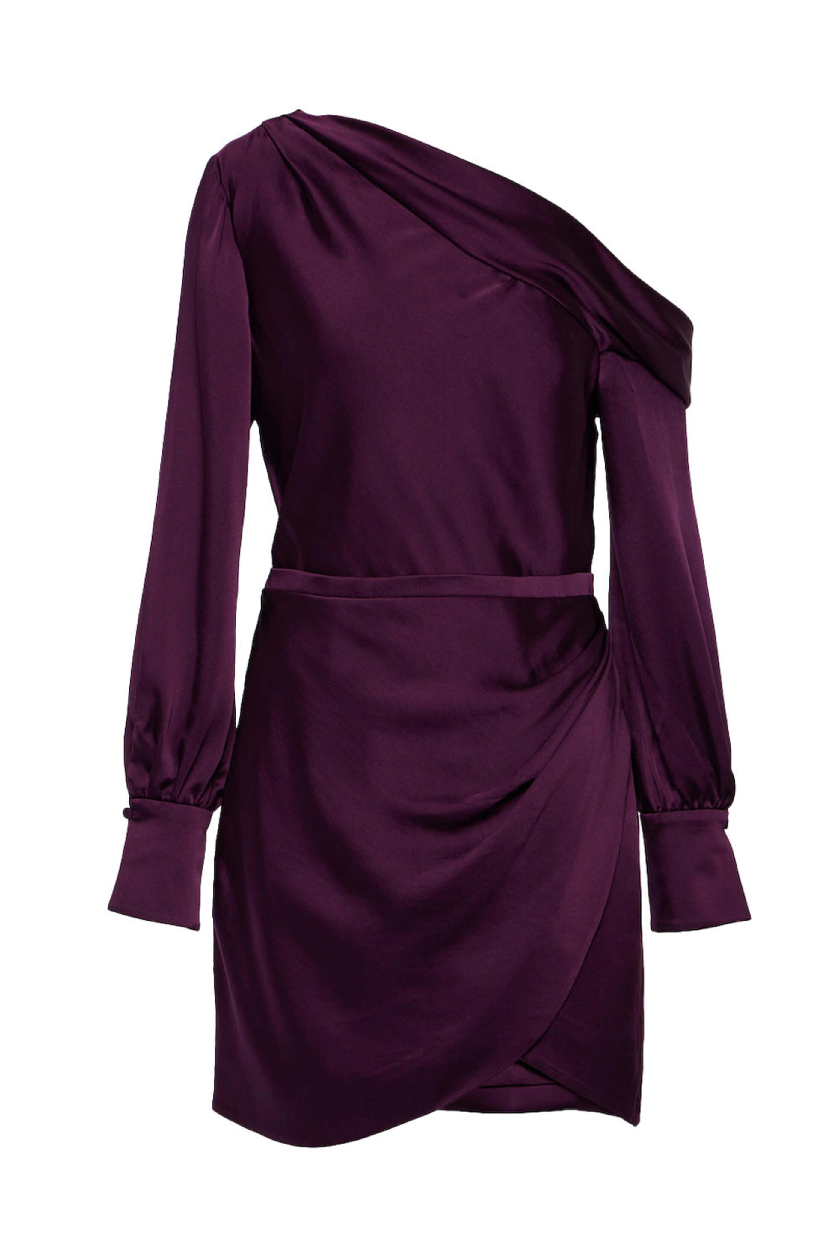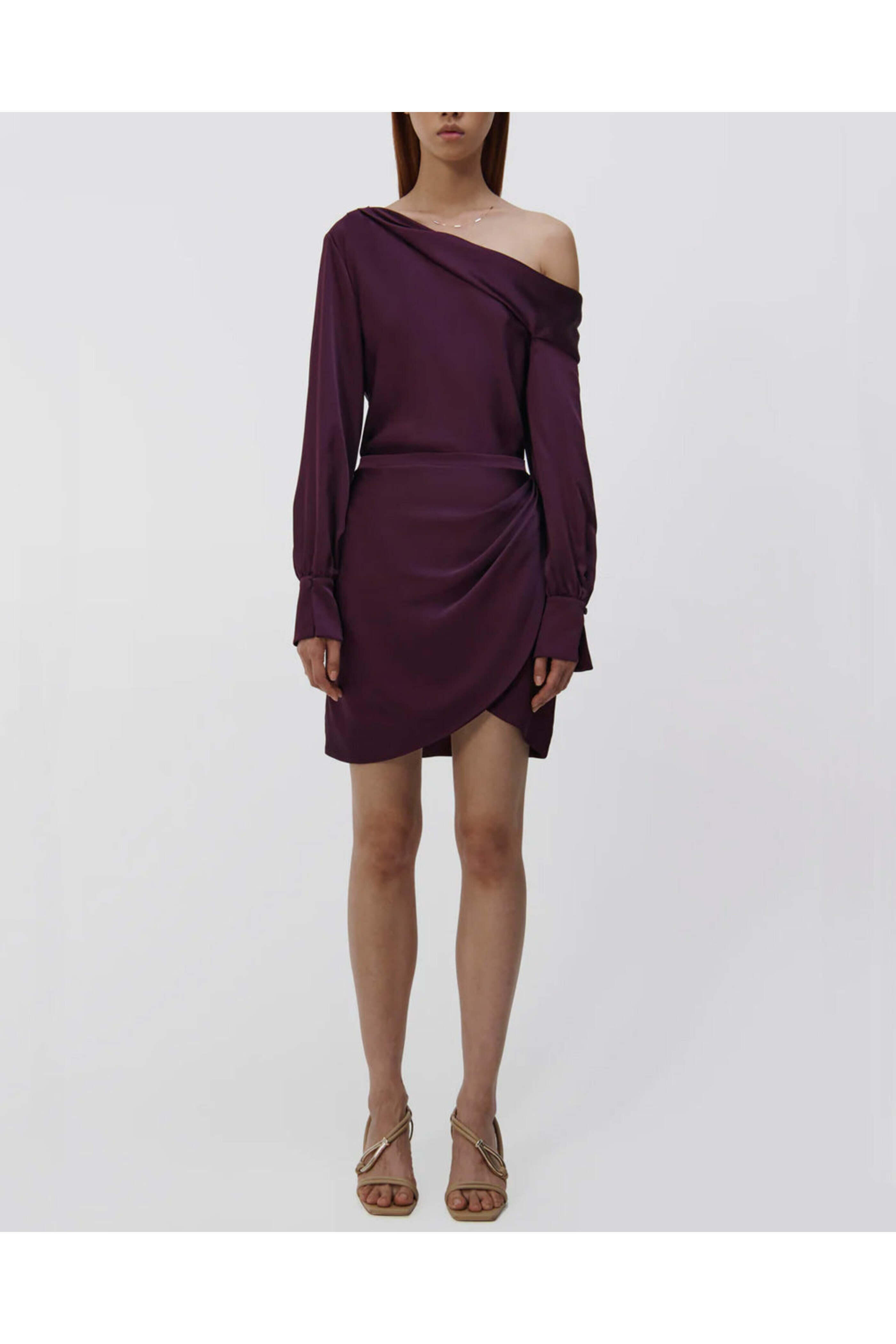 SIMKHAI Plum Cameron Single Shoulder Dress. Off the shoulder neck. Long sleeves; button cuffs. Banded waist. Concealed side zip closure. Tulip hem. Mini length. Lined. 89% acetate, 11% polyethylene outer, 100% polyester lining.