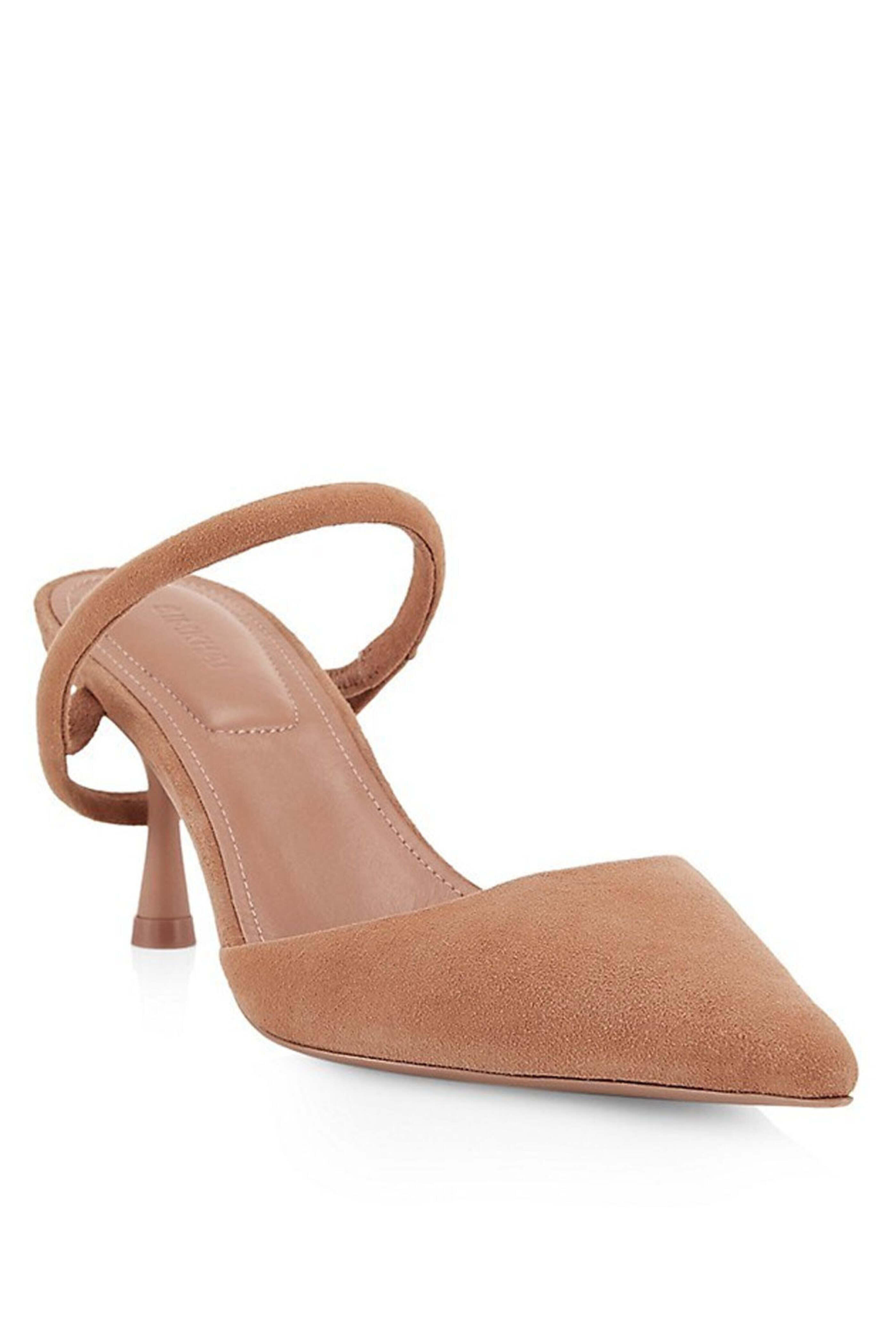 Simkhai Wrap Pumps in Toffee. Pointed toe. Slip on. Wrap around strap. Suede upper. Sheep leather lining. Cow leather sole. 5 (65 mm) stiletto heel.