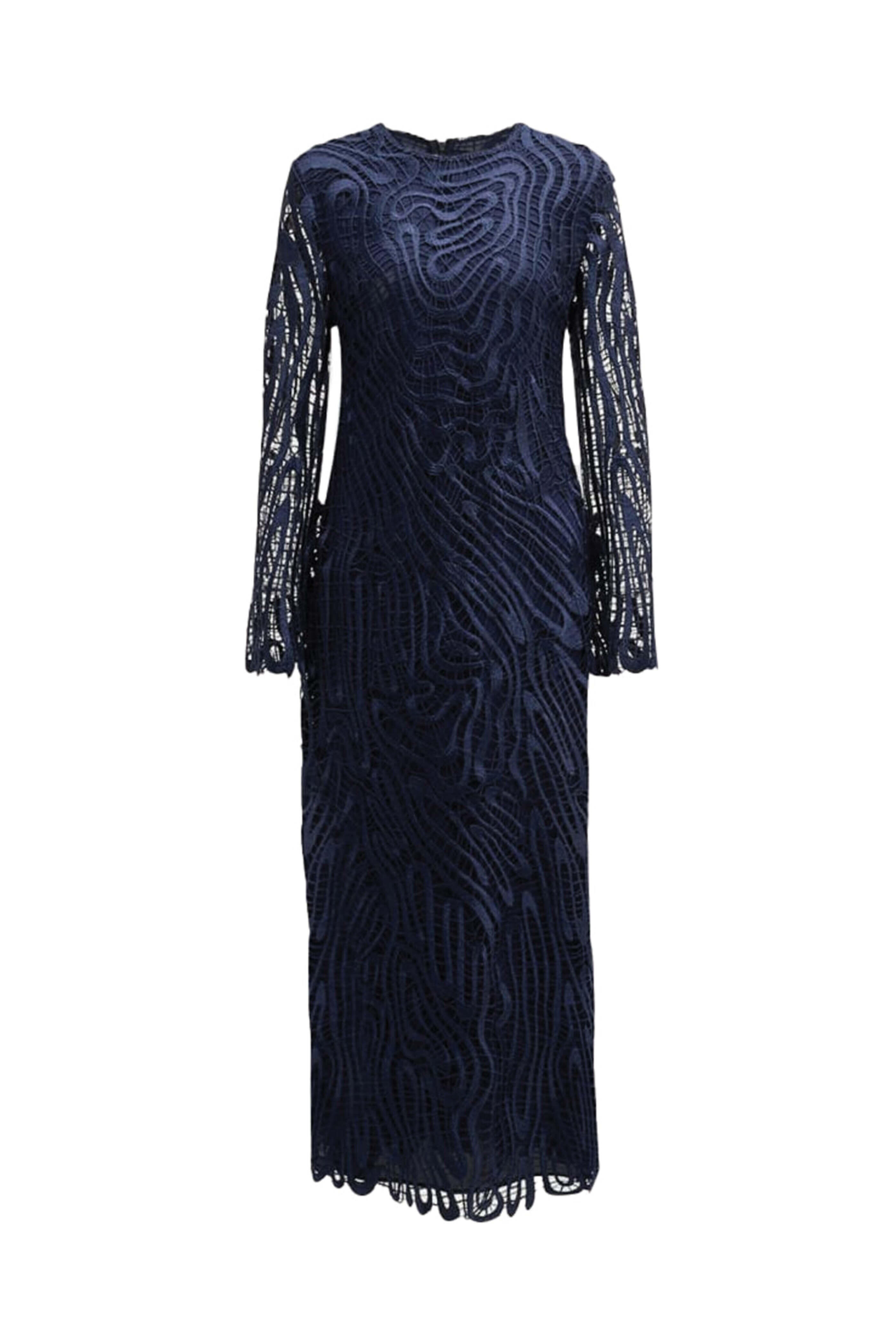 SIMKHAI Midnight Vanina Midi Dress. Round neck. Long sleeves. Concealed back zip closure. Slim silhouette. Midi length. Lined. Polyester, rayon, acetate outer, polyester lining.