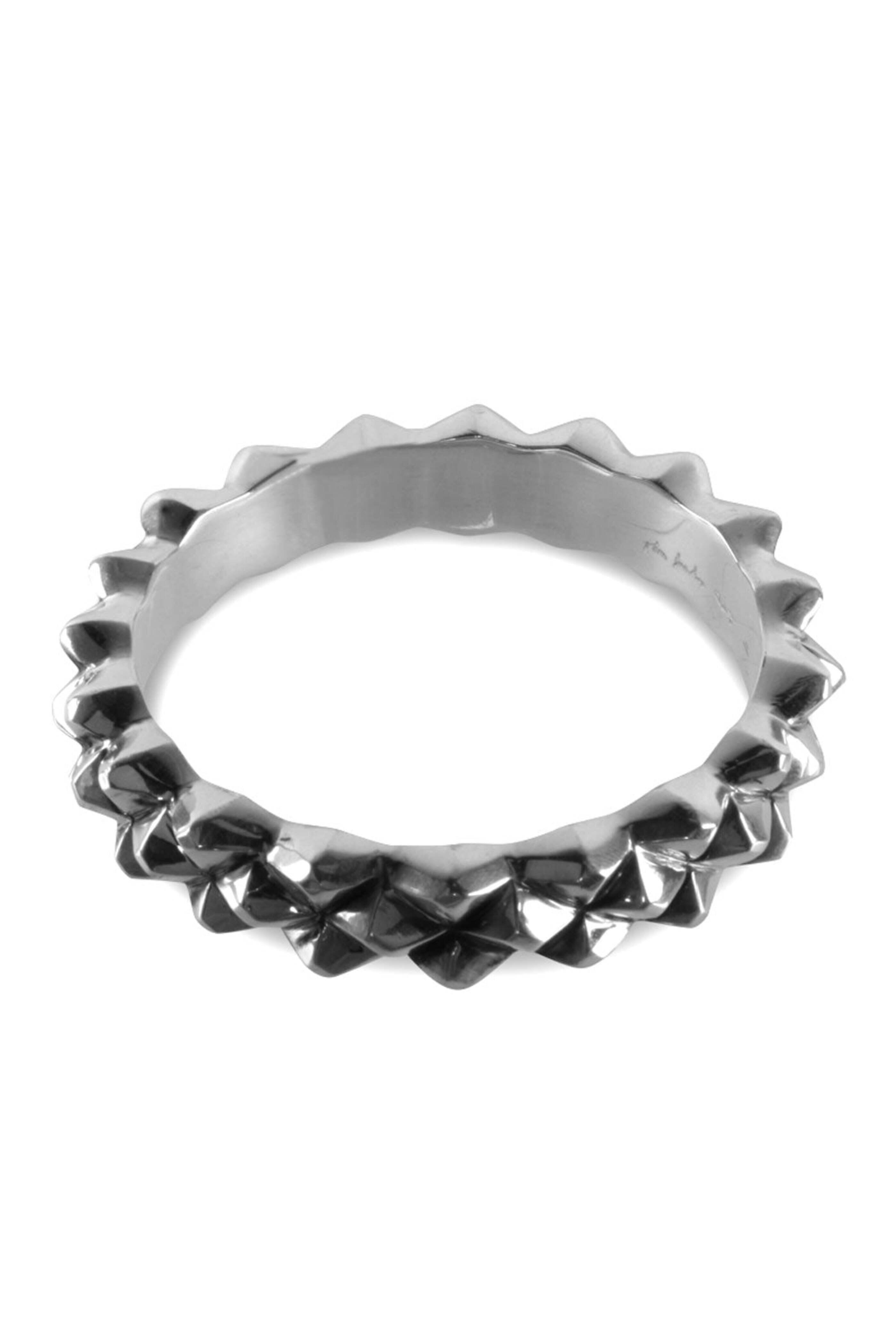 Sterling silver. Diamond cut detailing. Slip-on. Bangle style. Manufactured in New York City. Diameter: 2.5”.