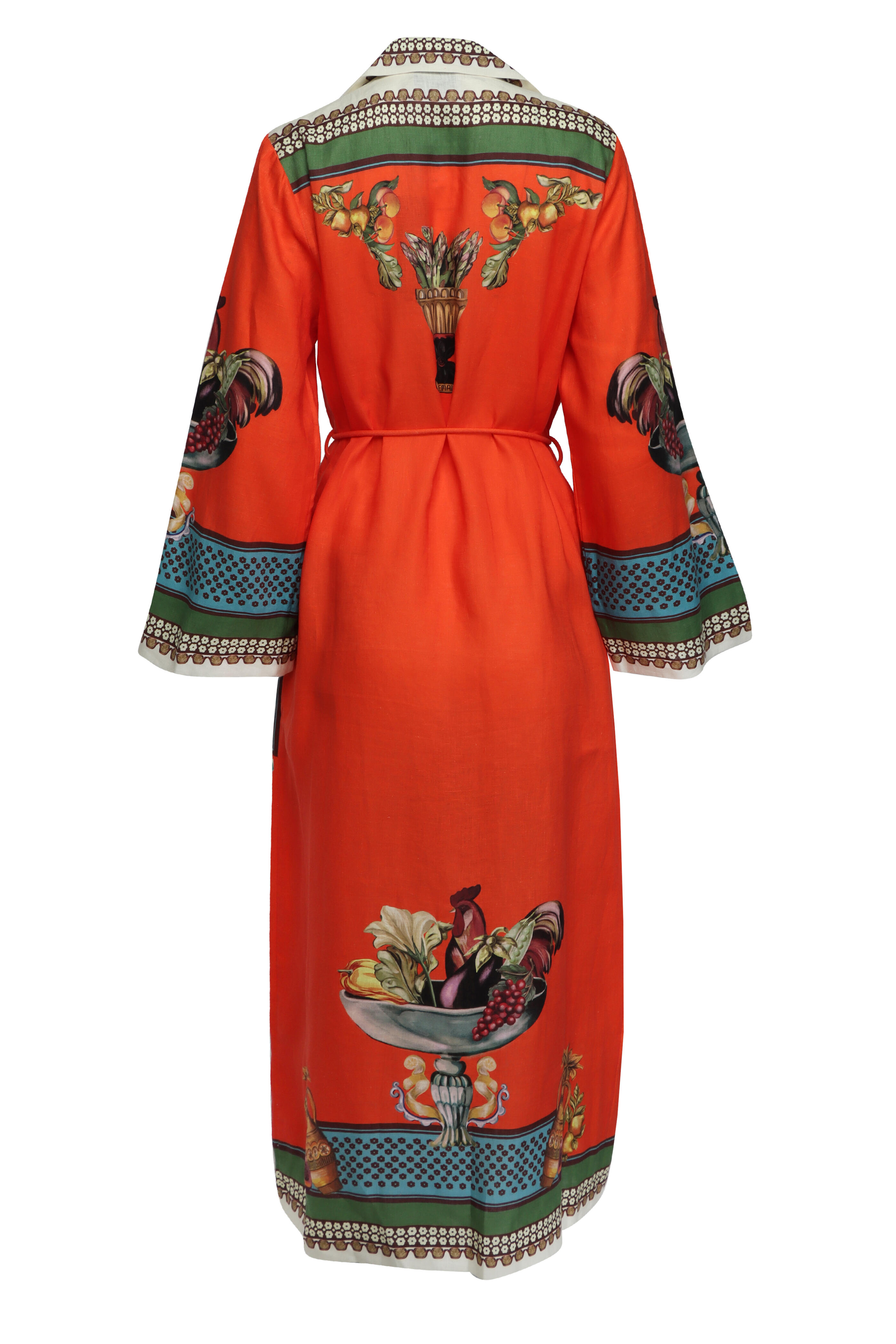 Notch collar. Long wide sleeves. Button up front closure. Removable self-tie belt. Side slip pockets. Relaxed fit. Imported. Bust 42” (US 4). Waist 42.5” (US 4). Hip 45” (US 4). Sleeve 31.5” (US 4). Length 53” (US 4). 100% linen. Handwash.