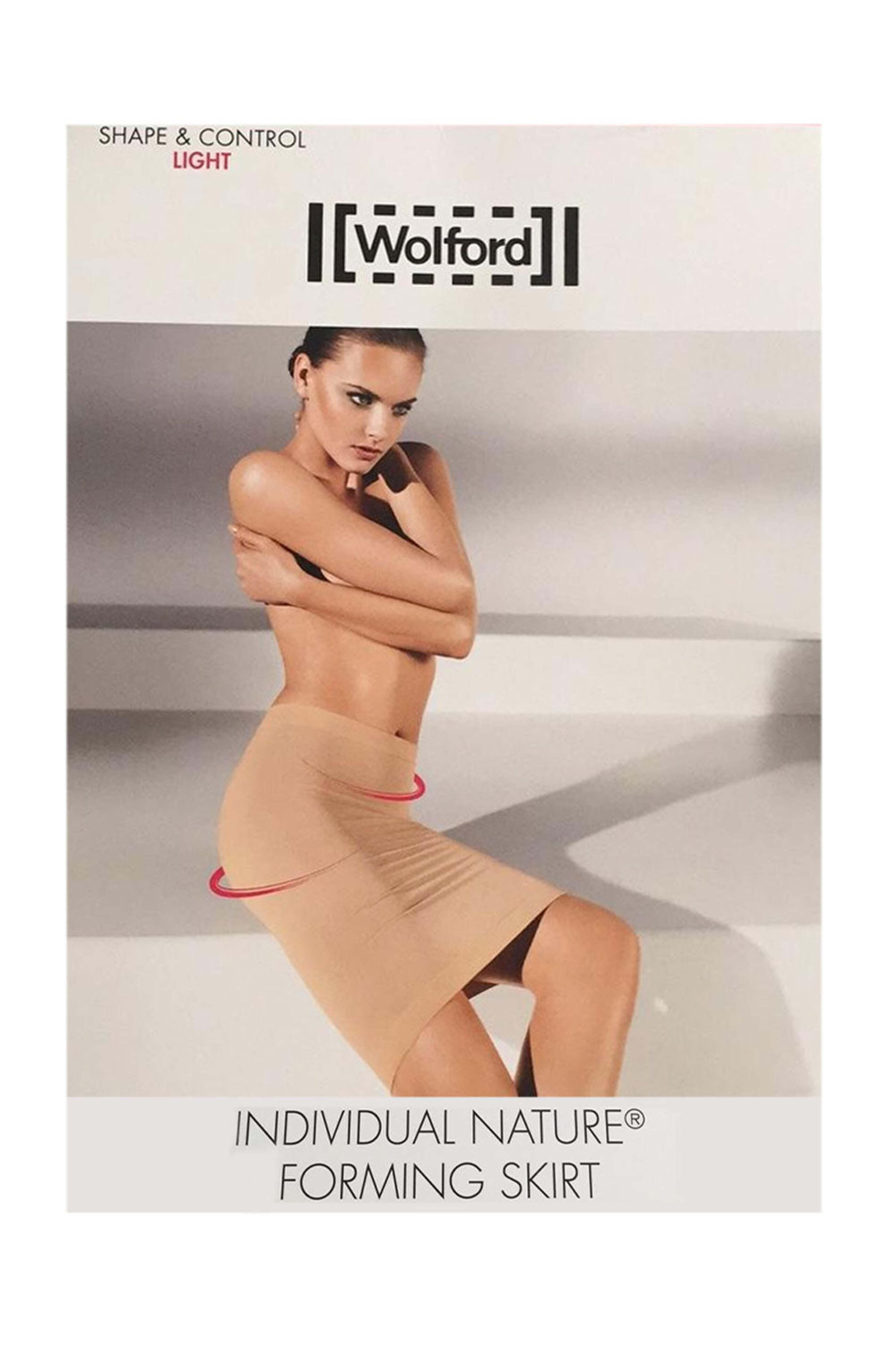 Wolford Nude Individual Nature Forming Skirt. Slips on. High rise. Fitted silhouette. Ribbed trims. Seamless. 49% cupro, 35% polyamide, 16% elastane.