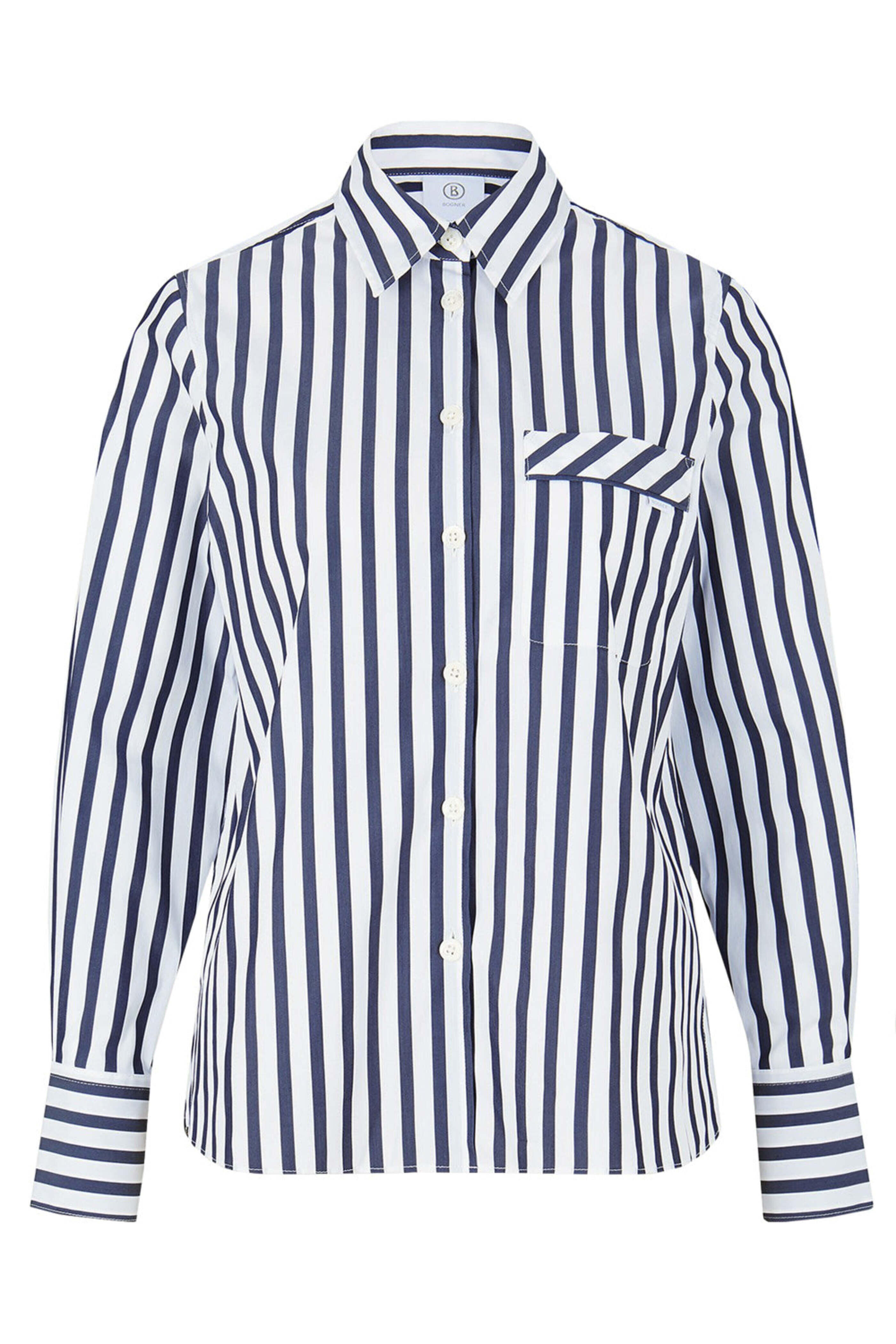 Bogner Navy Stripe Lisann Shirt. Collared. Long sleeves; button cuffs. Button down front closure. Single chest pocket. Boxy fit. Side hem slits. 75% cotton, 21% polyamide, 4% elastane.