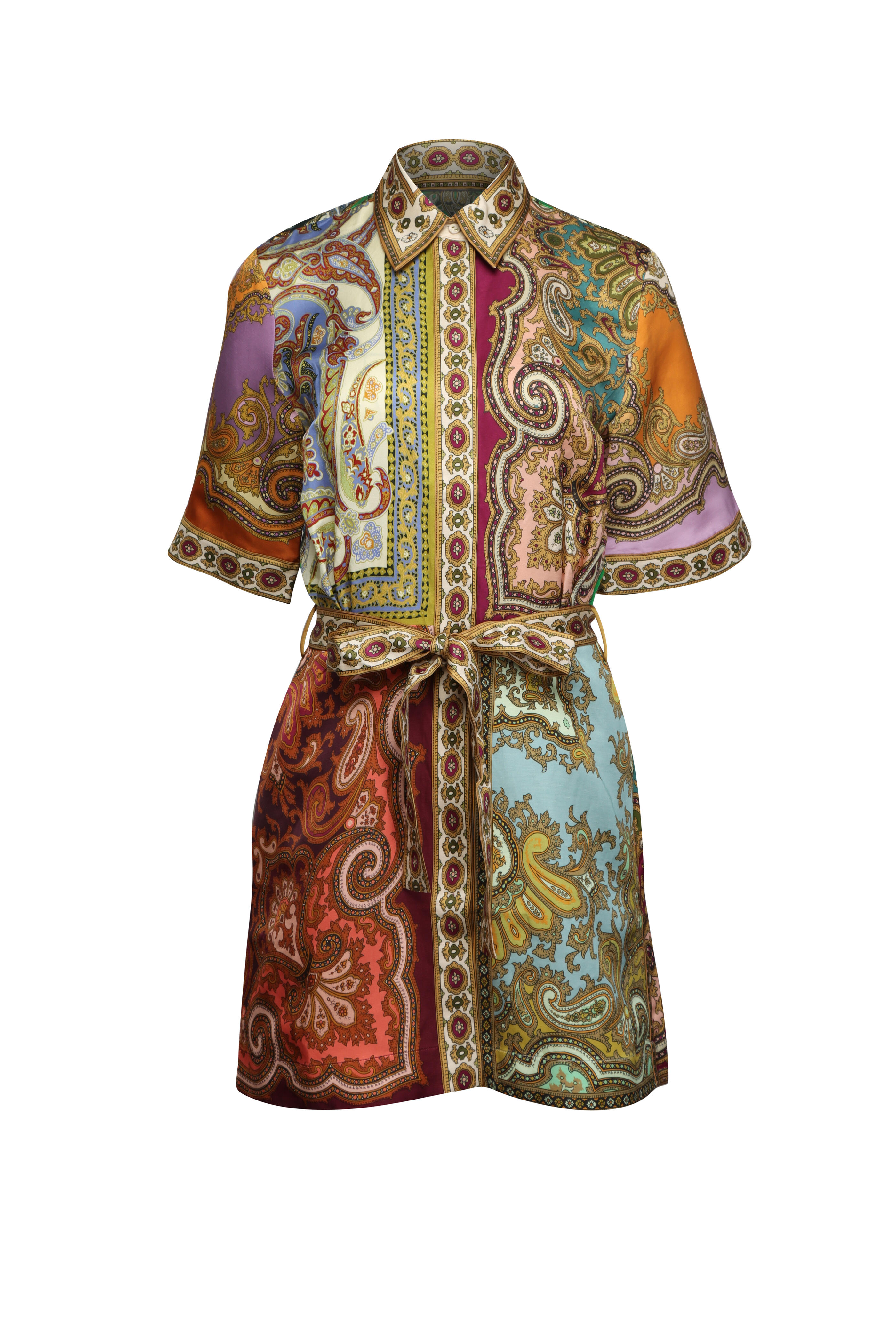 Collar. Elbow length wide sleeves. Concealed button up front closure. Removable self-tie belt; self-fabrication. Side slip pockets. Relaxed fit. Imported. Bust 39” (US 4). Waist 28” (US 4). Hip 41” (US 4). Sleeve 20” (US 4). Length 34.5” (US 4). 56% linen, 44% viscose. Dry clean.