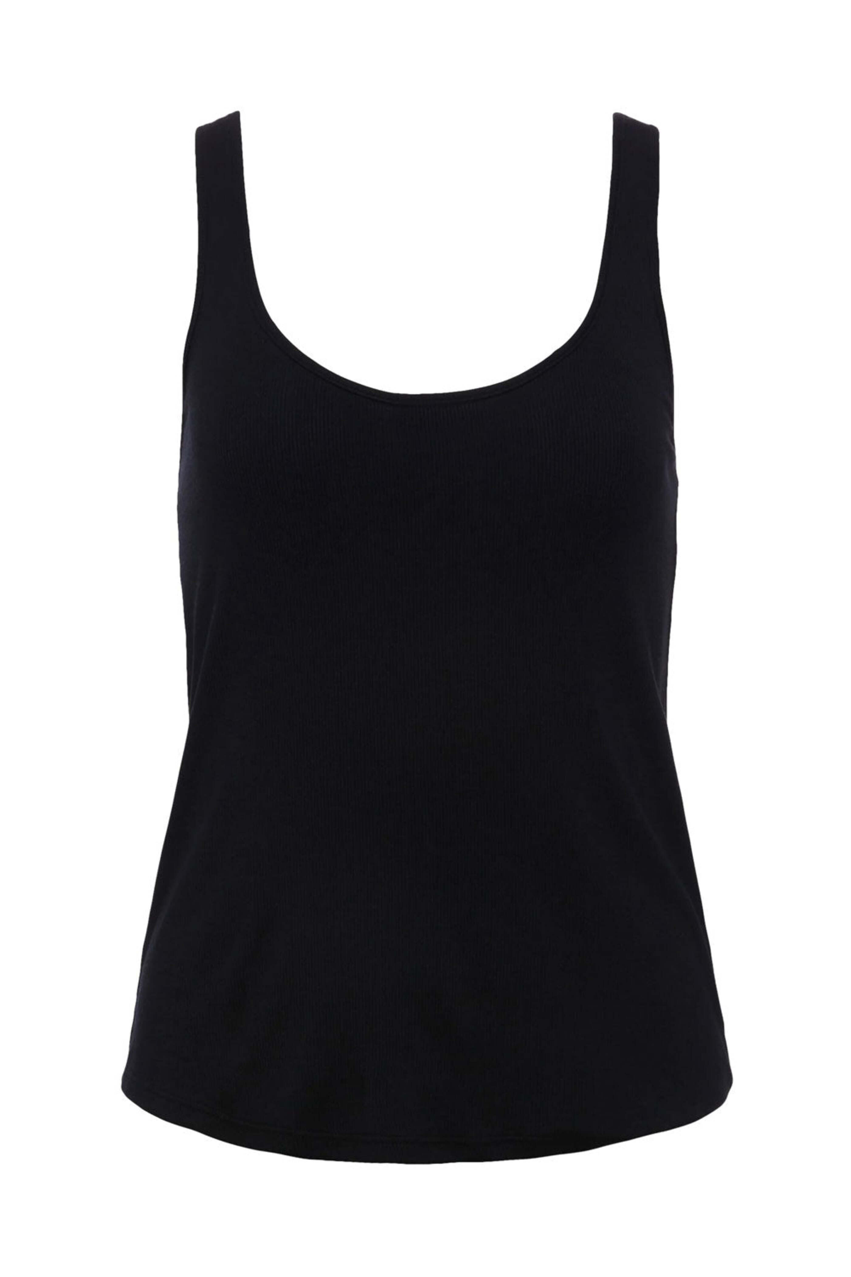 LAgence Black Scoop Neck Celia Tank. Scoop neck. Scoop back. Sleeveless. Ribbed throughout. Slim fit. Straight hem. 95% micro modal, 5% spandex.