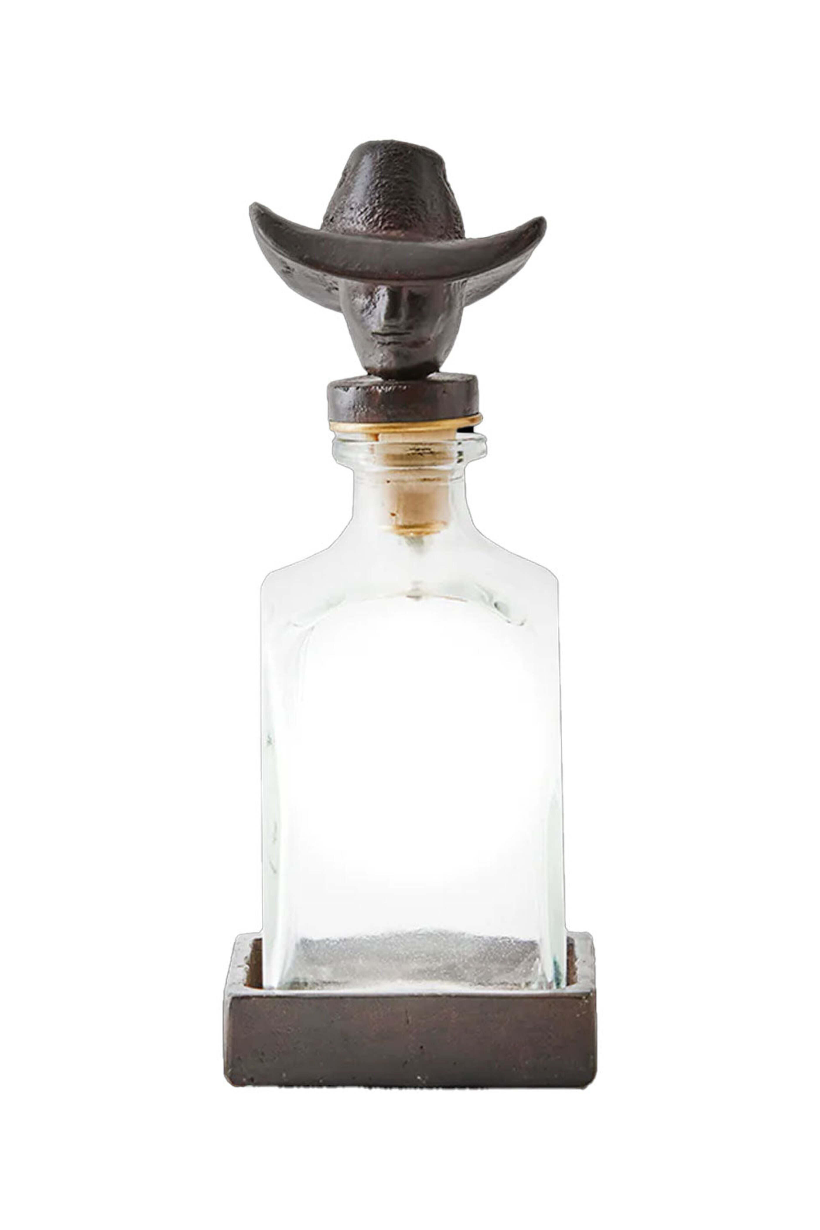 - Cowboy wax cast iron decanter topper with vintage style glass bottle and iron coaster