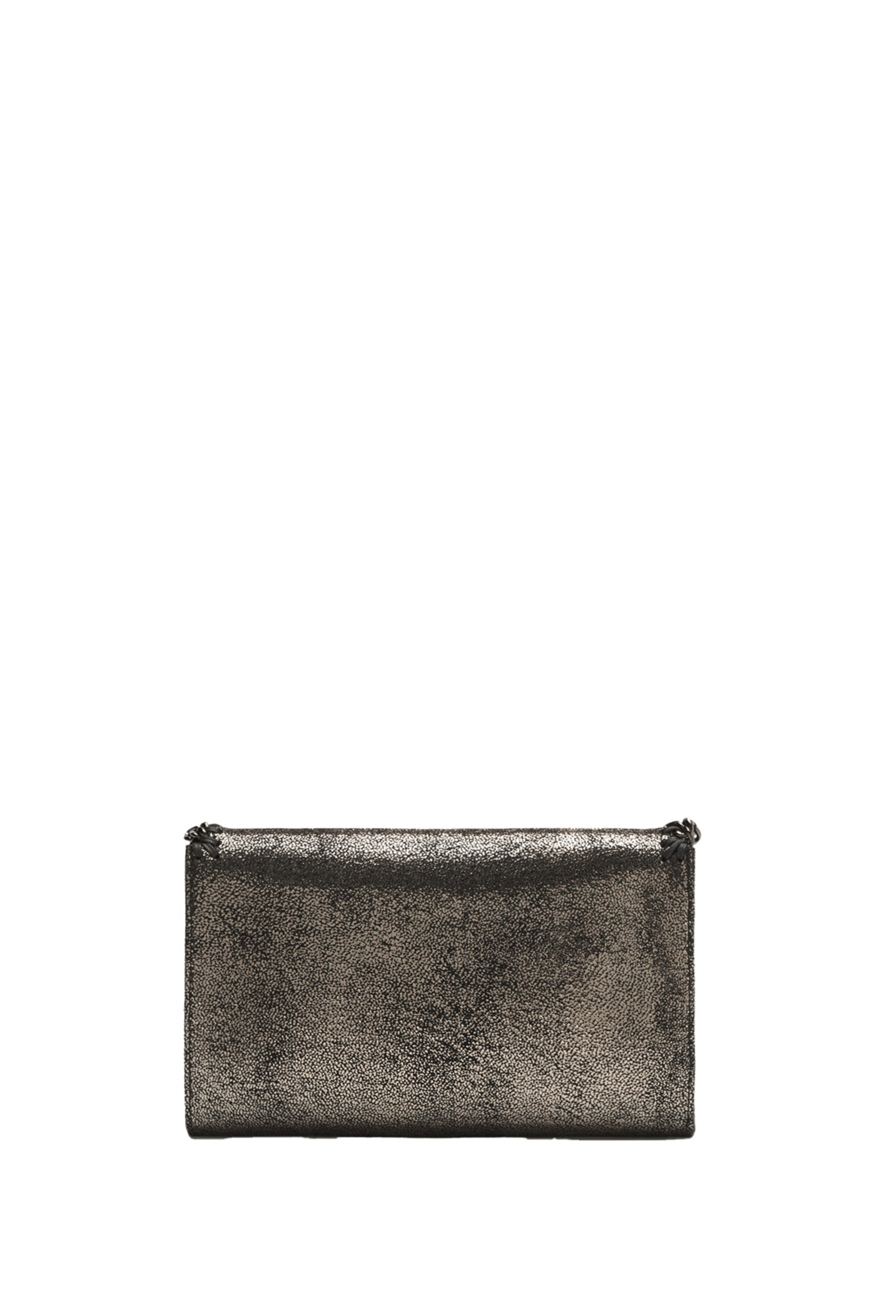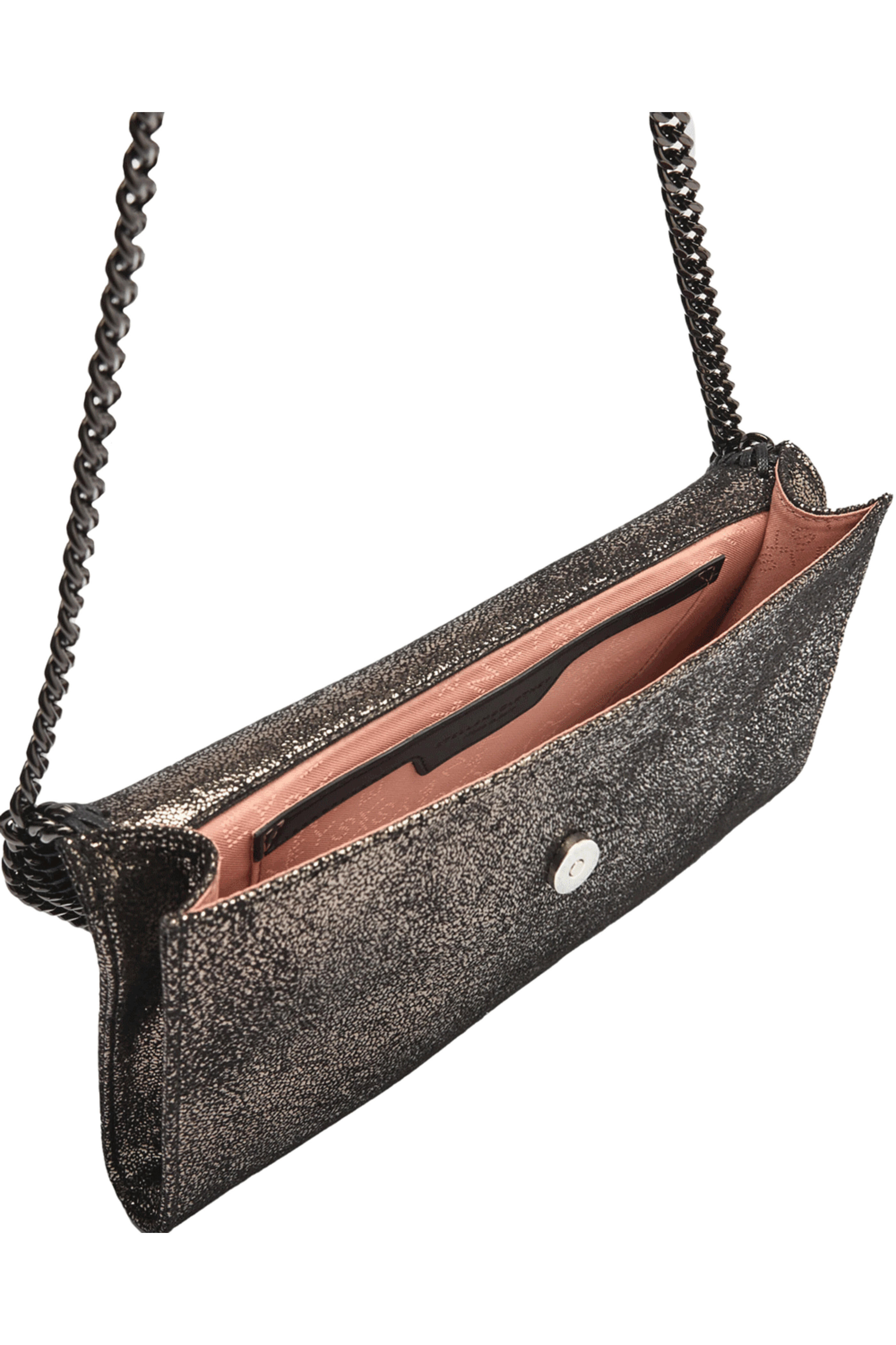 Vegan leather outer. Magnetic closure. Recycled brass and aluminum diamond-cut chain. Logo charm. Internal slip pocket. Whipstitch trim. Metallic finish. Recycled polyester lining. Made in Italy. 8.6 x 5.5 x 0.9. 1.3 handle drop. 20.4 shoulder strap drop.