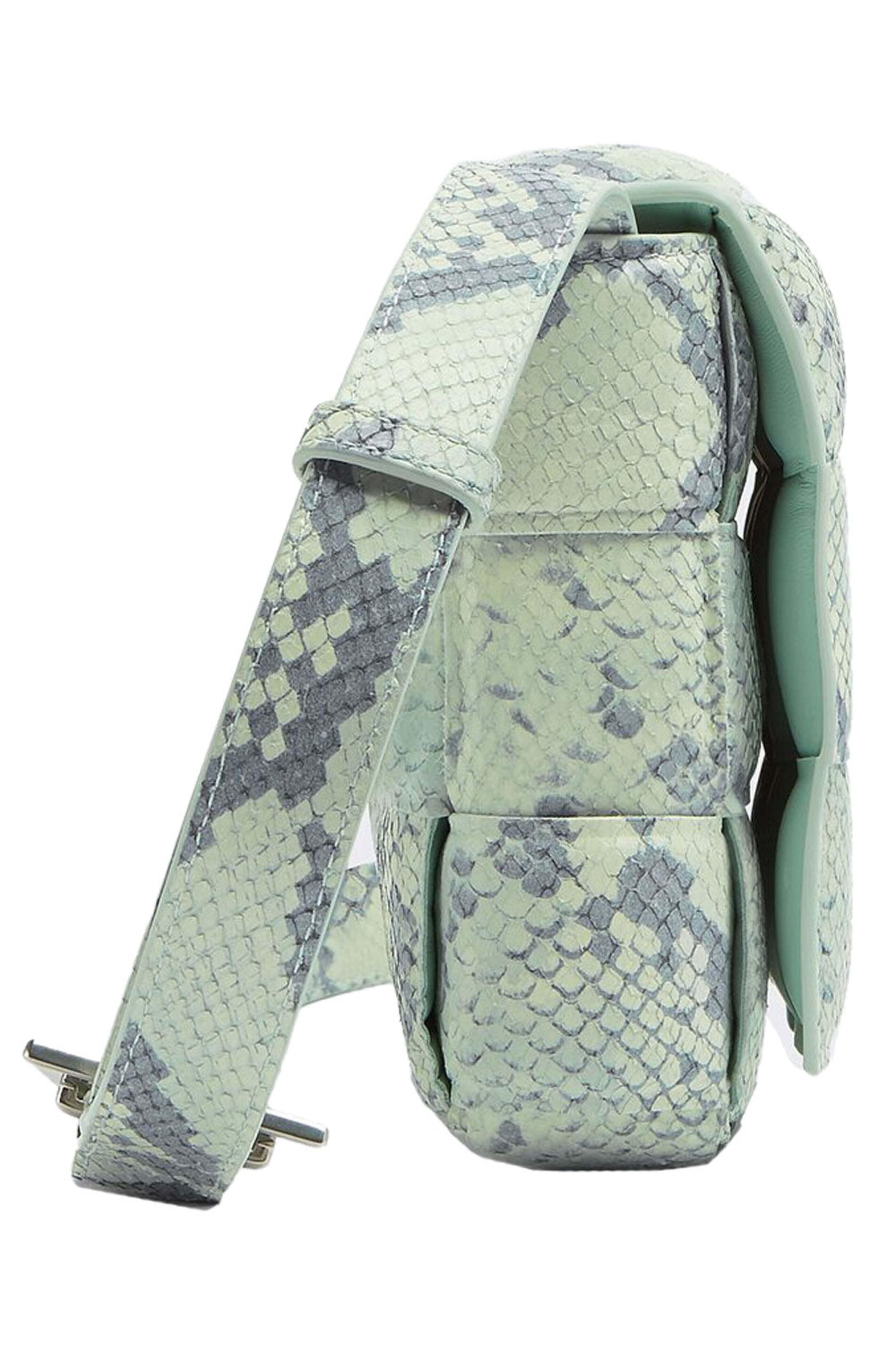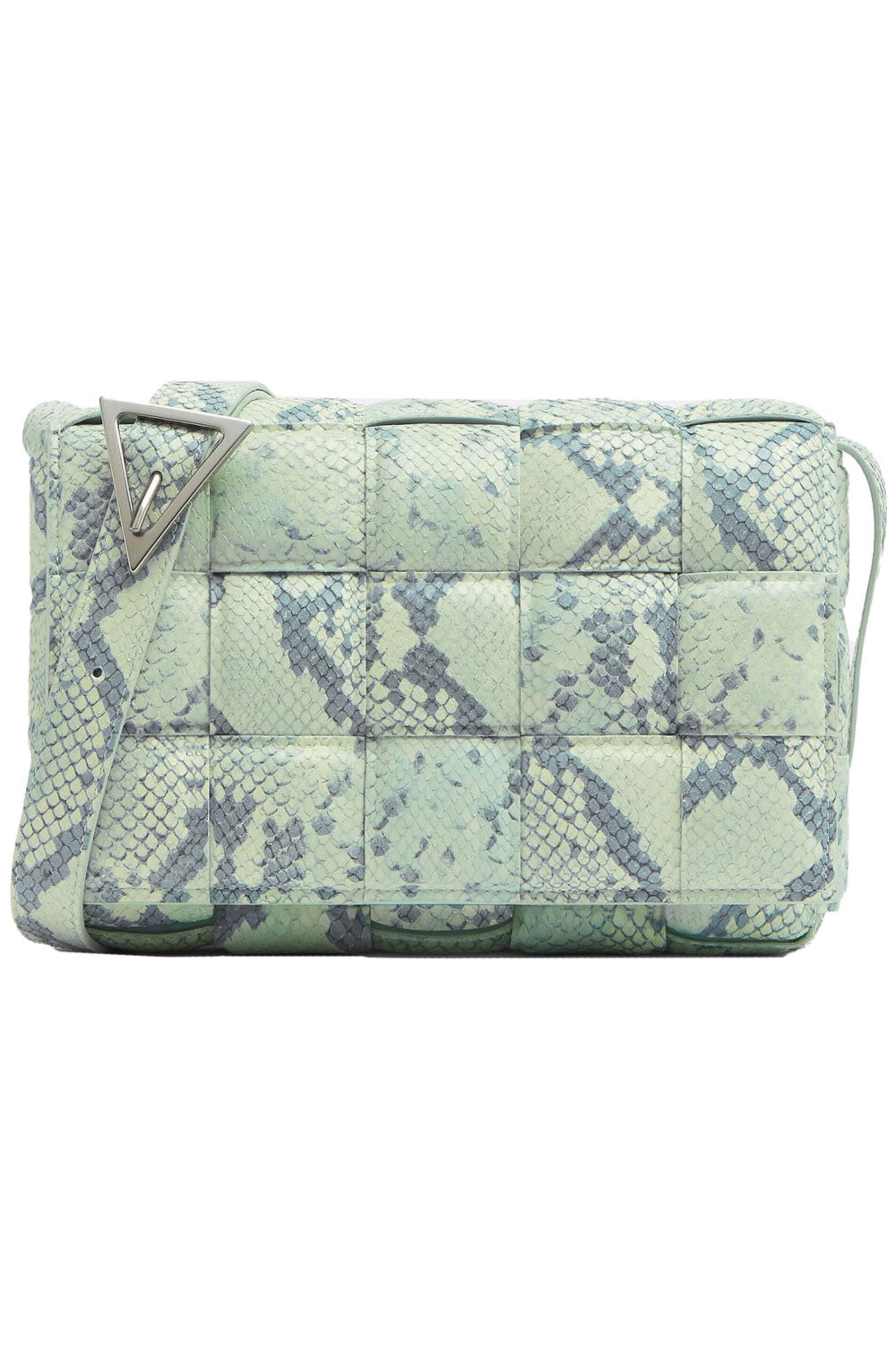 Bottega Veneta Padded Cassette Bag in Dew. Flap top with metal push closure. Adjustable crossbody strap. Interior zip pocket. Silver tone hardware. Faded python printed Intreccio leather. Bonded lambskin lining. 10.2 W X 7.1 H X 3.1 D. 19.7 strap drop. Made in Italy. 100% goatskin outer.