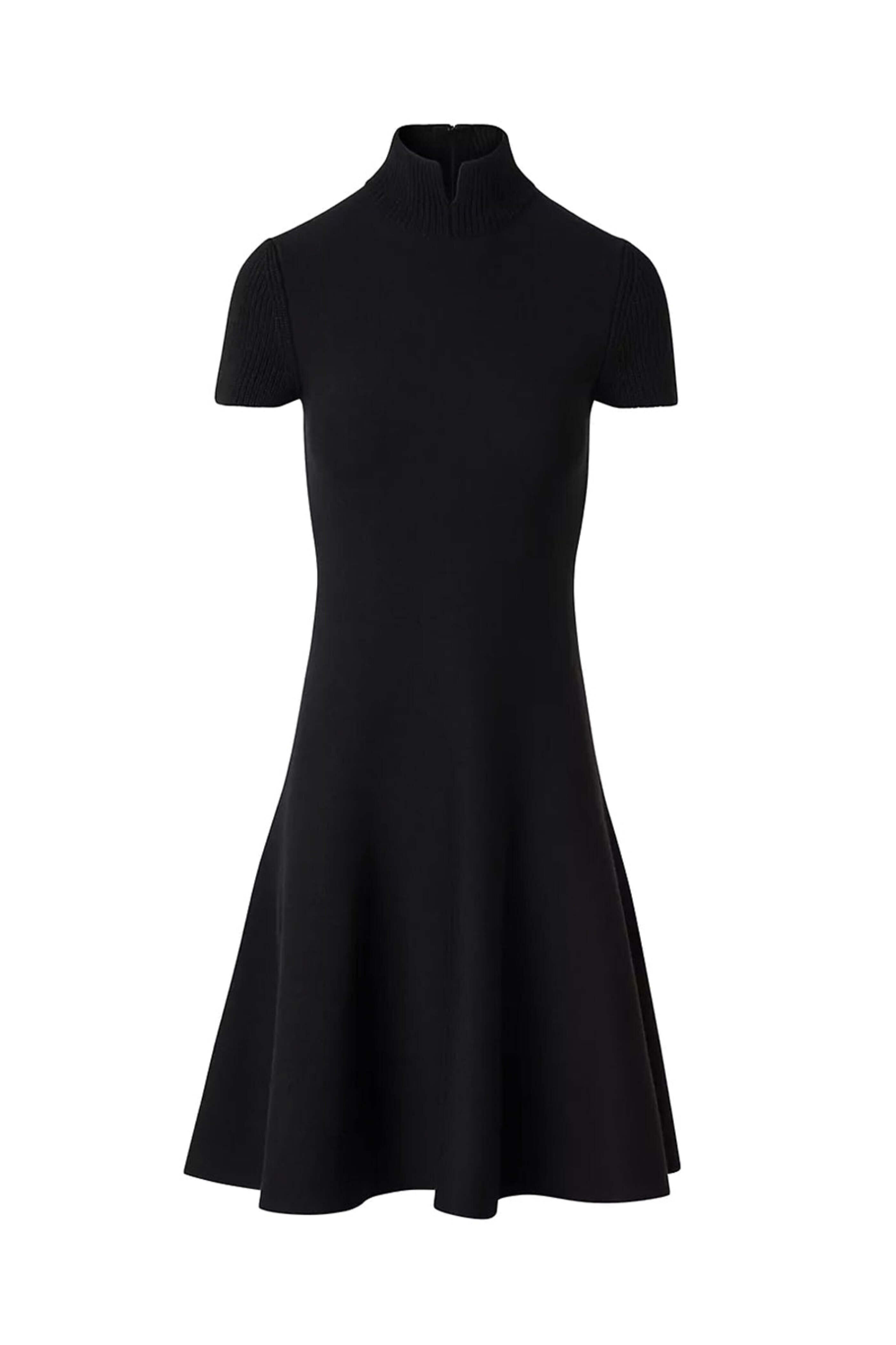 Akris Punto Black Knit Short Sleeve Dress. Split mockneck. Short sleeves. Concealed back zip closure. Fit and flare silhouette. Mini length. Knit fabrication. 95% virgin wool, 5% elastane.