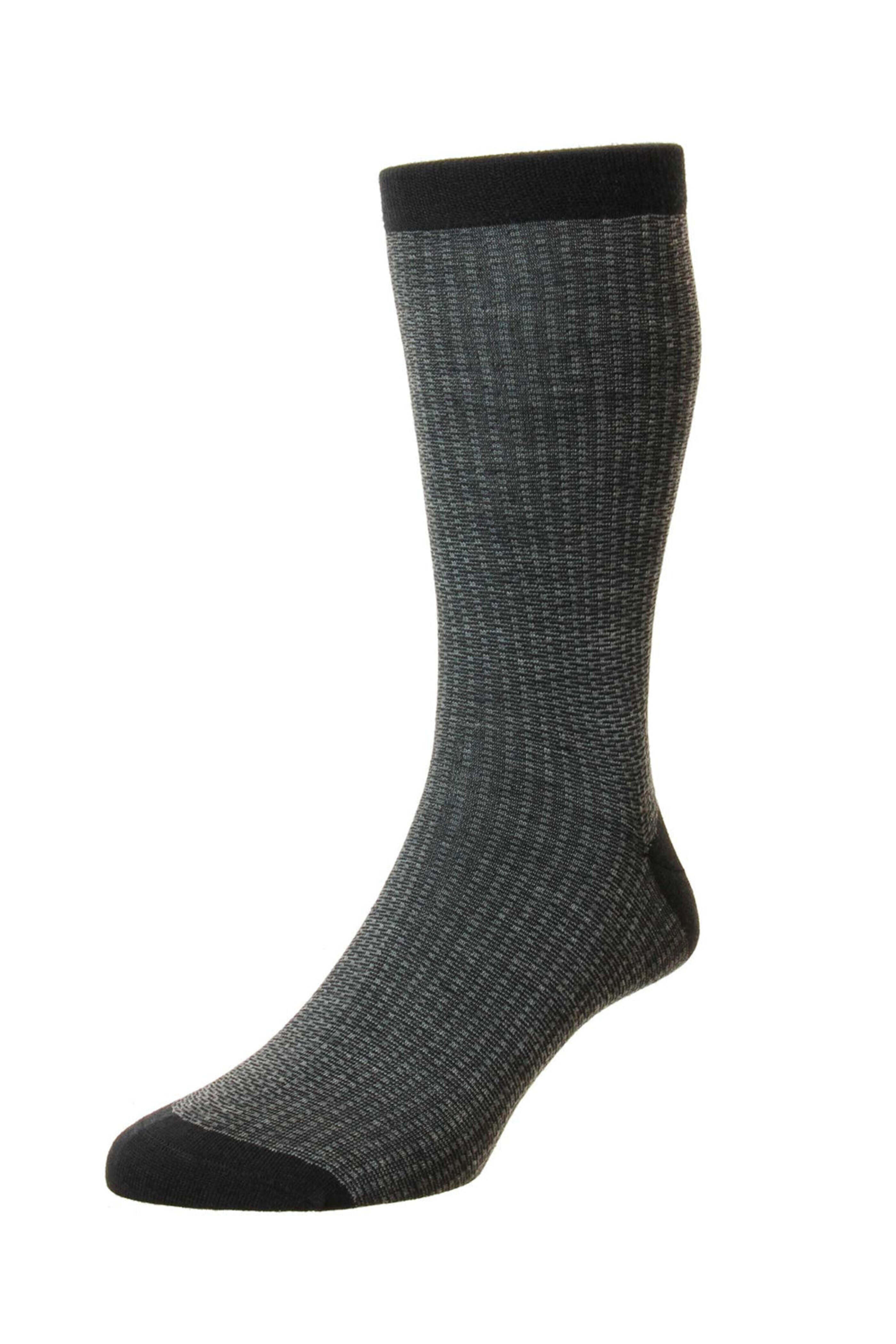 - Pantherella Black Jervis Midcalf Sock Vintage collection Neat jacquard mini dots with stripes Long anklet Seamless toe One size fits most Superfine Merino wool Made in England