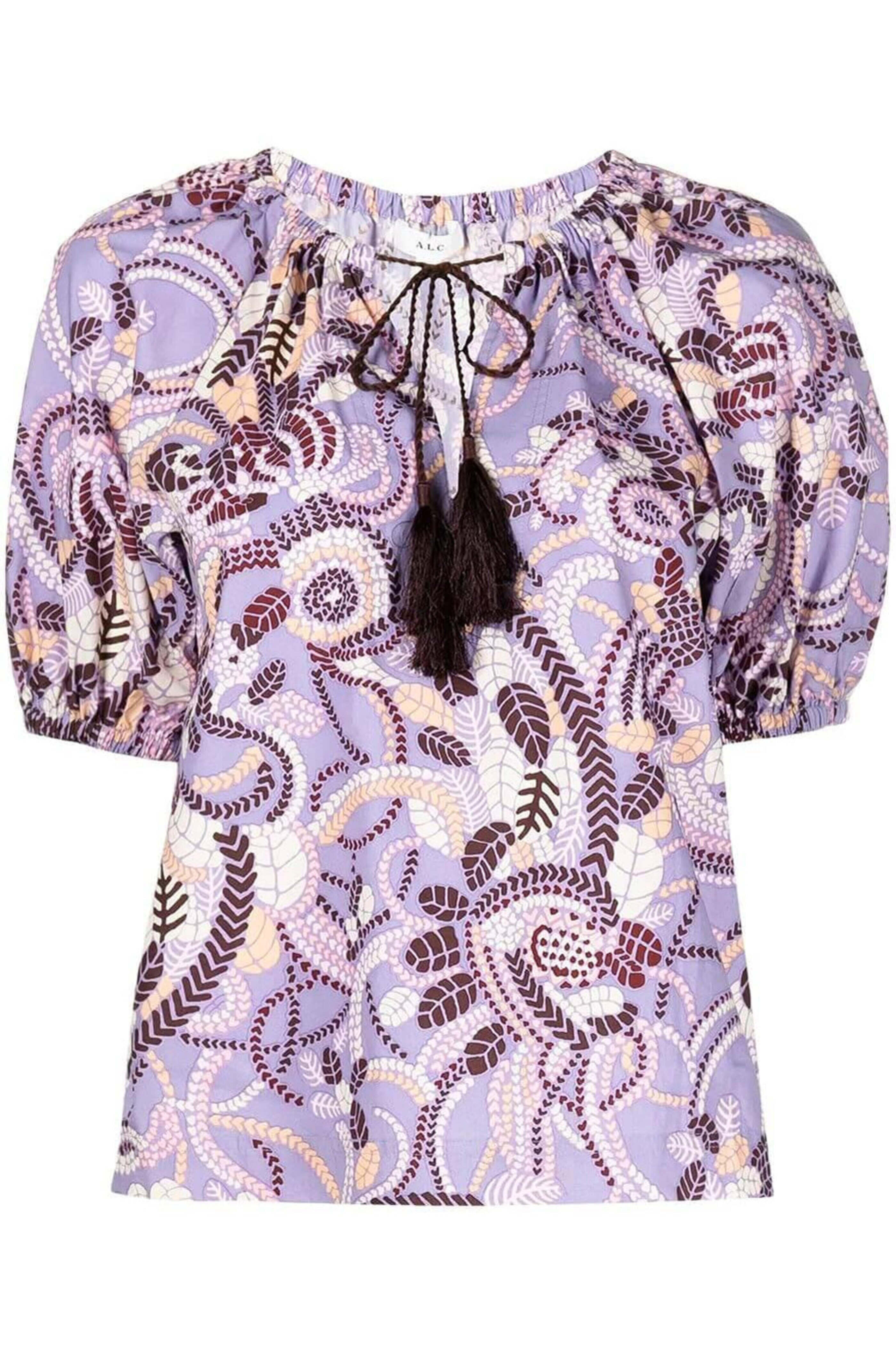 A.L.C. Lavender Print Elly Top. Split neck; self-tie tassel closure. Short raglan puff sleeves; elastic cuffs. Relaxed fit. Unlined. 100% cotton.