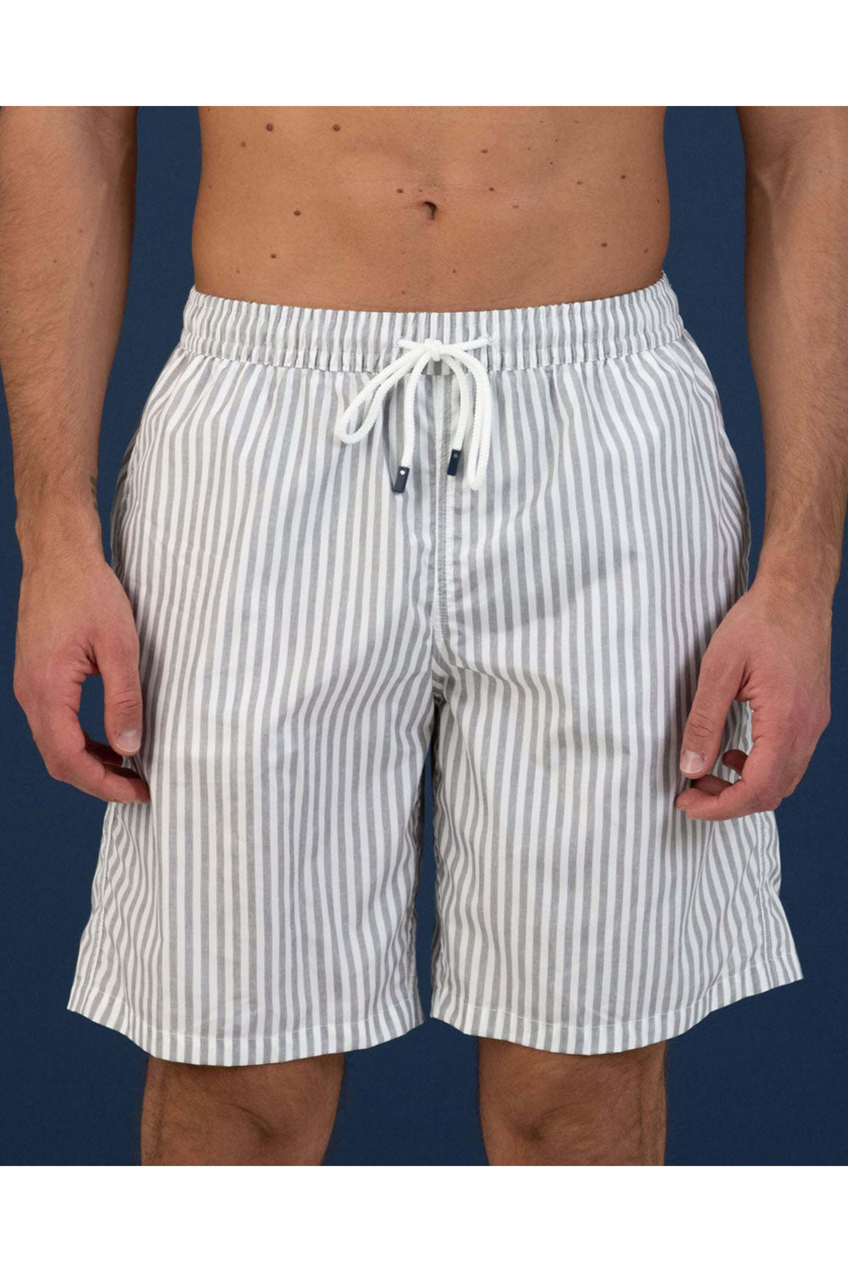 Fedeli Grey Stripe Swim Trunk. Flat front. Elastic waistband with drawstring pulls. Single back pocket. Relaxed fit. Longer cut. Microfiber fabrication. Made in Italy. 100% recycled polyester.