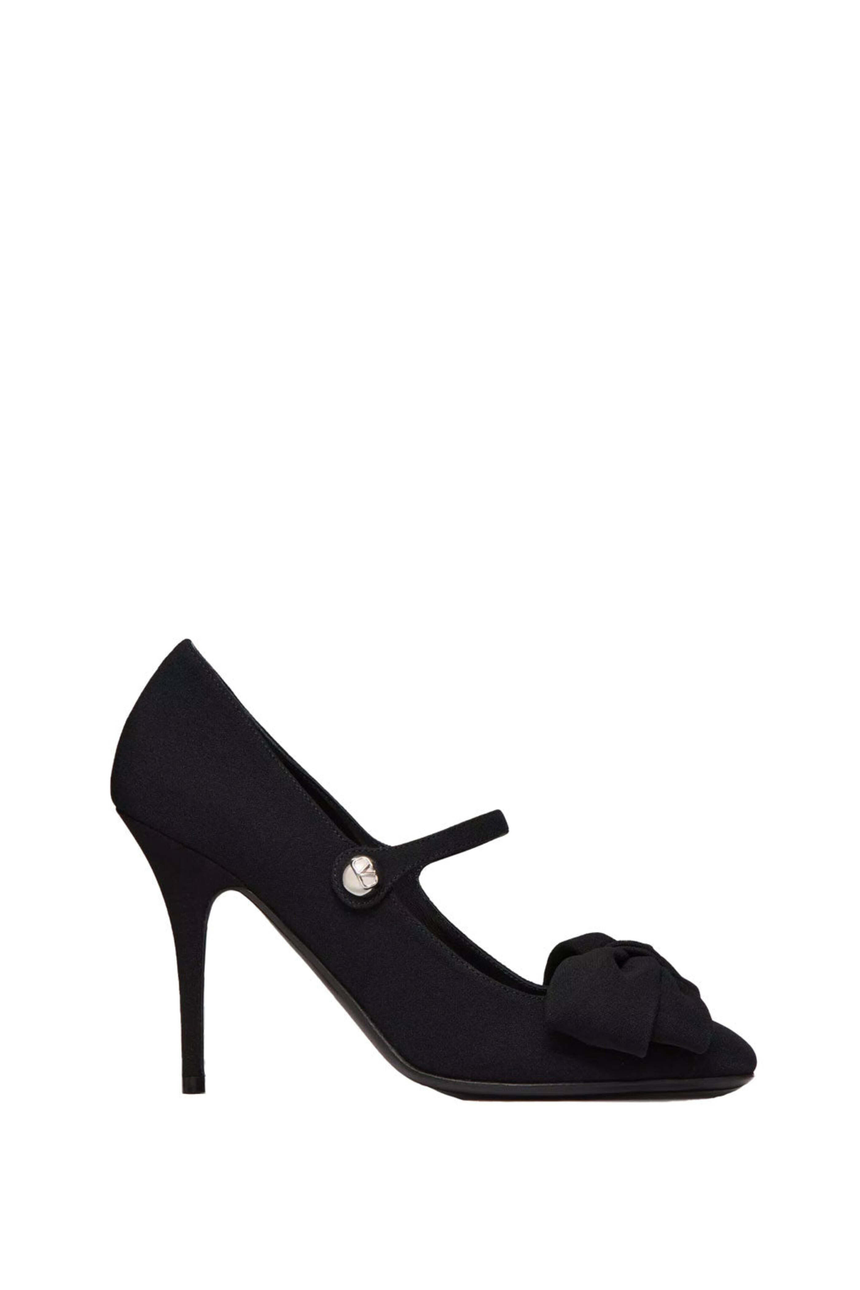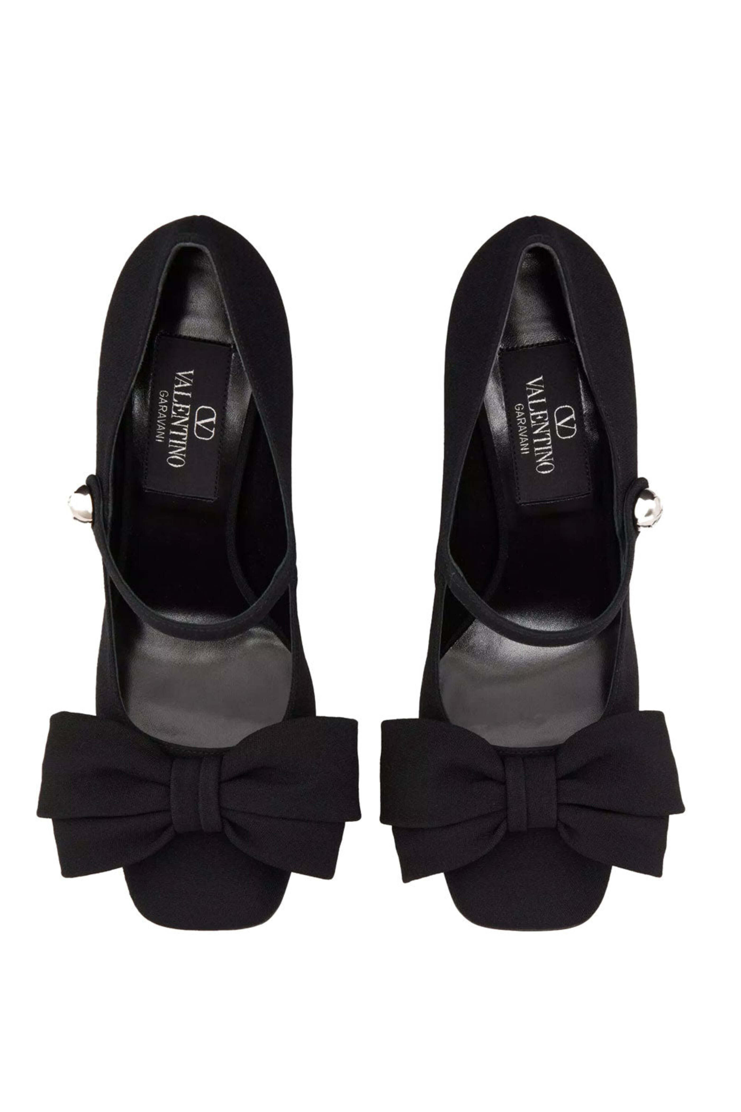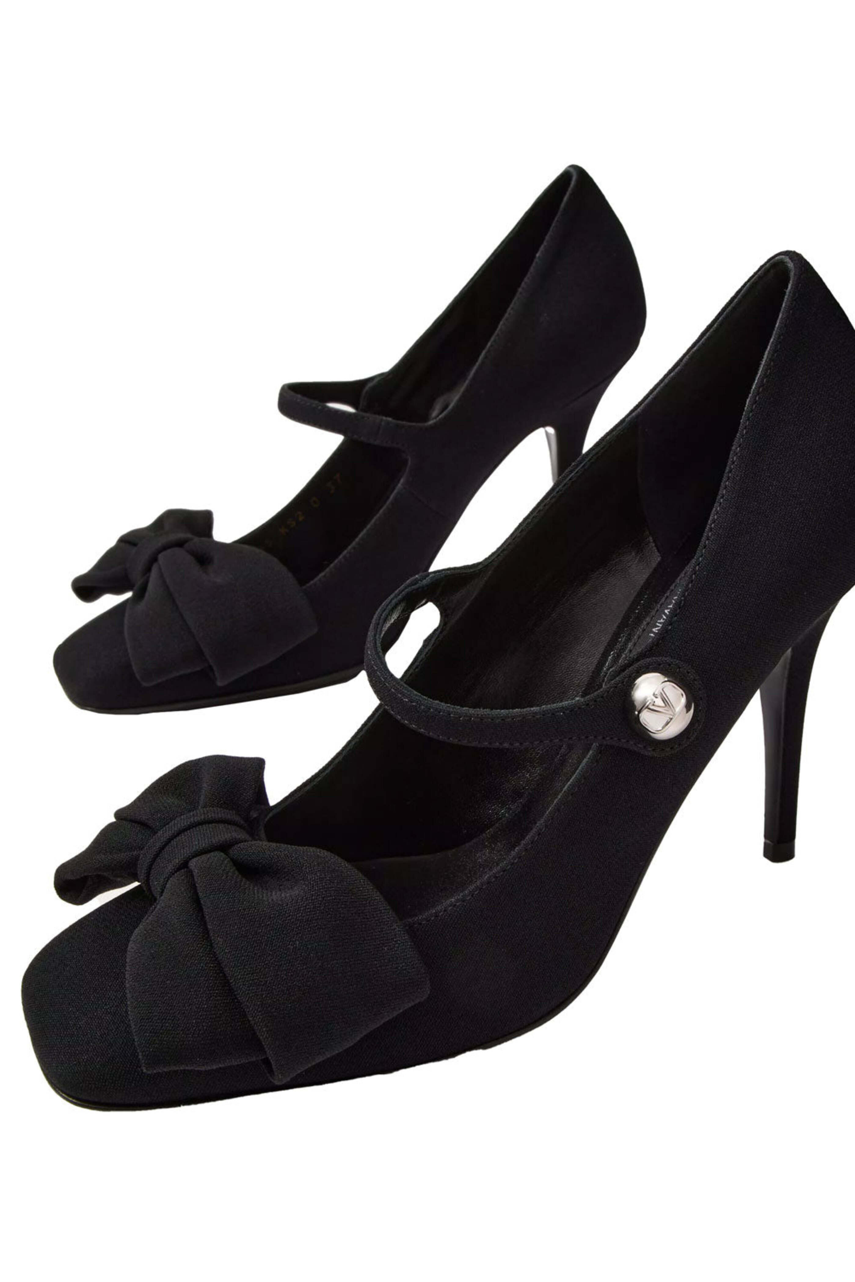 Valentino Box Jane Mary Jane Pump in Nero. Closed square toe. Slip-on style. Elastic strap. Bow detail. Custom VLogo signature decorative button. Silk upper. Leather lining and sole. 4 (100mm) stiletto heel. Made in Italy.
